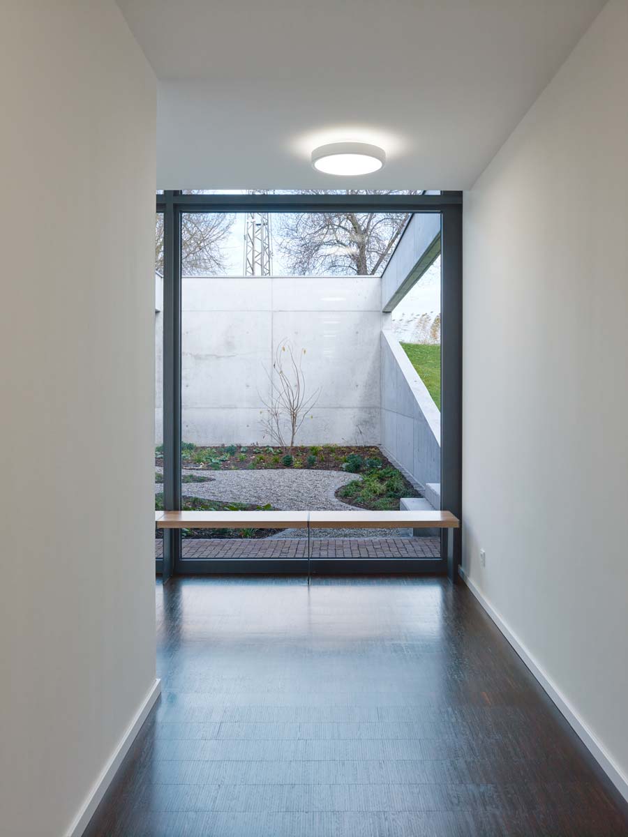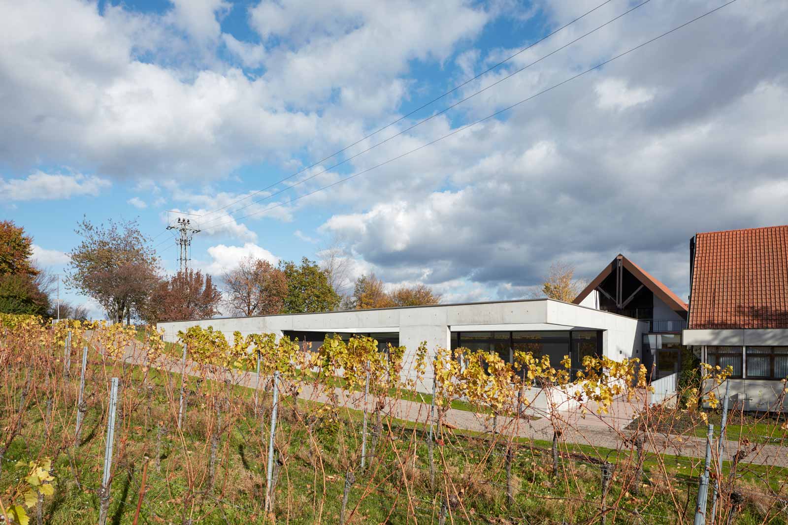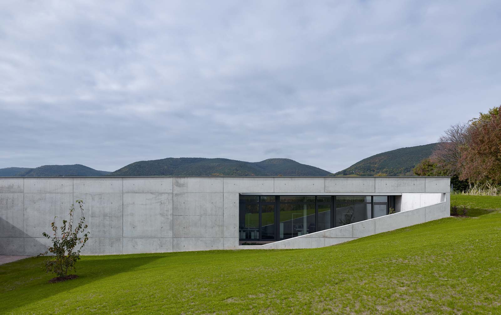 Das Haus Maikammer, ein Schulungszentrum der Berufsgenossenschaft Rohstoffe Chemie und Industrie, musste erweitert werden. Das Haus liegt in der sanft hügeligen Landschaft der Vorderpfalz in Mitten von Weinreben mit Blick auf den malerischen Haardtrand. So werden die Ausläufer des Pfälzer Waldes genannt. Das bestehende Ensemble aus Unterrichtsräumen, Hotel und Gastronomie ist in sich geschlossen und nicht auf Erweiterung angelegt. Die einzig mögliche Stelle einer für die innere Organisation sinnvollen Erweiterung ist durch einen steilen Hang geprägt. Die Lösung musste sein, das Gebäude in den Hang zu bauen, was wiederum den Vorteil hat, dass die Erweiterung im Gelände verschwindet und nicht in Konkurrenz zum Bestand tritt. Aber wie belichtet man ein Gebäude, das im Hang steckt? Es muss sich den Raum für die Belichtung selbst schaffen durch das Einschneiden von Lichthöfen in den Hang, über die die Seminarräume und Büros belichtet werden können. Die Erweiterung tritt so nicht als Gebäude in Erscheinung, sondern als Landschaftsbauwerk, das mit dem Bestand nicht konkurriert, sondern in dieser Ortsrandlage kaum wahrnehmbar ist. Es passt sich in die sanfte Hügellandschaft der Vorderpfalz ein und wird durch das begrünte Flachdach gleichsam Teil davon. Die Wahl von Beton als Material für die Außenhülle ist eine logische Konsequenz aus dem Ansatz, das Gebäude als Landschaftsbauwerk zu entwerfen, das sich in den Hang gräbt. Aus konstruktiver und abdichtungstechnischer Sicht ist Beton das sinnvollste und wirtschaftlichste Material. Der Anschluss an den Bestand erfolgt barrierefrei über einen verglasten Übergang, der wie Fuge zwischen Bestand und Erweiterung wirkt. Man verlässt den Bestand und betritt den neuen Teil also nicht unbemerkt. Der Neubau wird durch die Orientierung der Seminar- und Büroräume zu den beiden Höfen, die jeweils in entgegengesetzte Himmelsrichtungen ausgerichtet sind, ganz automatisch in zwei funktionale Zonen gegliedert: in den Seminarbereich und in den Bürobereich. Die Höfe dienen neben der Belichtung gerade bei den beiden Seminarräumen als Erweiterung nach außen im Sinne einer Freiklasse. Dabei wird der Blick auf die Landschaft durch den oberen Balken gerahmt wie bei einem Gemälde.