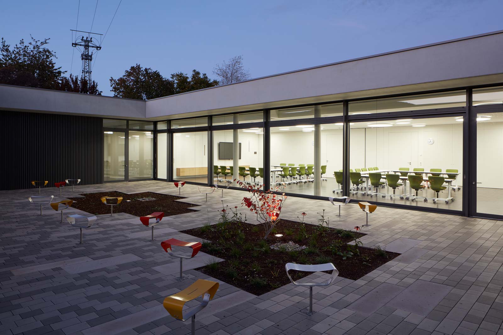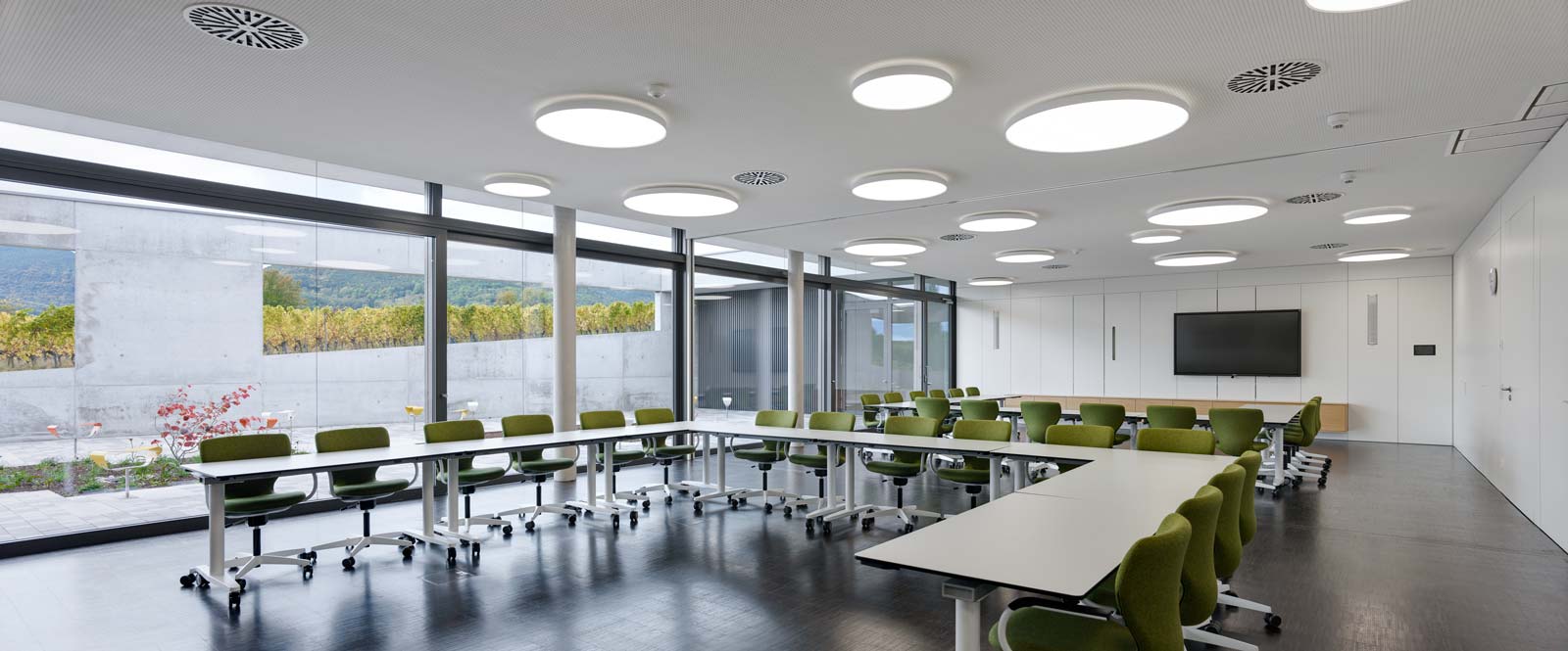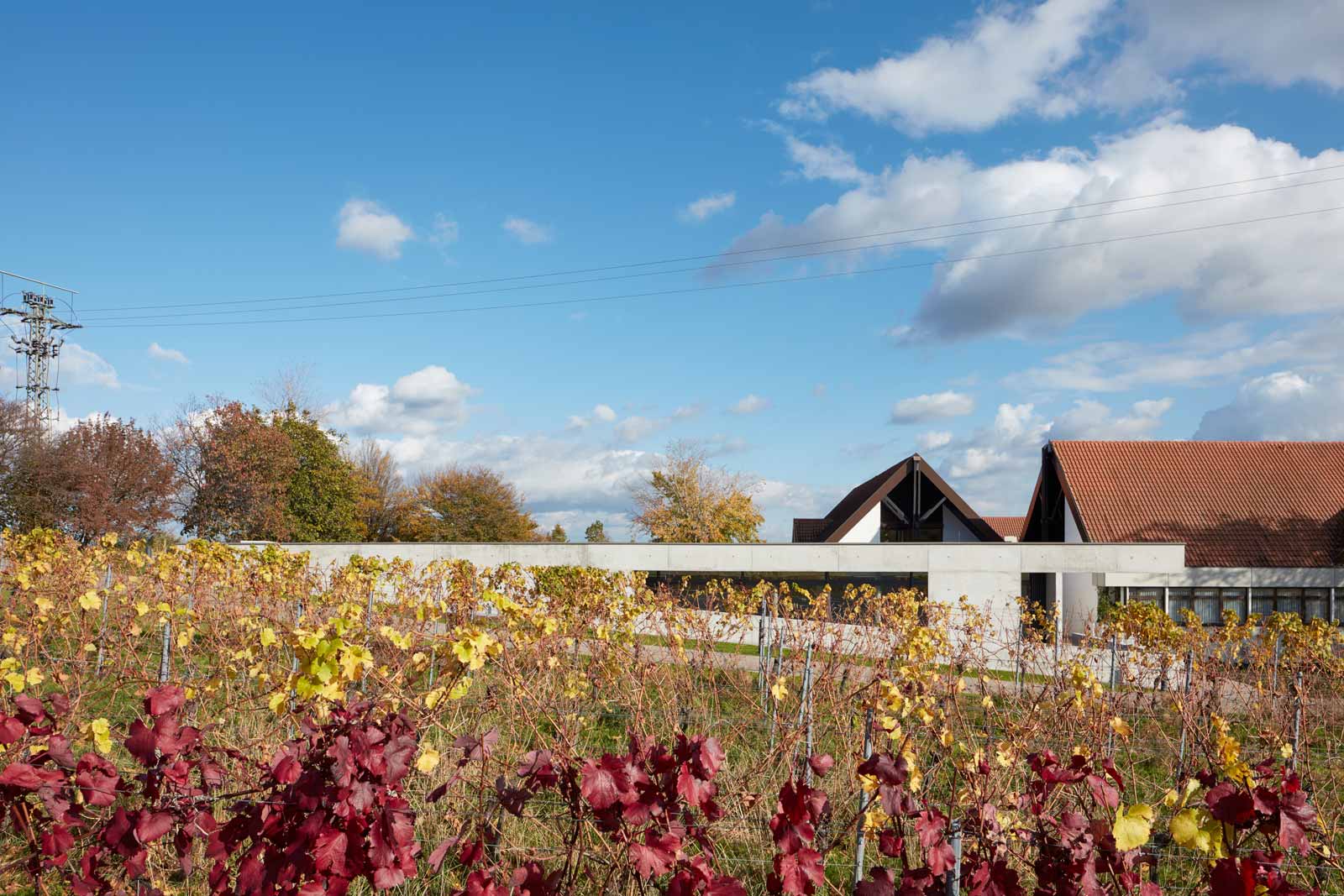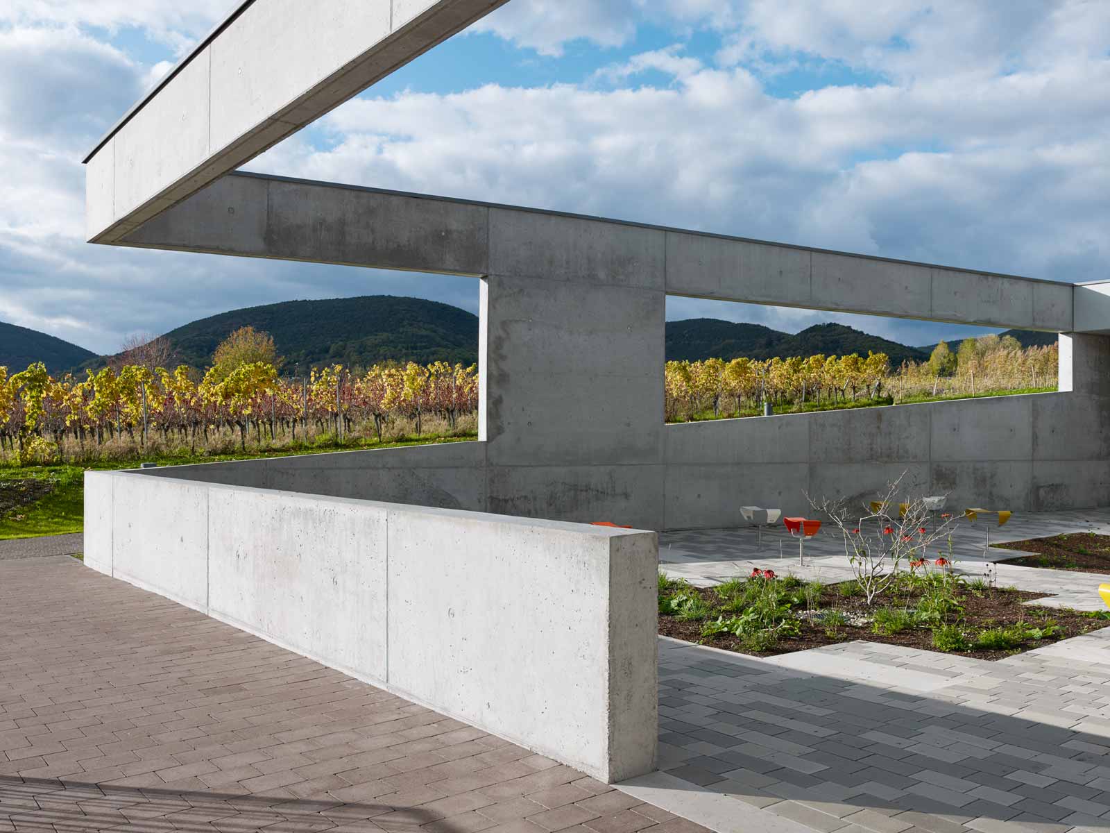 Das Haus Maikammer, ein Schulungszentrum der Berufsgenossenschaft Rohstoffe Chemie und Industrie, musste erweitert werden. Das Haus liegt in der sanft hügeligen Landschaft der Vorderpfalz in Mitten von Weinreben mit Blick auf den malerischen Haardtrand. So werden die Ausläufer des Pfälzer Waldes genannt. Das bestehende Ensemble aus Unterrichtsräumen, Hotel und Gastronomie ist in sich geschlossen und nicht auf Erweiterung angelegt. Die einzig mögliche Stelle einer für die innere Organisation sinnvollen Erweiterung ist durch einen steilen Hang geprägt. Die Lösung musste sein, das Gebäude in den Hang zu bauen, was wiederum den Vorteil hat, dass die Erweiterung im Gelände verschwindet und nicht in Konkurrenz zum Bestand tritt. Aber wie belichtet man ein Gebäude, das im Hang steckt? Es muss sich den Raum für die Belichtung selbst schaffen durch das Einschneiden von Lichthöfen in den Hang, über die die Seminarräume und Büros belichtet werden können. Die Erweiterung tritt so nicht als Gebäude in Erscheinung, sondern als Landschaftsbauwerk, das mit dem Bestand nicht konkurriert, sondern in dieser Ortsrandlage kaum wahrnehmbar ist. Es passt sich in die sanfte Hügellandschaft der Vorderpfalz ein und wird durch das begrünte Flachdach gleichsam Teil davon. Die Wahl von Beton als Material für die Außenhülle ist eine logische Konsequenz aus dem Ansatz, das Gebäude als Landschaftsbauwerk zu entwerfen, das sich in den Hang gräbt. Aus konstruktiver und abdichtungstechnischer Sicht ist Beton das sinnvollste und wirtschaftlichste Material. Der Anschluss an den Bestand erfolgt barrierefrei über einen verglasten Übergang, der wie Fuge zwischen Bestand und Erweiterung wirkt. Man verlässt den Bestand und betritt den neuen Teil also nicht unbemerkt. Der Neubau wird durch die Orientierung der Seminar- und Büroräume zu den beiden Höfen, die jeweils in entgegengesetzte Himmelsrichtungen ausgerichtet sind, ganz automatisch in zwei funktionale Zonen gegliedert: in den Seminarbereich und in den Bürobereich. Die Höfe dienen neben der Belichtung gerade bei den beiden Seminarräumen als Erweiterung nach außen im Sinne einer Freiklasse. Dabei wird der Blick auf die Landschaft durch den oberen Balken gerahmt wie bei einem Gemälde.