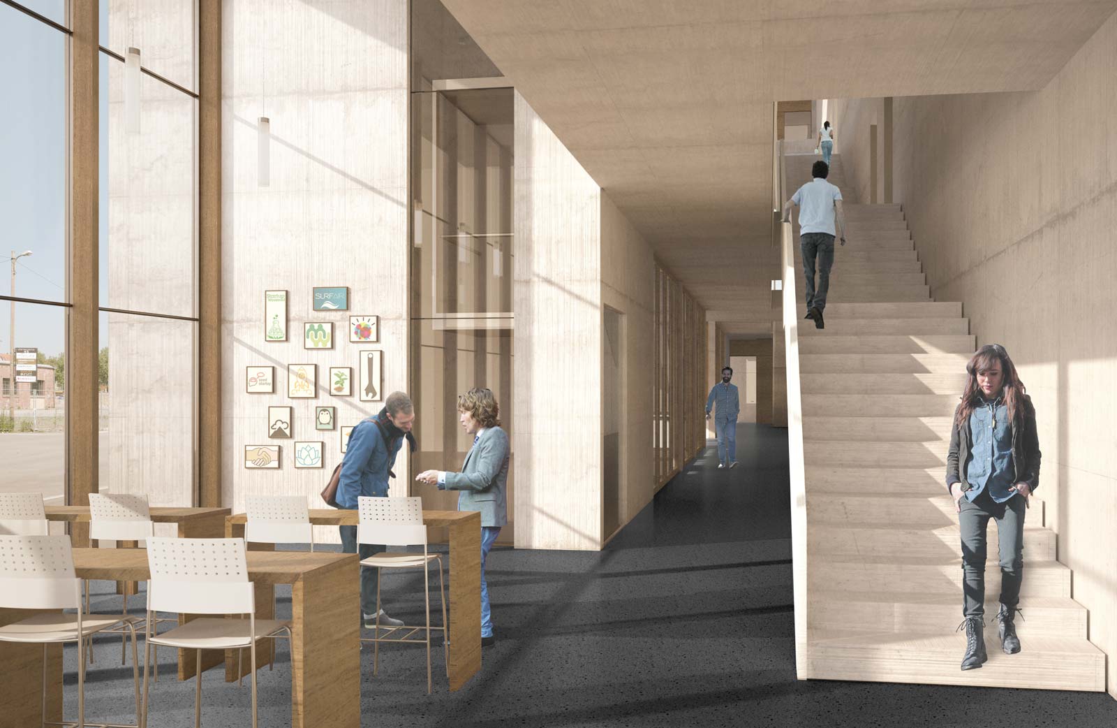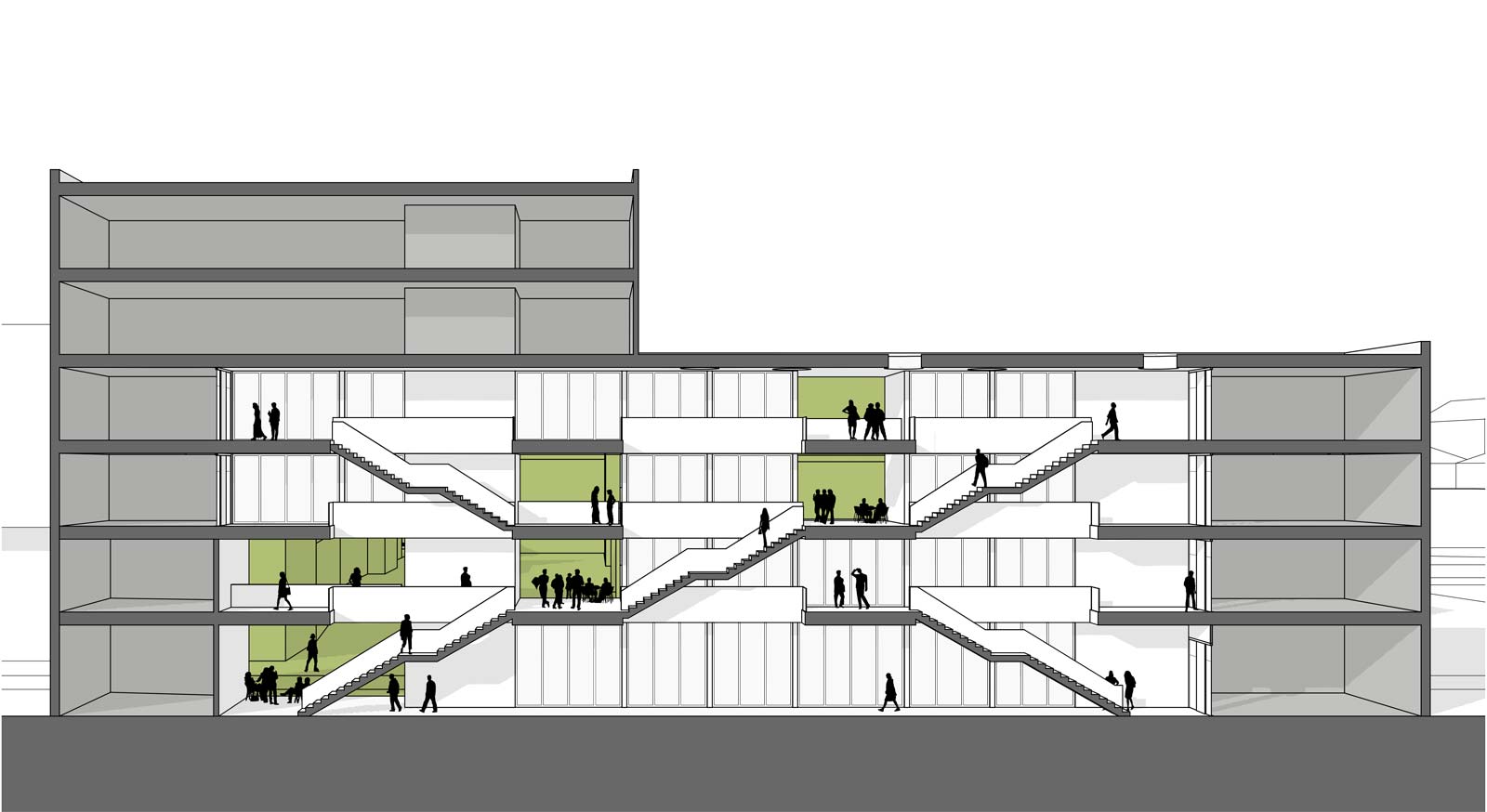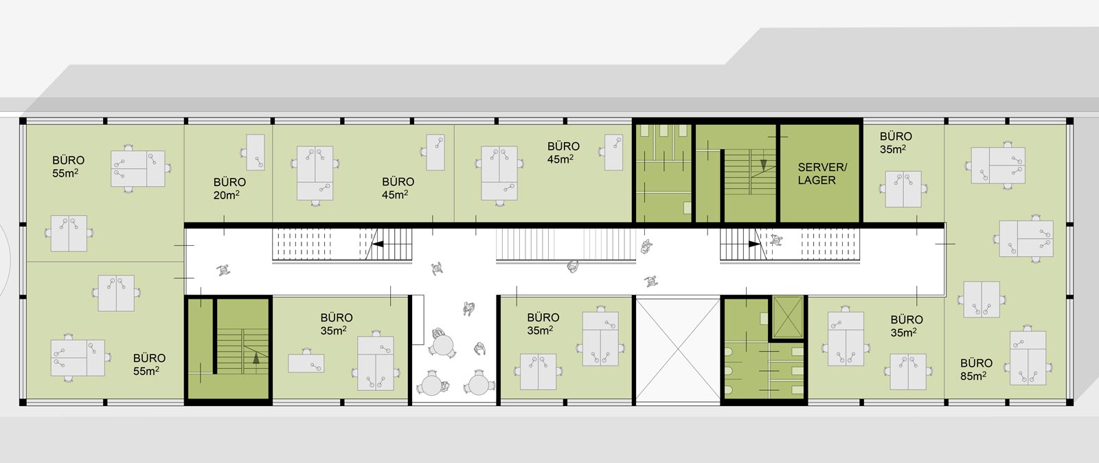 Ein intelligentes Erschließungskonzept sorgt für offene und geschlossene Arbeitsbereiche wie für große und kleine Einheiten, der Kommunikation soll Raum geboten werden. Im Zentrum steht dabei die offene „Himmelstreppe", die alle Geschosse miteinander verbindet. Sie sorgt dafür, dass die Einheiten nicht nur horizontal durch Flure, sondern auch vertikal durch Lufträume miteinander kommunikativ verknüpft werden.