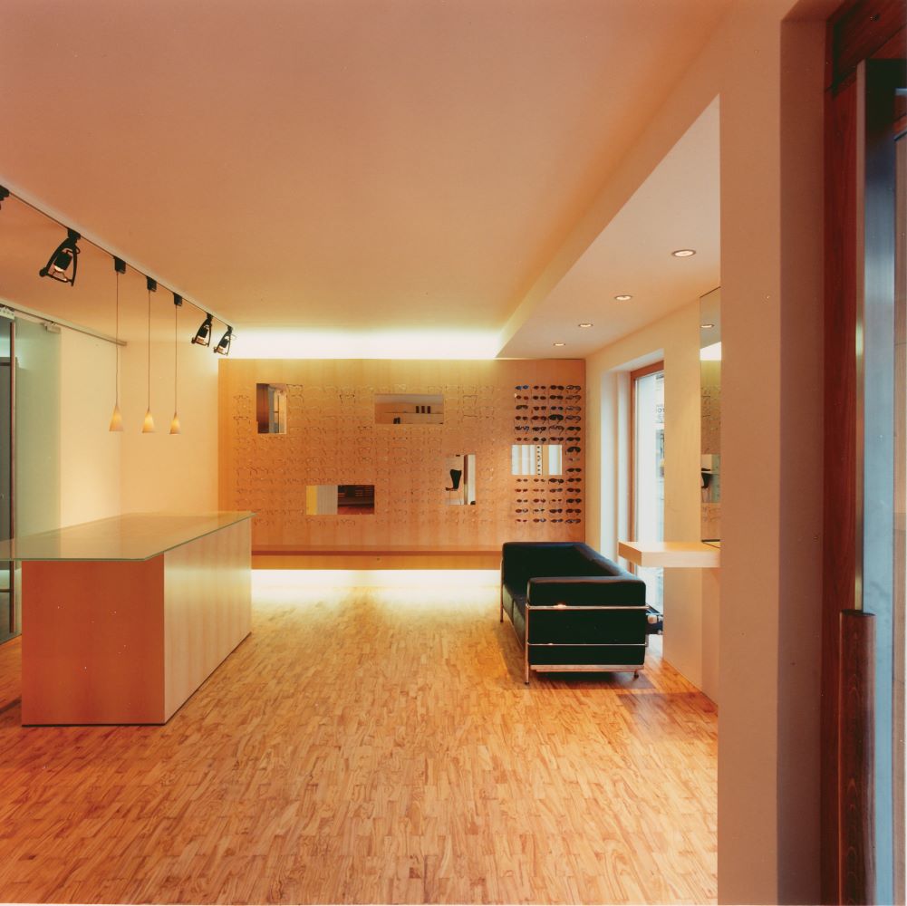 Die Umgestaltung des vordem zweigeteilten Ladens im Erdgeschoß folgte dem Wunsch, klare, überschaubare Raumsituationen zu schaffen. Die trennende Wand wurde herausgenommen, die Schaufensterfront durch ein drittes, gleich großes Schaufenster geklärt, Verkaufs- und Werkstattbereich deutlich unterschieden. Der Kunde betritt nunmehr einen längsrechteckigen Raum, der nur an den Stirnseiten die zu verkaufende Ware präsentiert, ansonsten jedoch leer ist. Auch die Schaufenster präsentieren keine Brillen, sondern lediglich den dahinterliegenden Verkaufsraum. Das Betreten des Geschäftes wird zu einer Schule des Sehens, der Wahrnehmung: nicht das Produkt spielt die wichtigste Rolle, sondern die Beratung durch den Fachmann, denn hierin unterscheidet sich der Verkauf von Brillen von dem Erwerb beispielsweise einer Uhr.