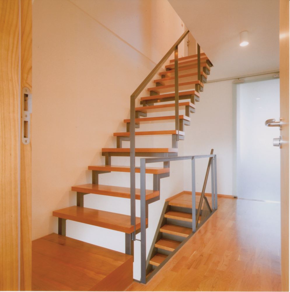 Während die Zugangstreppe zur Wohnung lediglich umgearbeitet wurde, konnte die anschließende Treppe ins Dachgeschoß nicht erhalten werden. Sie wurde durch eine Stahltreppe mit Kirschholzstufen ersetzt. Ein kleines Duschbad liegt auf Wohnraumniveau, das große Bad dagegen befindet sich zusammen mit den Schlafräumen unterm Dach.