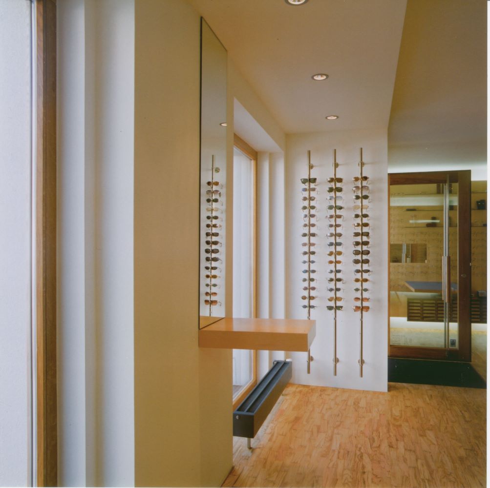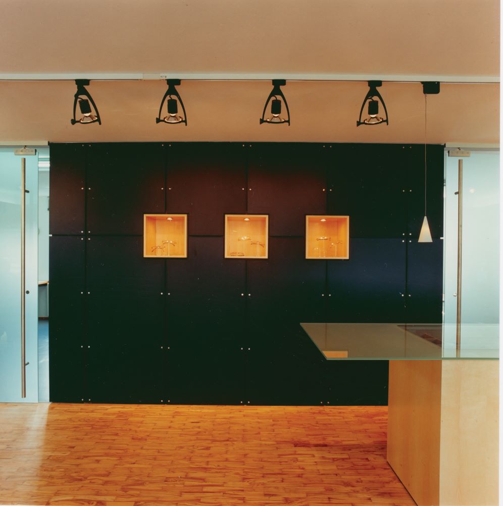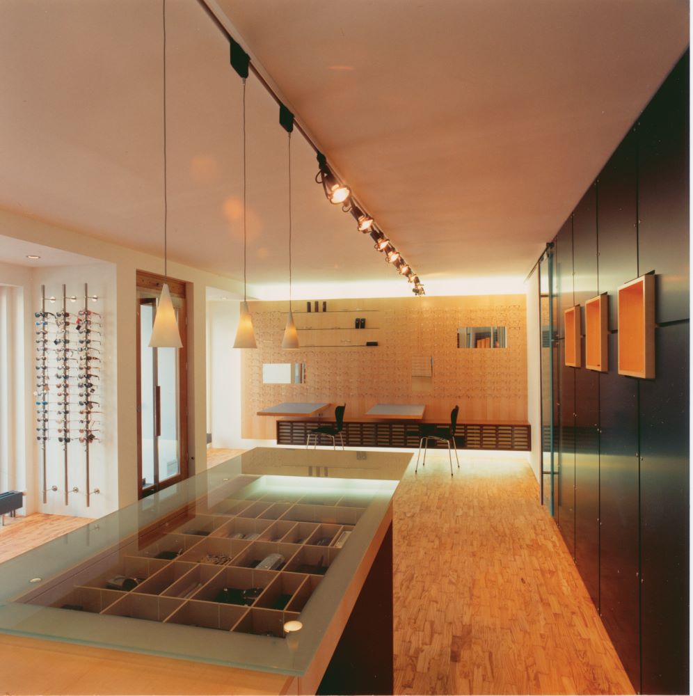 Eine dem Eingang gegenüberliegende schwarze Vitrine markiert die Trennung von Werkstatt bzw. Büro und Verkaufsraum und führt zugleich den Besucher zur schlichten Theke aus einem Ahornkorpus mit Glasplatte, unter der eine weitere Vitrine sichtbar wird. Gegenüber lädt ein Sofa den Wartenden zur Entspannung. Die angrenzende Stirnwand bildet den Freiwahlbereich, unterbrochen von Spiegeln verschiedener Größe und Höhe und bestückt mit einem ausziehbaren Etuimagazin. Der Bereich jenseits des Eingangs dient den beiden Beratungsplätzen und ist ähnlich gestaltet, jedoch mit einem Brillenmagazin in Form eines kragenden Glasregals ausgestattet. Beide Stirnwände scheinen durch indirekte Beleuchtung vor den eigentlichen, räumlich wirksamen Umfassungsmauern zu schweben.
