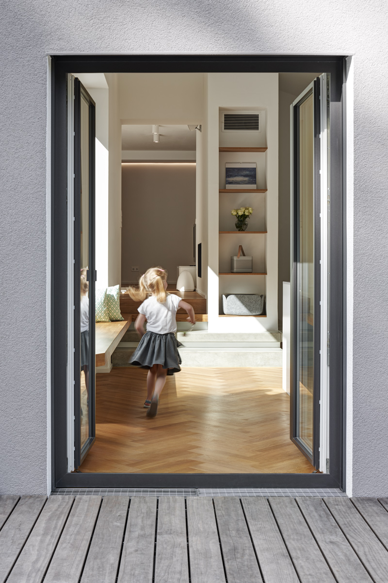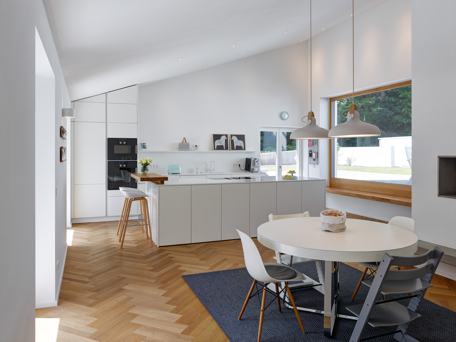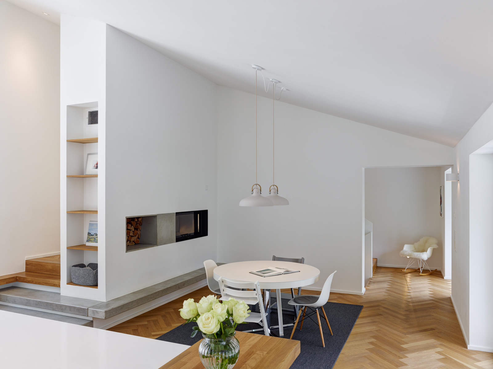 Gelungen ist dies durch die Konzentration auf die räumlichen Qualitäten der öffentlichen und die funktionale Neuordnung der privaten Bereiche des Hauses. Das Ergebnis lässt, bei insgesamt geringen Eingriffen in die Substanz, kaum erahnen, dass man sich in einem sechzig Jahre alten Haus befindet.