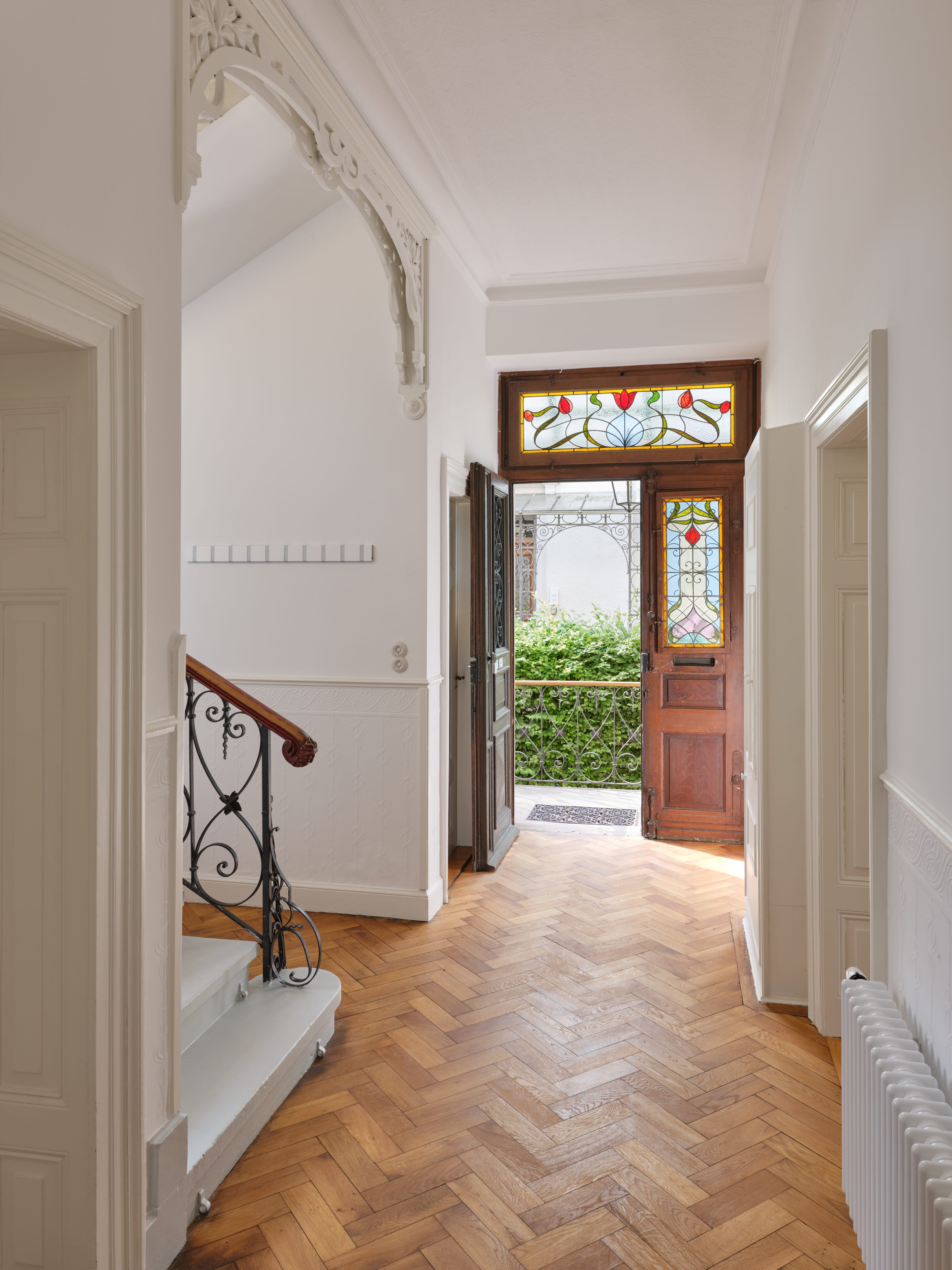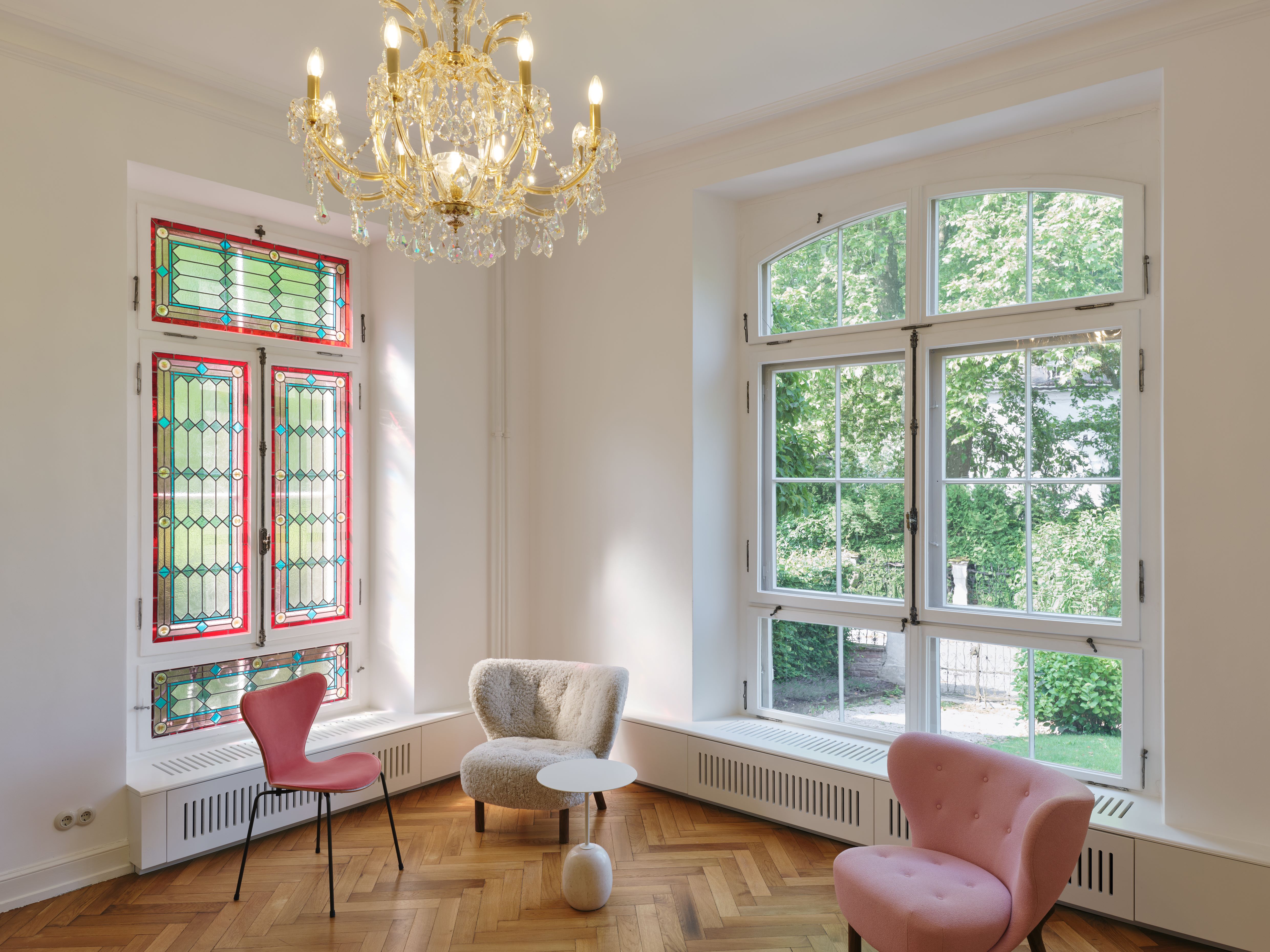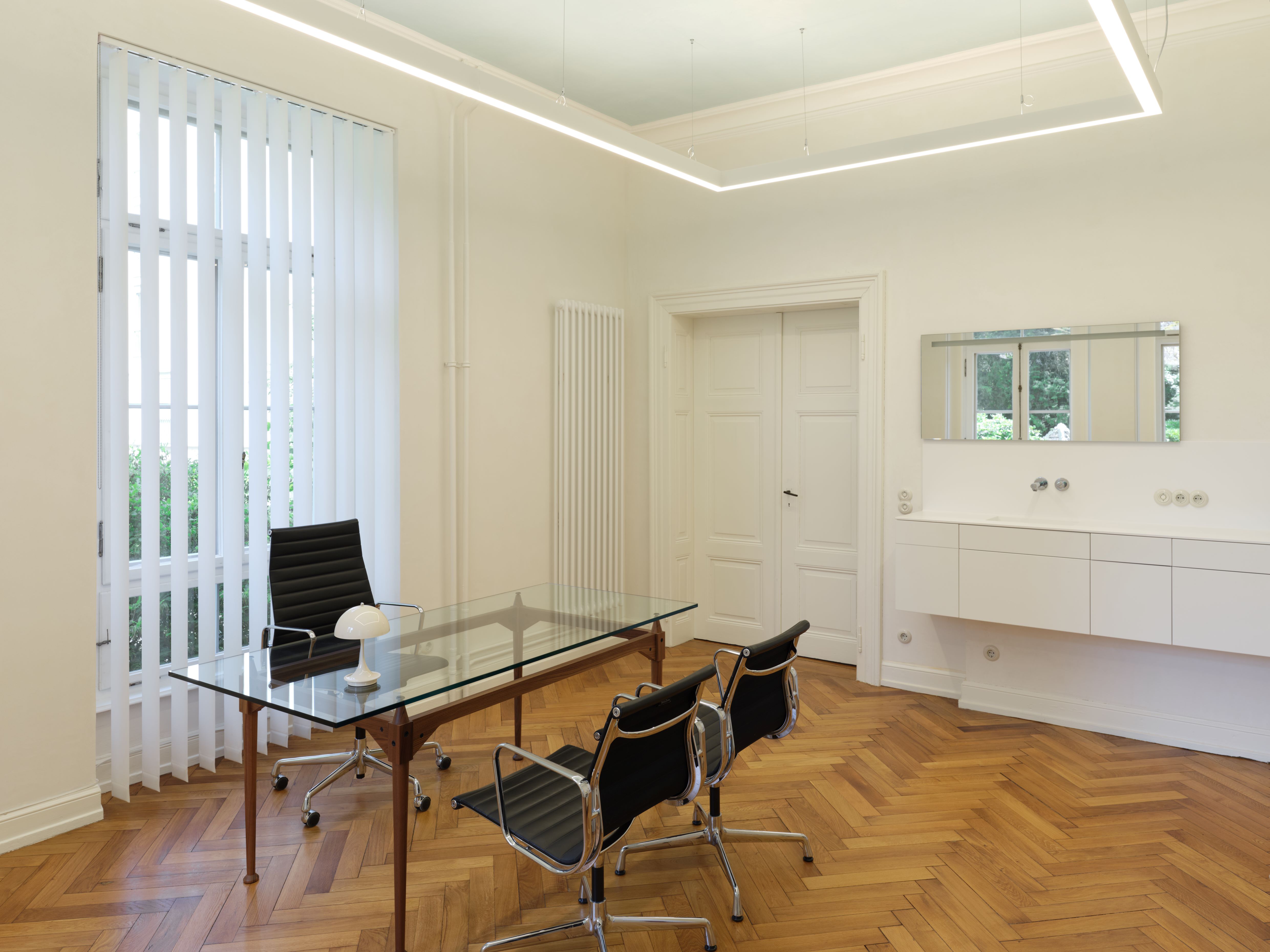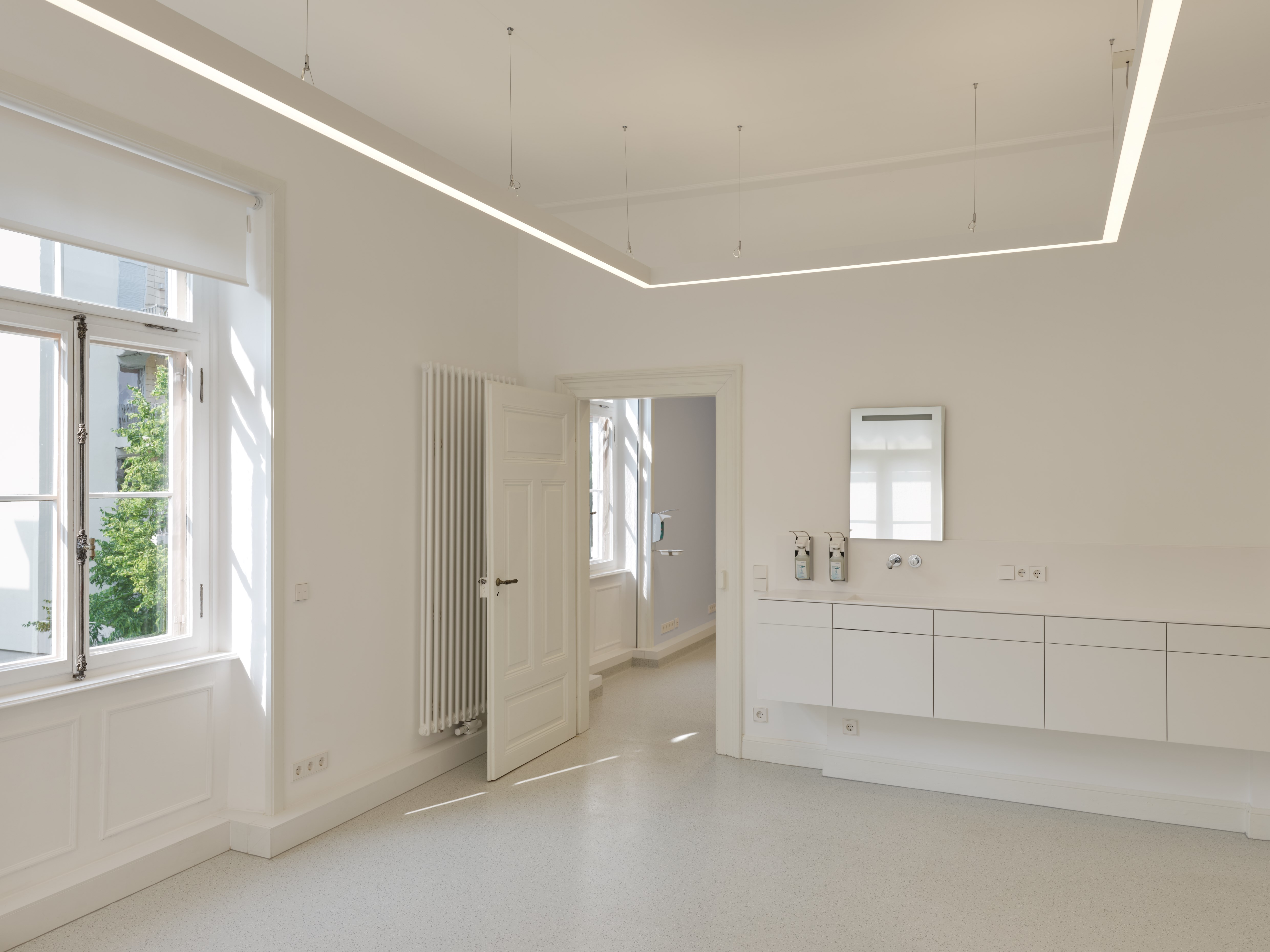 Die freistehende Villa aus dem Ende des 19. Jahrhunderts besticht durch ihre gute Bausubstanz und die hervorragende Lage am Kurpark der Bäderstadt. Der Umbau zu einer Tagesklinik für plastische Chirurgie brachte die Notwendigkeit mit sich, die vielfältigen arbeitsspezifischen und hygienischen Anforderungen in Einklang zu bringen mit den Zielen der Denkmalpflege; am wichtigsten war uns aber, den atmosphärischen Charakter der ehrwürdigen Villa so weitgehend wie möglich zu erhalten.