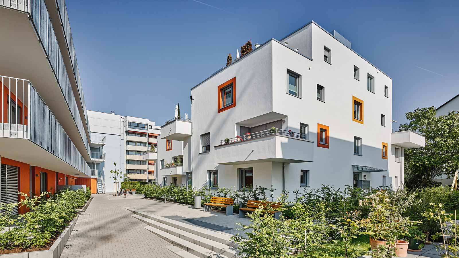 Die Ost-West-orientierten Gartenhäuser sind mit je sieben Wohneinheiten überschaubar; alle Wohnungen sind barrierefrei zugänglich. Die Erschließungsform lässt auch andere Wohnformen bzw. das Einfügen einer weiteren Kleinwohnung zu. Durch den Freiraumbezug der großen Balkonflächen, deren Anordnung eine optimale Belichtung der Grundrisse ermöglicht, haben die durchgehend dreiseitig ausgerichteten Wohnungen einen hohen Wohnwert.