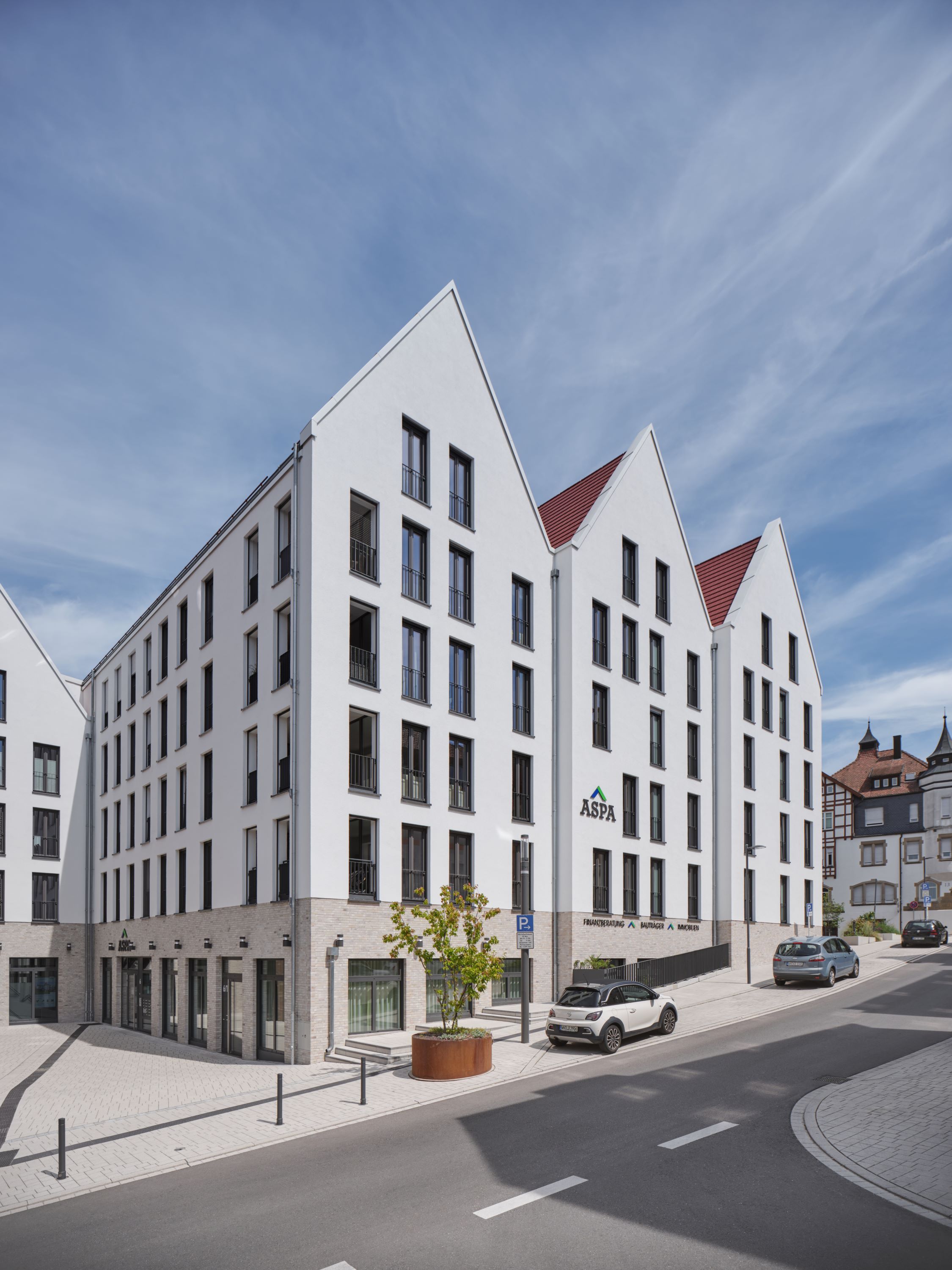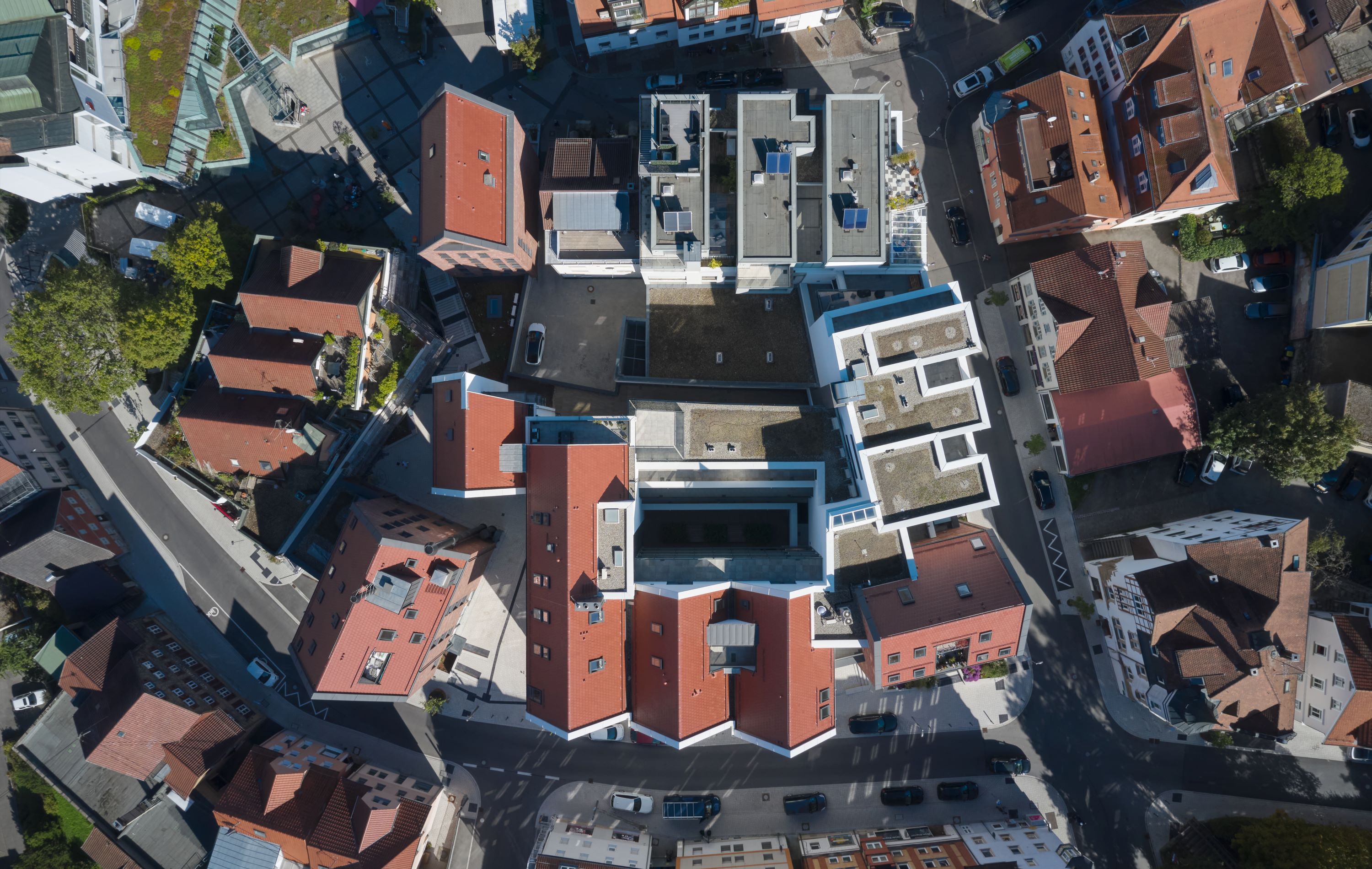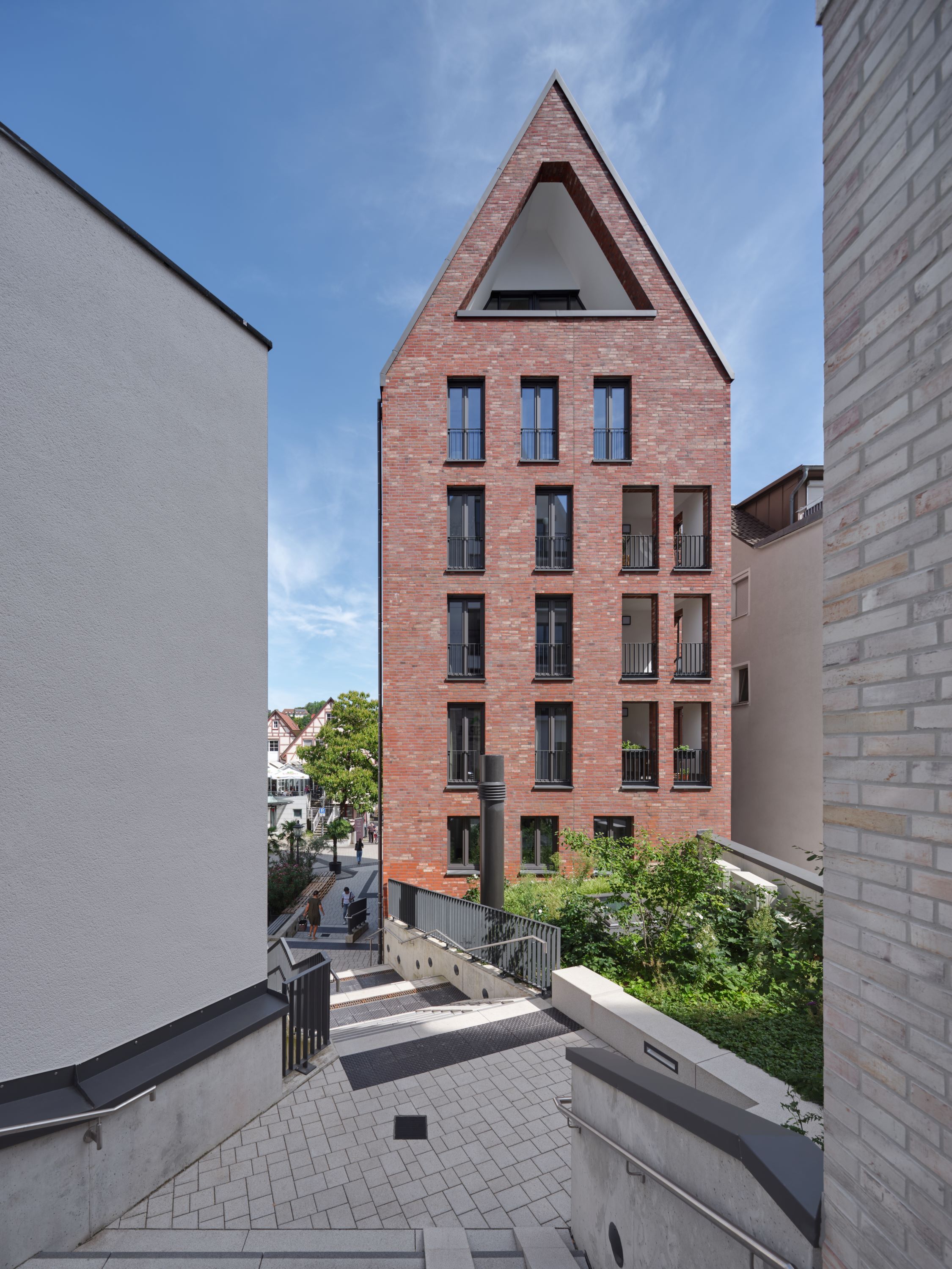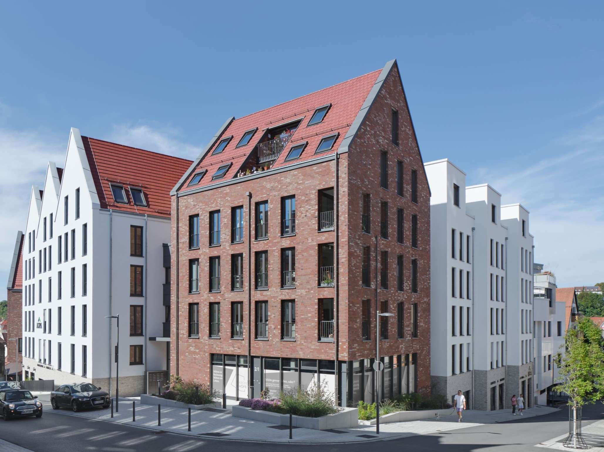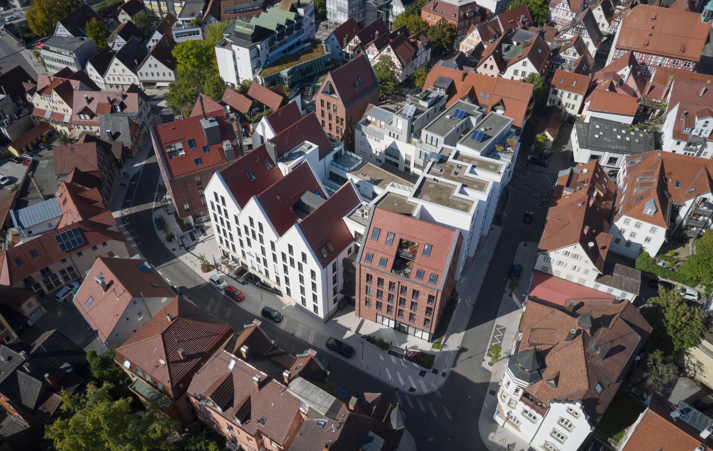Der dem Entwurf zugrundeliegende Modul, das einzelne, archetypisch ausformulierte Stadthaus, wird in der Addition zu einem übergreifenden System, das trotz zusammenhängender Flächen und damit optimierter Erschließungen die Körnung und Kleingliedrigkeit der Altstadt aufnimmt und fortführt. Dieser Modul wird an drei Stellen zu charakteristischen, weitgehend freistehenden, signethaften Gebäuden ausformuliert. Während die strukturhafte Bebauung aus weiß verputzten Baukörpern auf einem Sockel aus Ziegelmauerwerk steht, wurden diese drei Häuser, als Quartierszugänge auf Fernwirkung berechnet, mit einer Fassade aus Ziegelmauerwerk errichtet; die hierin ablesbare Handwerklichkeit schlägt eine inhaltliche Brücke zu den Fachwerkhäusern der Altstadt.