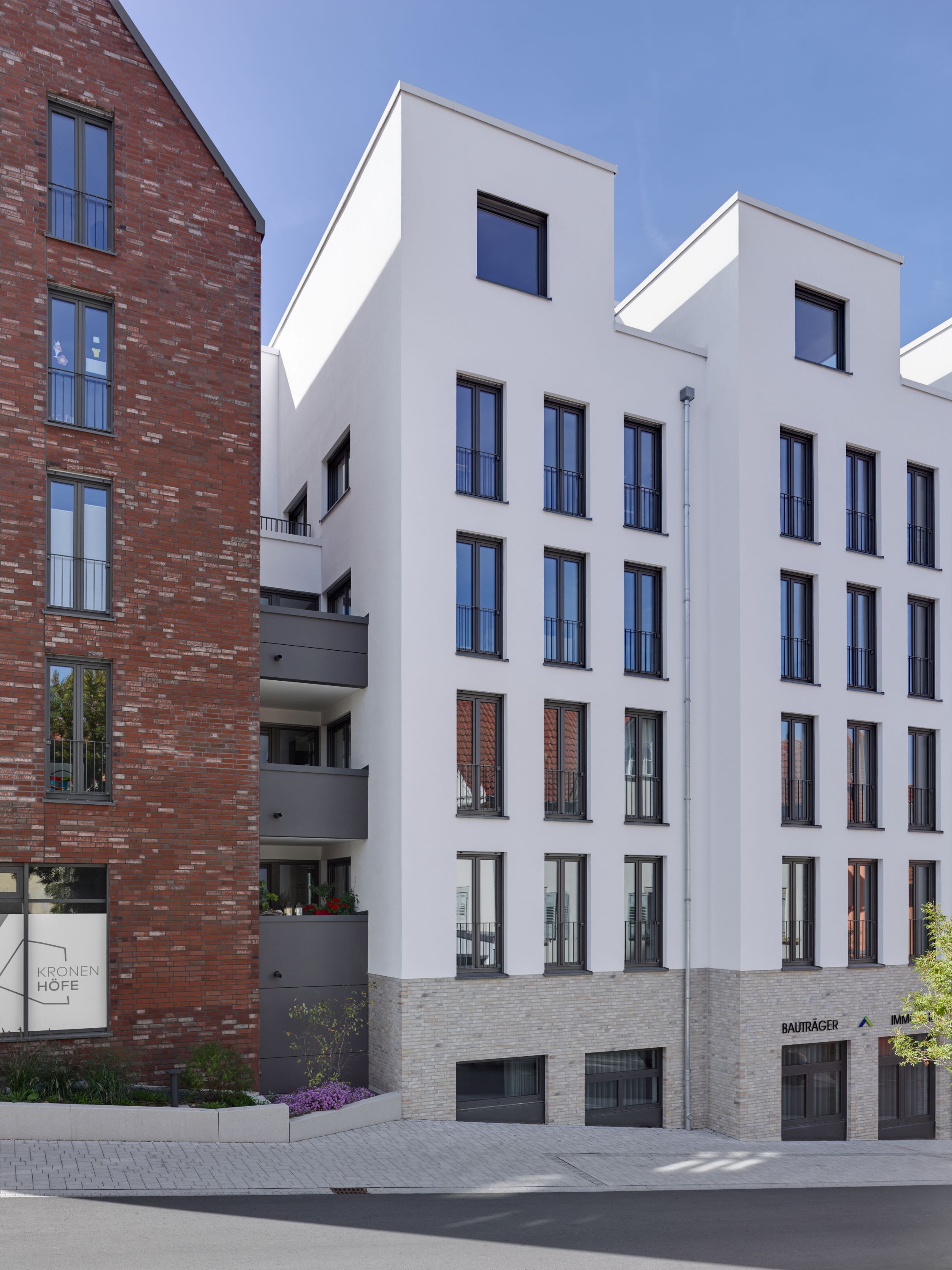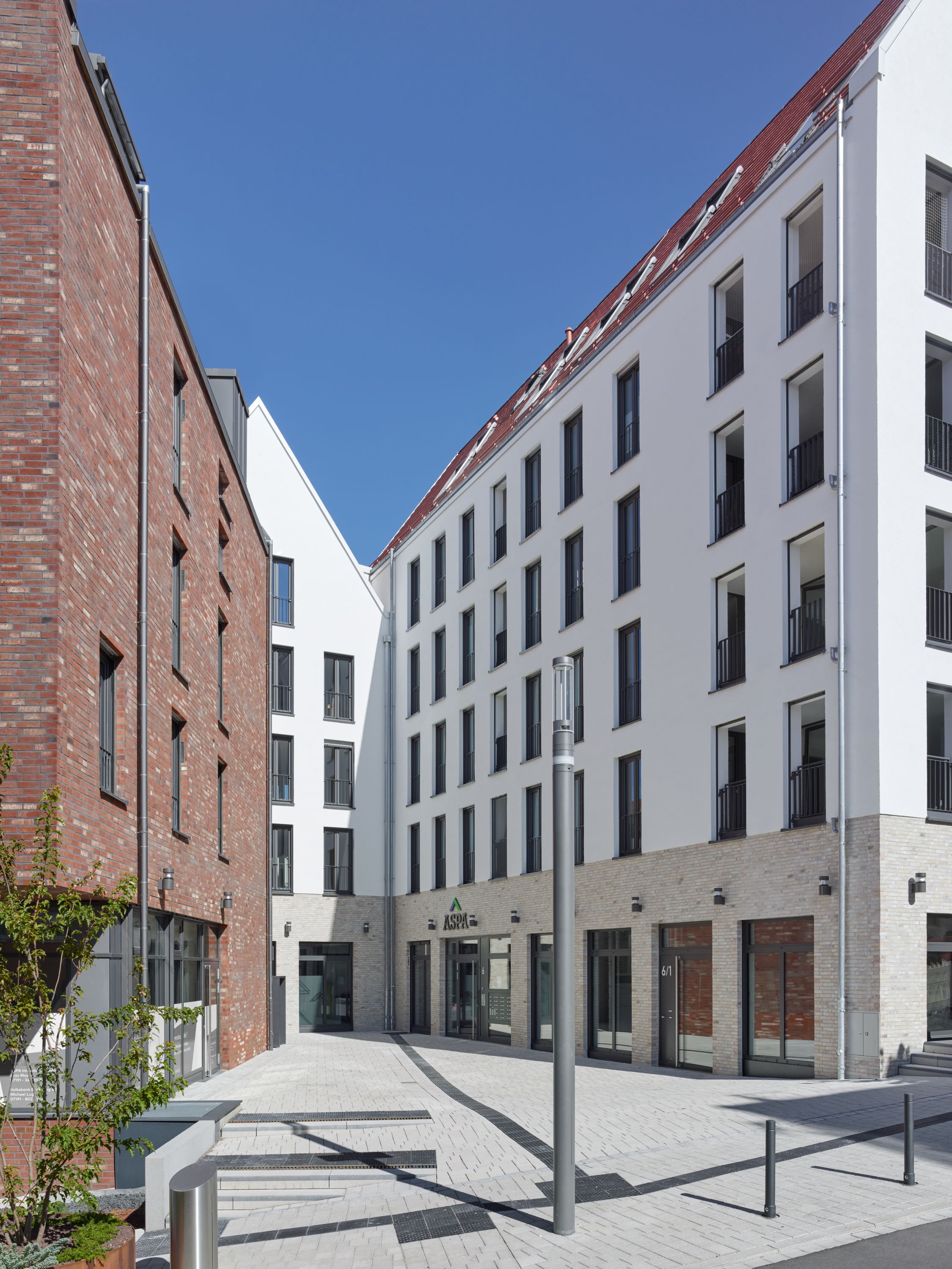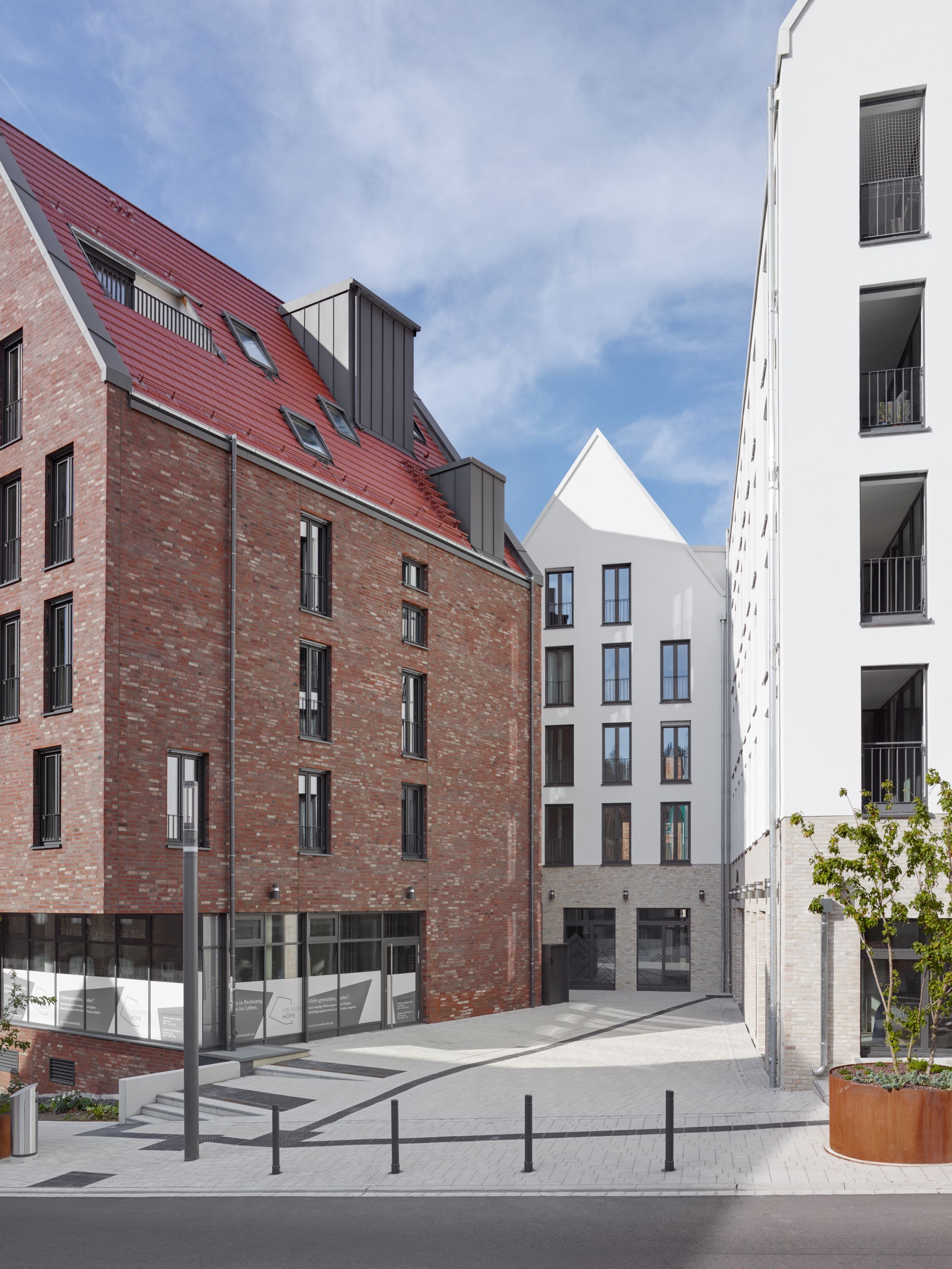 Eine feine Abstufung zwischen Öffentlichkeit und Privatheit kennzeichnet die öffentlichen Räume. Sämtliche Wohnungen verfügen über Balkone oder Loggien, trotz der Strenge der Fassaden, die dem Quartier ein einprägsames, städtisches Bild geben. Die großen, zusammenhängenden Gewerbeflächen im Erdgeschoss eignen sich sowohl zur Nutzung durch einen Hauptmieter als auch zur Aufteilung in kleinere Einheiten.