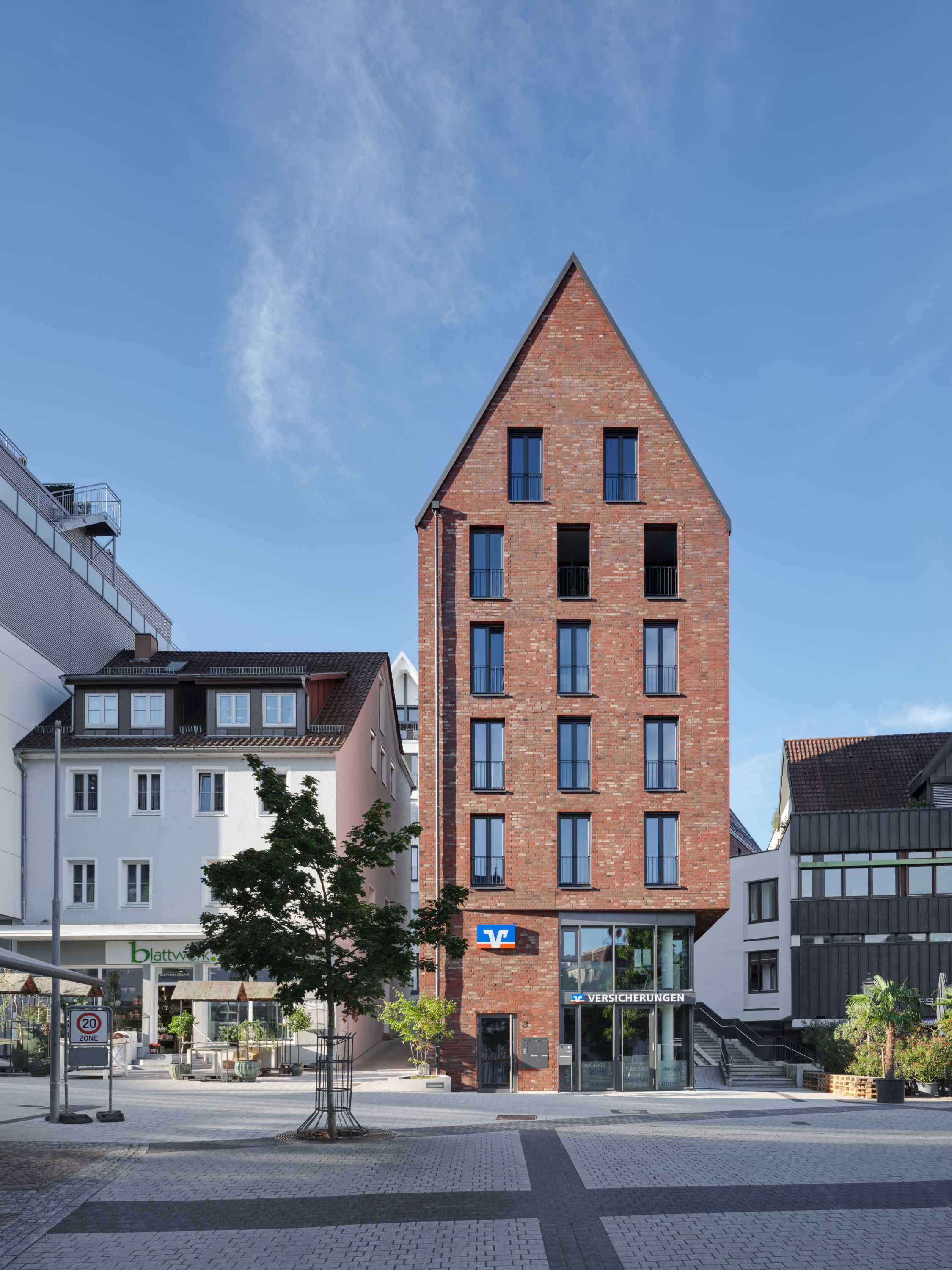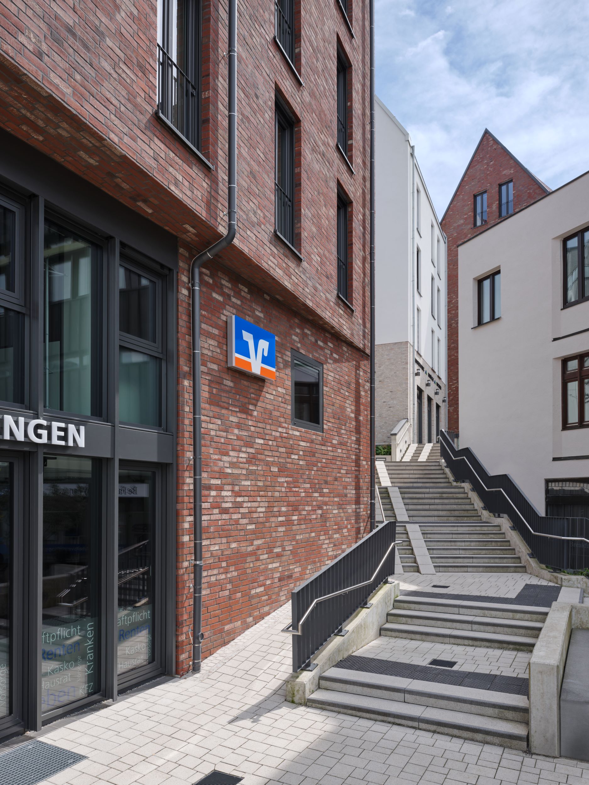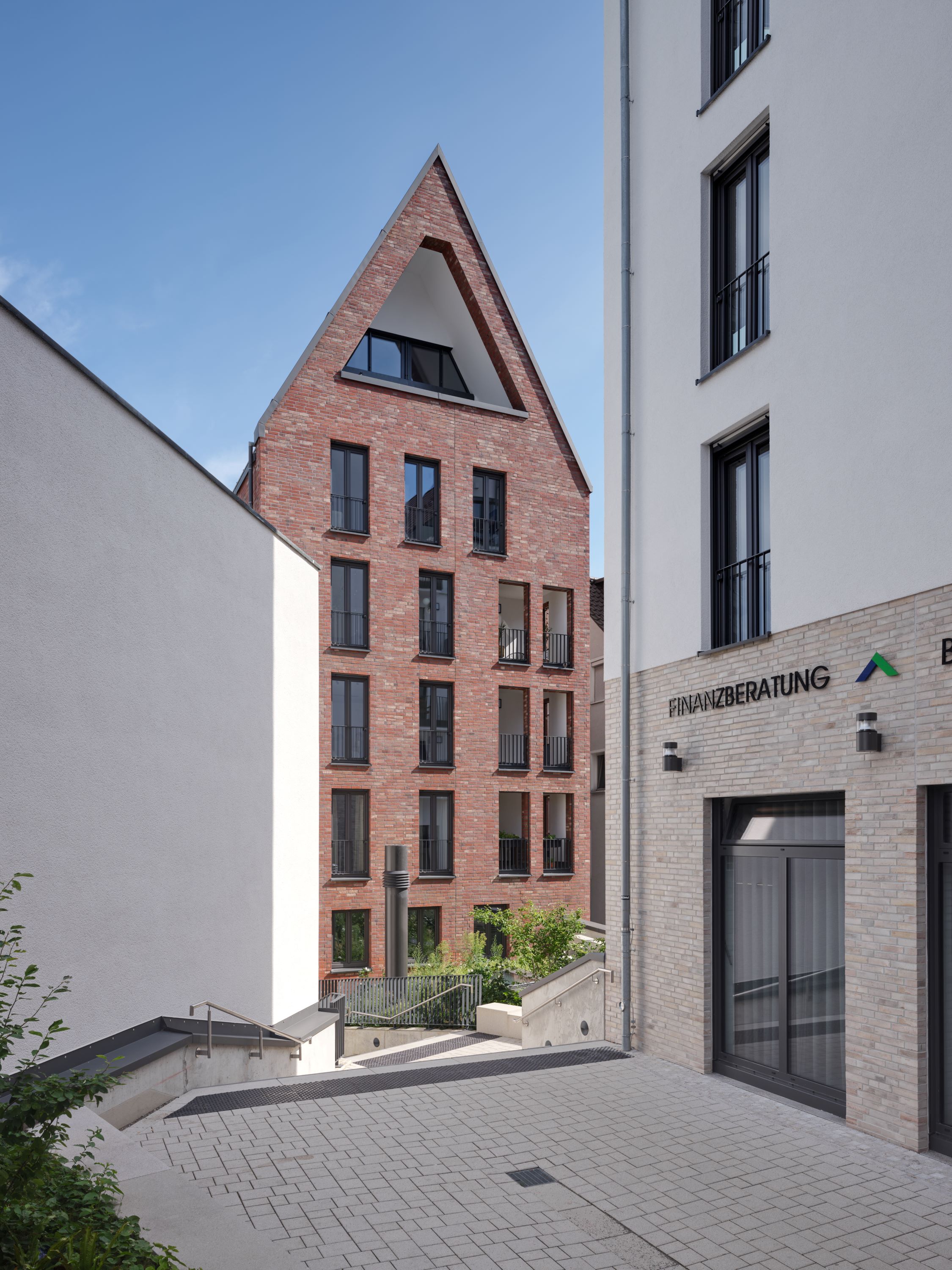 Eine feine Abstufung zwischen Öffentlichkeit und Privatheit kennzeichnet die öffentlichen Räume. Sämtliche Wohnungen verfügen über Balkone oder Loggien, trotz der Strenge der Fassaden, die dem Quartier ein einprägsames, städtisches Bild geben. Die großen, zusammenhängenden Gewerbeflächen im Erdgeschoss eignen sich sowohl zur Nutzung durch einen Hauptmieter als auch zur Aufteilung in kleinere Einheiten.