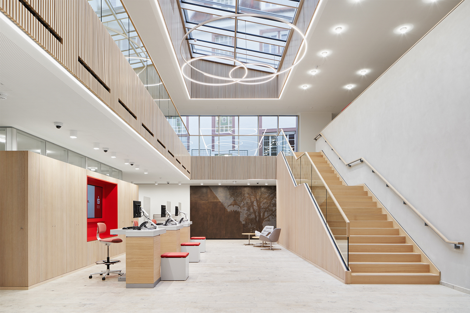 Durch das Zusammenlegen aller Arbeitsplätze der Sparkasse ins 1. Obergeschoss, wurden die Büroflächen im 2. Obergeschoss und im Dachgeschoss zur Vermietung frei.