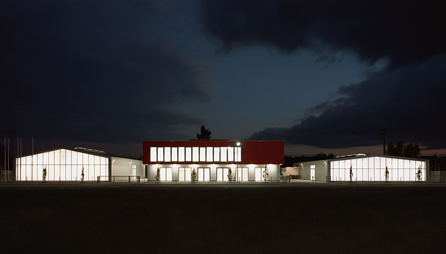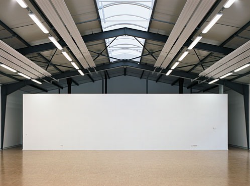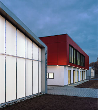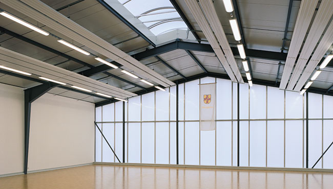 Die beiden flankierenden Hallen wurden bis auf das Tragsystem aus Stahl entkleidet und mit einer neuen, wärmegedämmten Industriefassade versehen. Stirnseitig lässt eine transluzente Polycarbonatverglasung Licht bis tief in den Innenraum fallen, der durch eingestellte Serviceboxen für Umkleiden, Duschen, Toiletten und Nebenräume unterteilt wird.