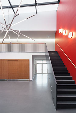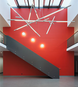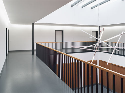 Der fünfschiffige Mittelbau wurde im Erdgeschoss behutsam an die neue Nutzung angepasst. Eine zentrale Halle erschliesst wie eine Passage das in Leichtbauweise aufgesetzte Obergeschoss, das mit seiner leuchtend roten Plattenfassade zum Symbol des Bürgerzentrums und der ihm angelagerten Veranstaltungshallen und Sportplätzen wird. Die einläufige Treppe erschliesst die Probenräume, windmühlenflügelartig um den zentralen Luftraum angeordnet; sie lassen sich dank Leichtbauweise in ihrer Größe und Konfiguration einem wechselndem Bedarf anpassen. Auch die Hausmeisterwohnung findet hier Platz. Eine serielle Fassade aus Holz-Rahmen-Elementen und geschosshohen Verglasungen zeigt die innere Wandelbarkeit auch nach Aussen hin.