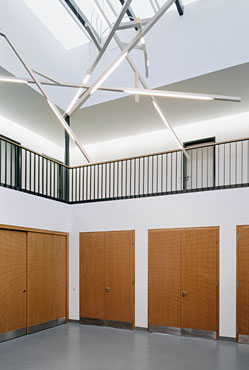 Die eingesetzten Materialien sind einfach, aber robust. In den beiden Hallen dominiert die alte Stahlkonstruktion, alle neuen Nutzungen sind nur eingestellt und gehen keine Verbindung mit der Gebäudehülle ein. Lediglich der Veranstaltungsbereich im Erdgeschoss, der auch über eine grosse Küche verfügt, wurde mit der Verwendung von Eichenholz im Ausbau massvoll aufgewertet. Ein Lichtobjekt aus stabförmigen Leuchten heisst die Besucher im Foyer willkommen und löst die Strenge der Anlage spielerisch auf.
