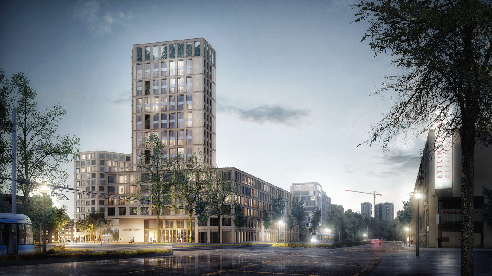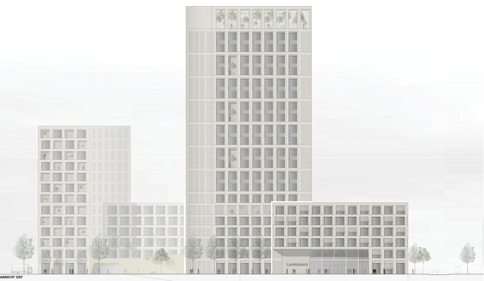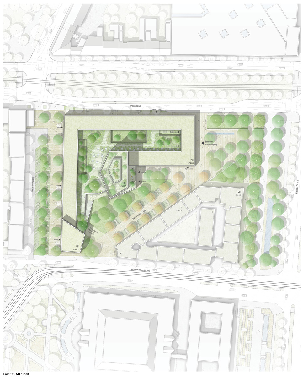Die Beiertheimer Allee, als offene Allee mit ihren „harten" bebauten und „weichen" grünen Kanten angelegt, findet ihren Abschluss am neuen Eingangsplatz des Landratsamtes. Dabei wird der harten Kante des Billing-Baus bewusst eine weiche Kante gegenübergesetzt. Diese weiche grüne Kante ist als parkartige Stadtlandschaft entworfen, die sich auch auf dem überdachten Innenhof des Mäanders fortsetzt. Durch die Entscheidung keine Straßenflucht entstehen zu lassen wird der Billing-Bau zu einem Teil des großen Stadtblocks in dessen Zentrum das Hochhaus steht.