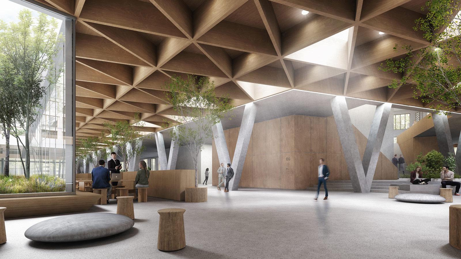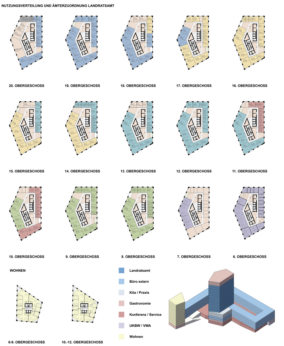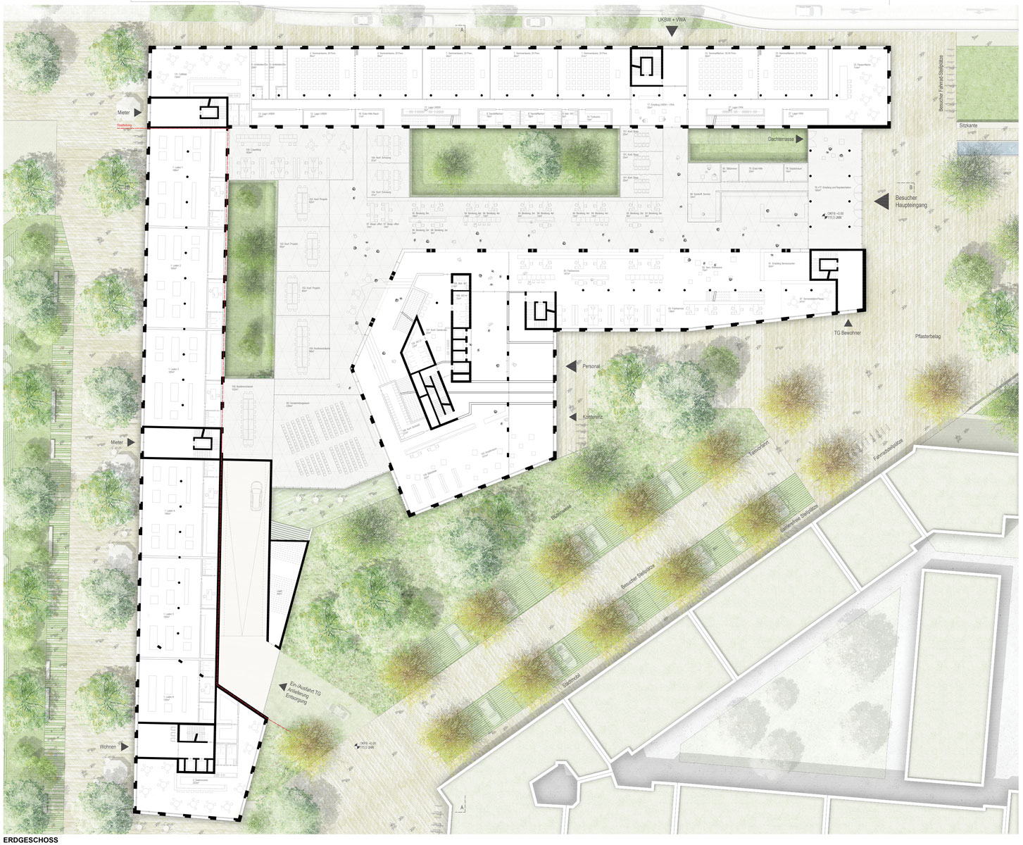 Im Gegensatz zur steinernen Stadtfassade steht der Trägerrost aus Holz, der als Dachtragwerk den Innenhof des Mäanders überspannt. Die Atmosphäre wechselt mit Betreten der Halle von städtischer Geschäftigkeit hin zu einer ruhigen Konzentriertheit unterstützt durch den Wechsel des Materials und der grünen Innenhofoasen. Hier sind auf einer Ebene im Anschluss an die Eingangshalle des Landratsamtes das Servicecenter, das Beratungscenter und der gesamte Versammlungs- und Konferenzbereich untergebracht. Der große Konferenzsaal liegt mit Blick ins Grüne und Zugang ins Freie am Ende der Halle. Über eine doppelläufige Treppe, die in zwei Richtungen nach oben führt, kommt man vom Zentrum der Halle ins Betriebsrestaurant, das im Sitzbereich eine doppelte Raumhöhe hat. Der Freibereich des Restaurants liegt auf dem begrünten Innenhofdach. Im 3.OG befindet sich die betriebsärztliche Praxis, im 5.OG, dem Übergang in den Turmbereich, die Kita mit einem großen Freibereich in Form einer eingefassten Dachterrasse. Darauf folgen die verschiedenen Dezernate in den einzelnen Turmgeschossen. Auf dem Dach des Turms befindet sich ein öffentlich zugänglicher Dachgarten mit Biergarten. Wir haben bewusst keine „Skybar" vorgeschlagen, weil wir der Meinung sind, dass ein badischer Biergarten besser zum „Haus des Landes" passt und für jeden zugänglich sein sollte.