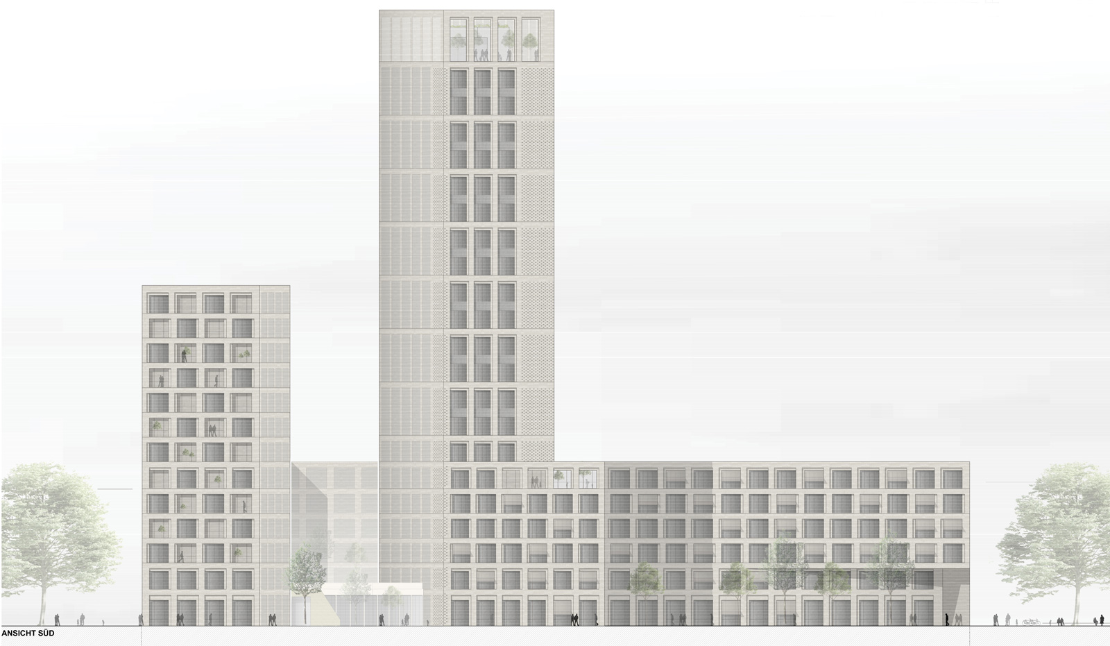 Die städtebauliche Großform wird über ein durchgängiges Fassadenmaterial definiert, das am Wohnturm, über den mäandrierenden straßenbegleitenden Teil bis hin zum Hochhaus eingesetzt wird. Dabei halten wir den Klinkerstein für das ideale Material der Großform trotzdem einen differenzierten Ausdruck zu verleihen. Mit dem „handlichen" Format des Klinkers wird dem menschlichen Maßstab automatisch Rechnung getragen. Die Vielzahl der Mauerwerksverbände, die Möglichkeit der Vor-, Rücksprünge und Auslassung von Mauersteinen bieten die Varianz eine abwechslungsreiche Fassade im Detail zu gestalten. Die dargestellte Fassade gibt mit ihren Öffnungsformaten und den Absätzen nur die grundsätzliche Gliederung vor. Dabei sehen wir quadratische Öffnungen in den straßenbegleitenden Teilen und dem Wohnturm vor und stehende rechteckige Öffnungen im Turm und im durchgehenden Sockelgeschoss. Die Farbe des Klinkers soll sich nach den verwendeten Natursteinen der beiden Billing-Bauten richten.