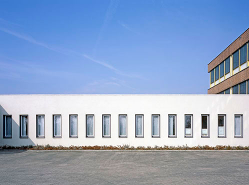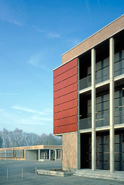 Städtebaulich komplettiert die Erweiterung die bestehende Berufsschule von Montabaur. Ihre Typologie, eine Hof-Bauweise, wird wieder aufgenommen und bildet nun auch auf der Talseite den Wechsel von Klassentrakt - Hof -Klassentrakt aus, wie sie bereits auf der Hangseite existiert.
