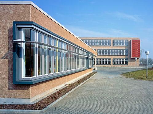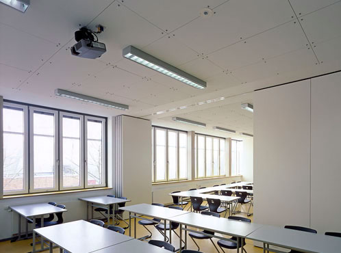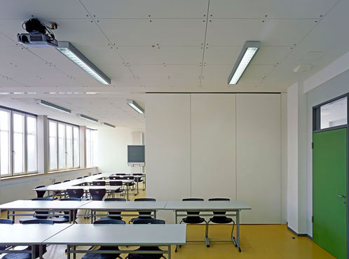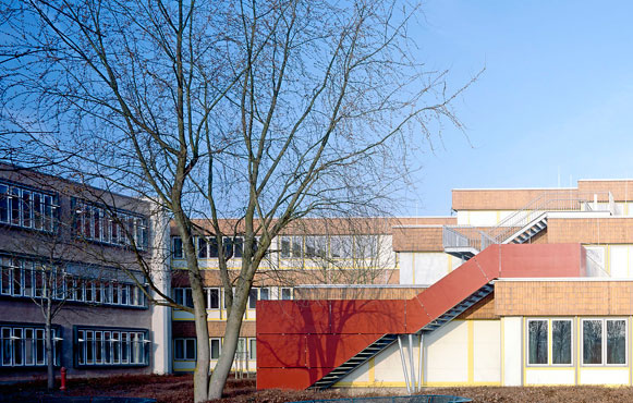 Drei funktional unterschiedliche Bereiche wurden in den Bestand eingepasst. Die Klassenräume sind in einem 3-geschossigen Klassentrakt zusammengefasst, im Erdgeschoss beinhaltet dieser ausserdem den EDV-Raum. Durch den schmalen Anschluss des Klassentraktes an den Bestand wird die bestehende Fassadenfläche mit den dahinter liegenden, zu belichtenden Räumen nicht eingeschränkt.