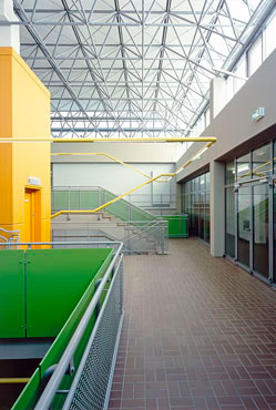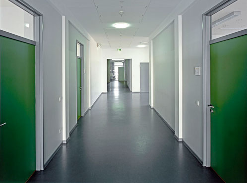 An einen vorhandenen Flur, der bisher nur einspännig genutzt wurde, sind nun ein Büro, ein Schülervertretungsraum und ein Aufenthaltsraum angegliedert. Zusammen mit einer überdeckten Pausenfläche, die den zweiten Zugang formuliert, und dem Werkraum mit angeschlossener Klasse bildet dieser Eingriff den zweiten Bauabschnitt. Zwei Raumerweiterungen im Bereich der Werkstätten schließen die Maßnahme ab.