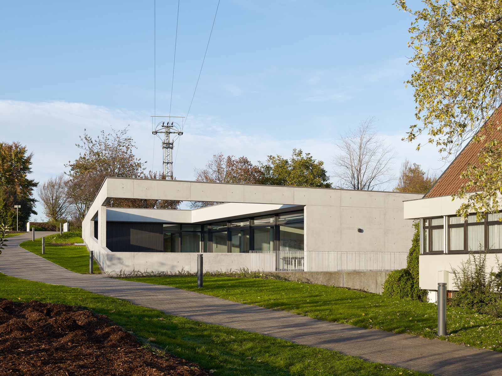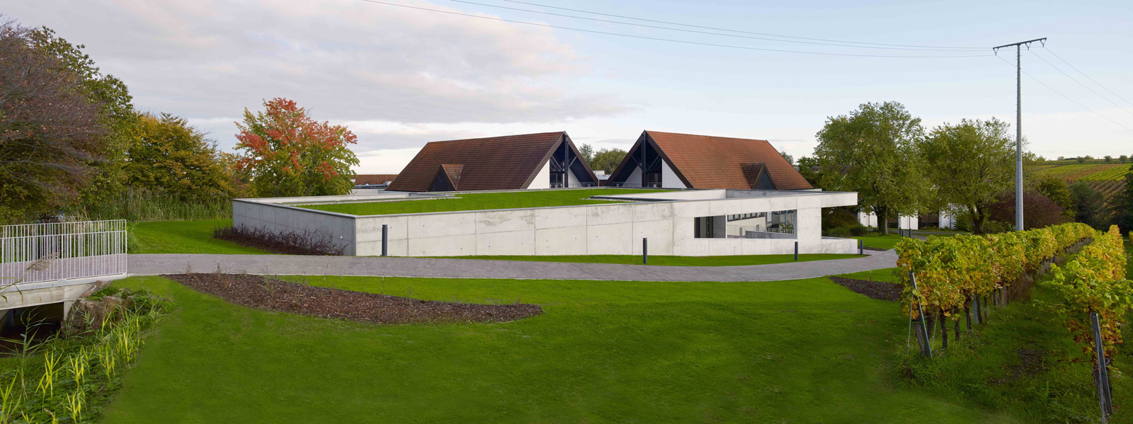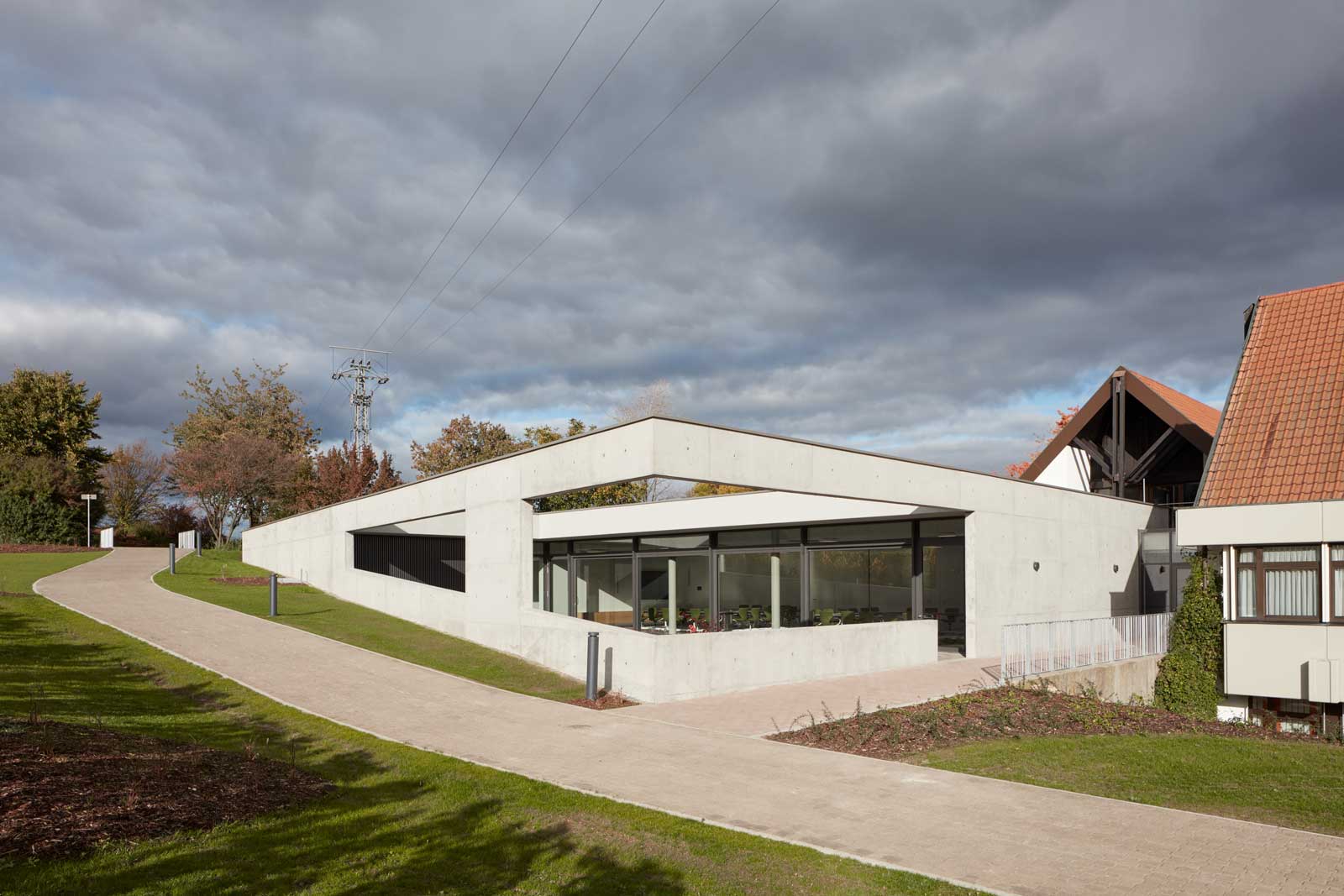 Das Haus Maikammer, ein Schulungszentrum der Berufsgenossenschaft Rohstoffe Chemie und Industrie, musste erweitert werden. Das Haus liegt in der sanft hügeligen Landschaft der Vorderpfalz in Mitten von Weinreben mit Blick auf den malerischen Haardtrand. So werden die Ausläufer des Pfälzer Waldes genannt. Das bestehende Ensemble aus Unterrichtsräumen, Hotel und Gastronomie ist in sich geschlossen und nicht auf Erweiterung angelegt. Die einzig mögliche Stelle einer für die innere Organisation sinnvollen Erweiterung ist durch einen steilen Hang geprägt. Die Lösung musste sein, das Gebäude in den Hang zu bauen, was wiederum den Vorteil hat, dass die Erweiterung im Gelände verschwindet und nicht in Konkurrenz zum Bestand tritt. Aber wie belichtet man ein Gebäude, das im Hang steckt? Es muss sich den Raum für die Belichtung selbst schaffen durch das Einschneiden von Lichthöfen in den Hang, über die die Seminarräume und Büros belichtet werden können. Die Erweiterung tritt so nicht als Gebäude in Erscheinung, sondern als Landschaftsbauwerk, das mit dem Bestand nicht konkurriert, sondern in dieser Ortsrandlage kaum wahrnehmbar ist. Es passt sich in die sanfte Hügellandschaft der Vorderpfalz ein und wird durch das begrünte Flachdach gleichsam Teil davon. Die Wahl von Beton als Material für die Außenhülle ist eine logische Konsequenz aus dem Ansatz, das Gebäude als Landschaftsbauwerk zu entwerfen, das sich in den Hang gräbt. Aus konstruktiver und abdichtungstechnischer Sicht ist Beton das sinnvollste und wirtschaftlichste Material. Der Anschluss an den Bestand erfolgt barrierefrei über einen verglasten Übergang, der wie Fuge zwischen Bestand und Erweiterung wirkt. Man verlässt den Bestand und betritt den neuen Teil also nicht unbemerkt. Der Neubau wird durch die Orientierung der Seminar- und Büroräume zu den beiden Höfen, die jeweils in entgegengesetzte Himmelsrichtungen ausgerichtet sind, ganz automatisch in zwei funktionale Zonen gegliedert: in den Seminarbereich und in den Bürobereich. Die Höfe dienen neben der Belichtung gerade bei den beiden Seminarräumen als Erweiterung nach außen im Sinne einer Freiklasse. Dabei wird der Blick auf die Landschaft durch den oberen Balken gerahmt wie bei einem Gemälde.