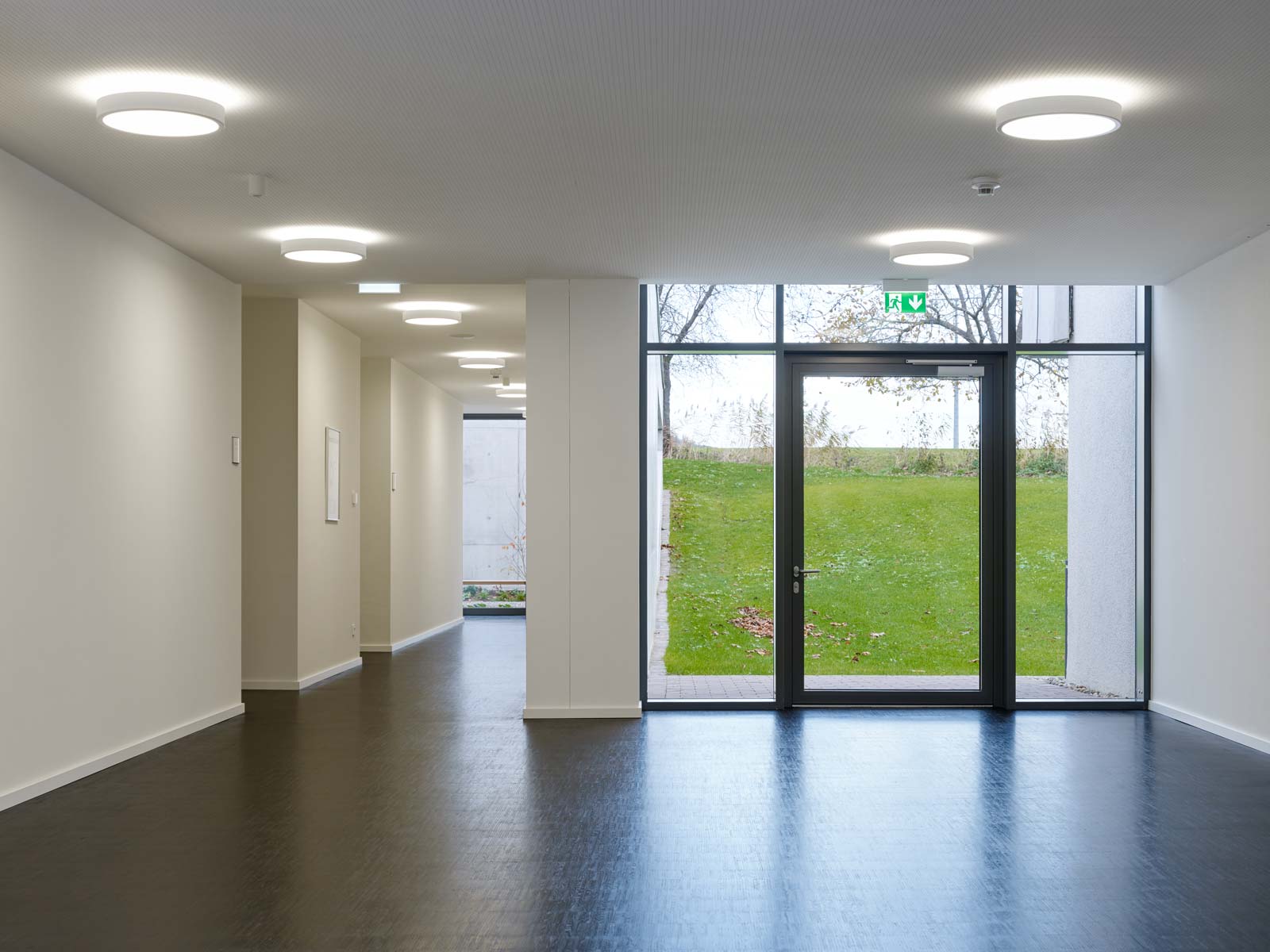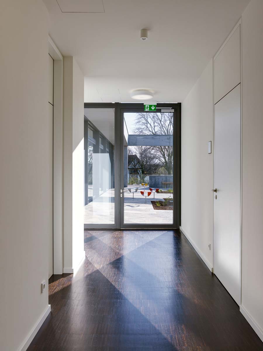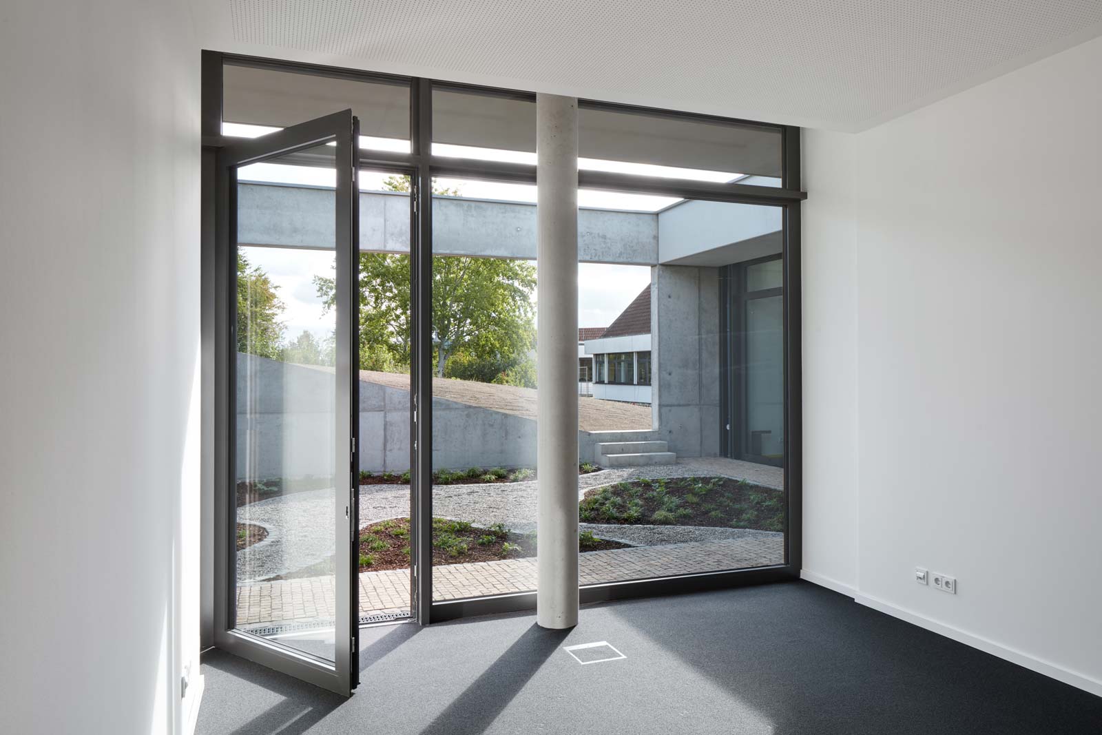 Das Haus Maikammer, ein Schulungszentrum der Berufsgenossenschaft Rohstoffe Chemie und Industrie, musste erweitert werden. Das Haus liegt in der sanft hügeligen Landschaft der Vorderpfalz in Mitten von Weinreben mit Blick auf den malerischen Haardtrand. So werden die Ausläufer des Pfälzer Waldes genannt. Das bestehende Ensemble aus Unterrichtsräumen, Hotel und Gastronomie ist in sich geschlossen und nicht auf Erweiterung angelegt. Die einzig mögliche Stelle einer für die innere Organisation sinnvollen Erweiterung ist durch einen steilen Hang geprägt. Die Lösung musste sein, das Gebäude in den Hang zu bauen, was wiederum den Vorteil hat, dass die Erweiterung im Gelände verschwindet und nicht in Konkurrenz zum Bestand tritt. Aber wie belichtet man ein Gebäude, das im Hang steckt? Es muss sich den Raum für die Belichtung selbst schaffen durch das Einschneiden von Lichthöfen in den Hang, über die die Seminarräume und Büros belichtet werden können. Die Erweiterung tritt so nicht als Gebäude in Erscheinung, sondern als Landschaftsbauwerk, das mit dem Bestand nicht konkurriert, sondern in dieser Ortsrandlage kaum wahrnehmbar ist. Es passt sich in die sanfte Hügellandschaft der Vorderpfalz ein und wird durch das begrünte Flachdach gleichsam Teil davon. Die Wahl von Beton als Material für die Außenhülle ist eine logische Konsequenz aus dem Ansatz, das Gebäude als Landschaftsbauwerk zu entwerfen, das sich in den Hang gräbt. Aus konstruktiver und abdichtungstechnischer Sicht ist Beton das sinnvollste und wirtschaftlichste Material. Der Anschluss an den Bestand erfolgt barrierefrei über einen verglasten Übergang, der wie Fuge zwischen Bestand und Erweiterung wirkt. Man verlässt den Bestand und betritt den neuen Teil also nicht unbemerkt. Der Neubau wird durch die Orientierung der Seminar- und Büroräume zu den beiden Höfen, die jeweils in entgegengesetzte Himmelsrichtungen ausgerichtet sind, ganz automatisch in zwei funktionale Zonen gegliedert: in den Seminarbereich und in den Bürobereich. Die Höfe dienen neben der Belichtung gerade bei den beiden Seminarräumen als Erweiterung nach außen im Sinne einer Freiklasse. Dabei wird der Blick auf die Landschaft durch den oberen Balken gerahmt wie bei einem Gemälde.