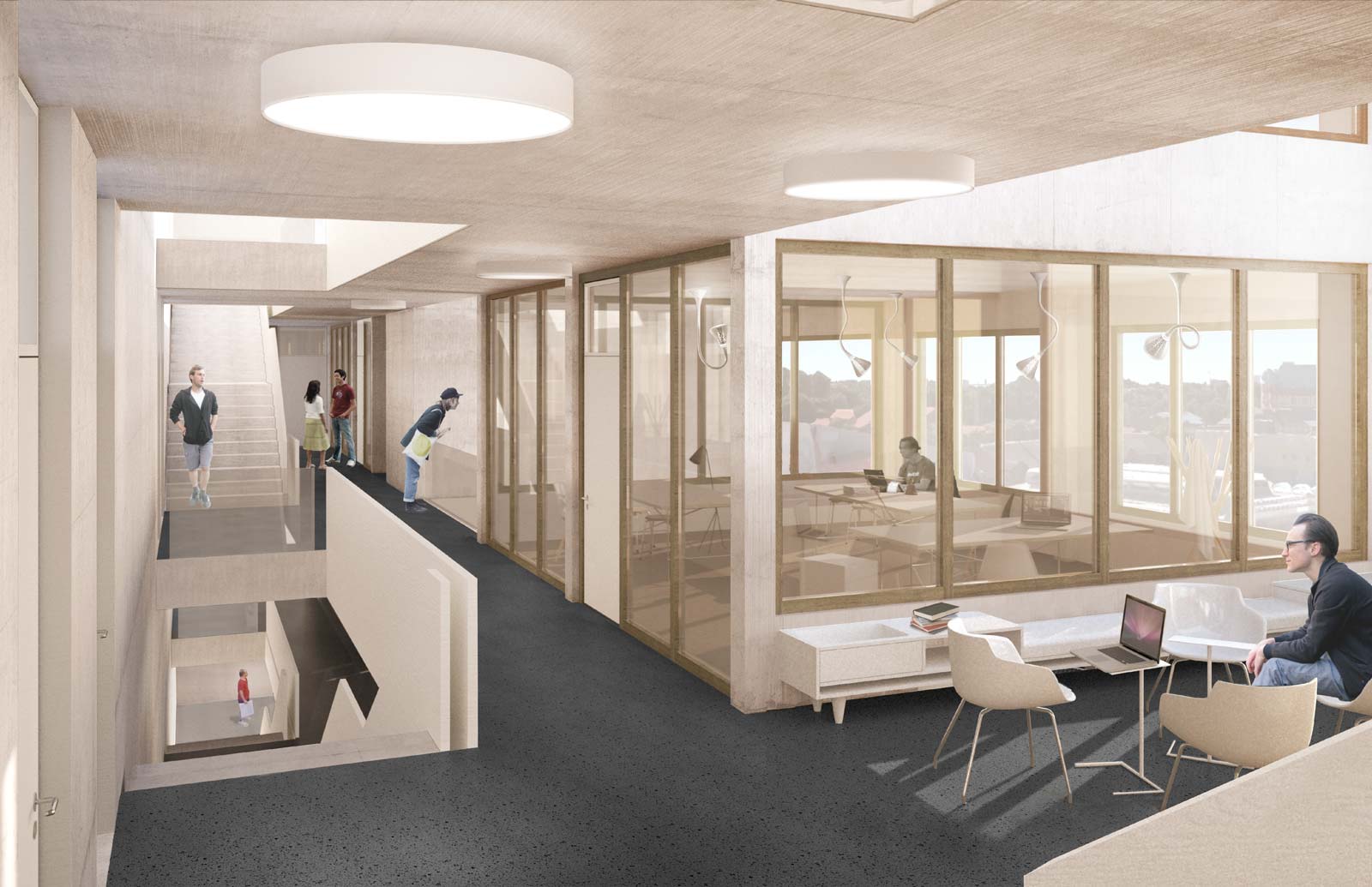 Ein intelligentes Erschließungskonzept sorgt für offene und geschlossene Arbeitsbereiche wie für große und kleine Einheiten, der Kommunikation soll Raum geboten werden. Im Zentrum steht dabei die offene „Himmelstreppe", die alle Geschosse miteinander verbindet. Sie sorgt dafür, dass die Einheiten nicht nur horizontal durch Flure, sondern auch vertikal durch Lufträume miteinander kommunikativ verknüpft werden.