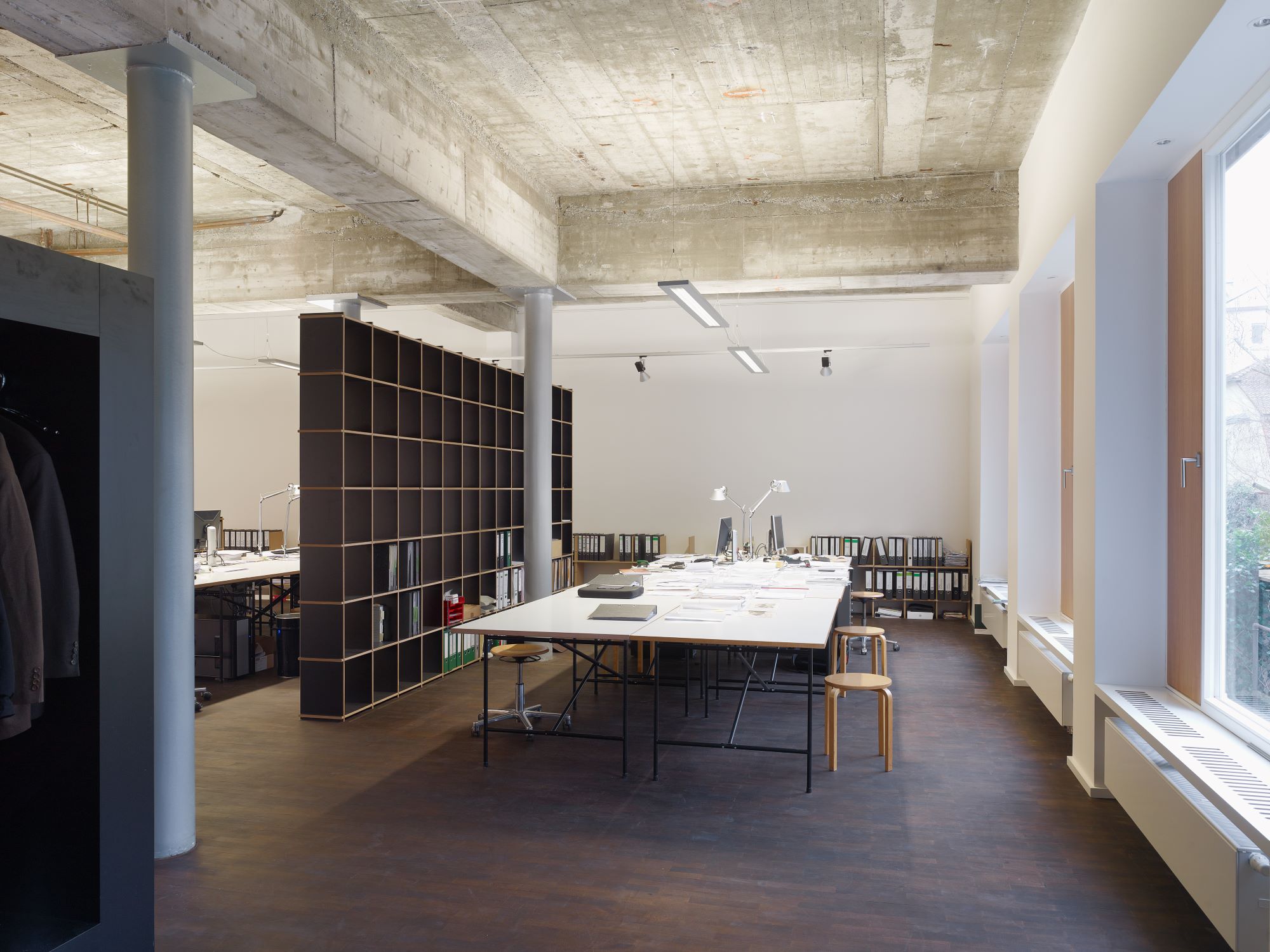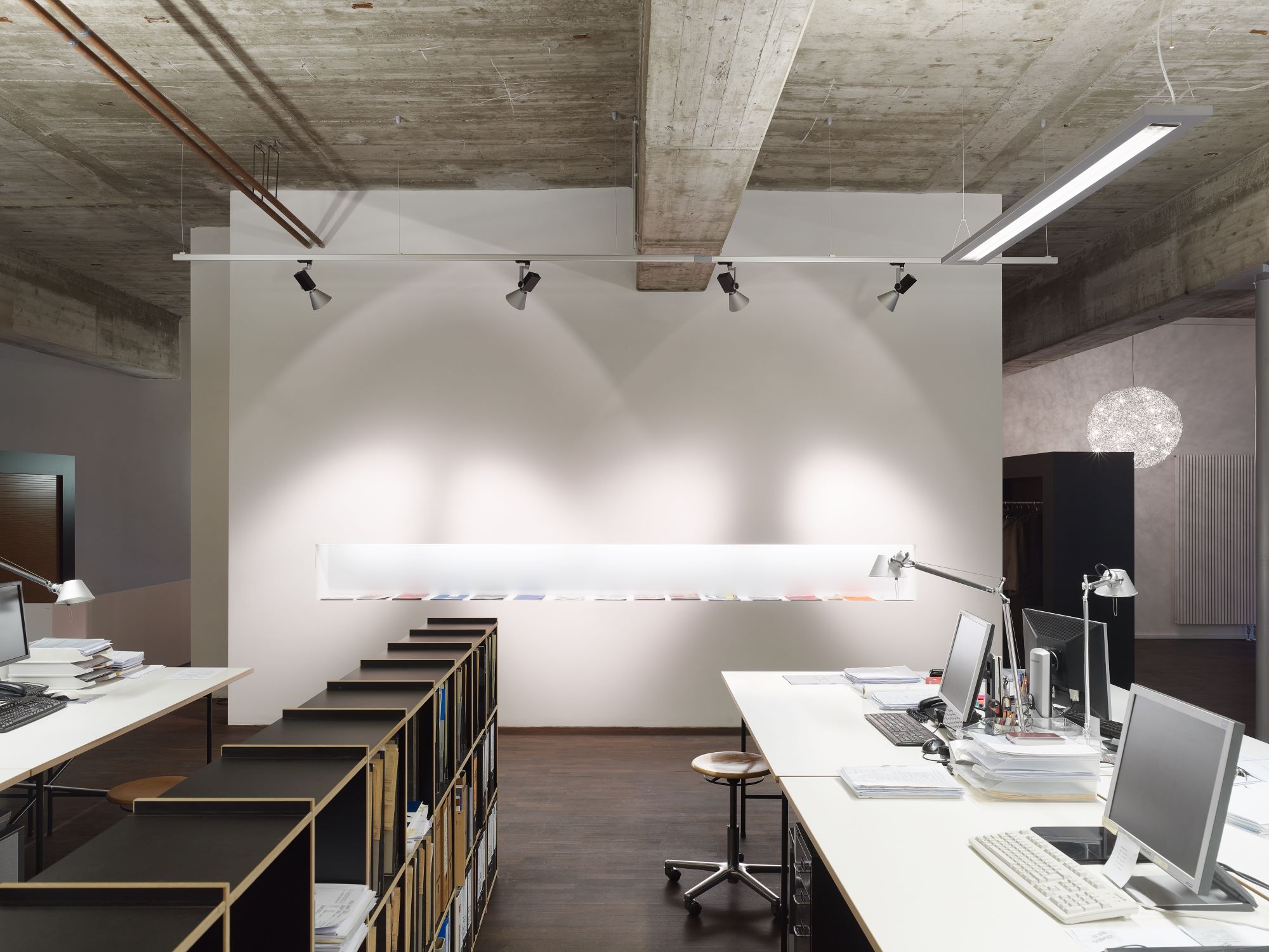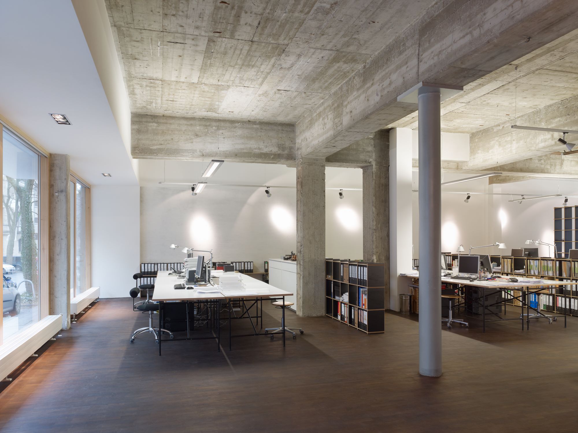 Der hochwertige, monochrome Ausbau der unteren Etage steht in bewusstem Gegensatz zur rauen Tragstruktur im Erdgeschoss. Die Möblierung schafft als separater Layer einzelne Arbeitsbereiche, die durch die lineare Beleuchtung wie Inseln wirken.