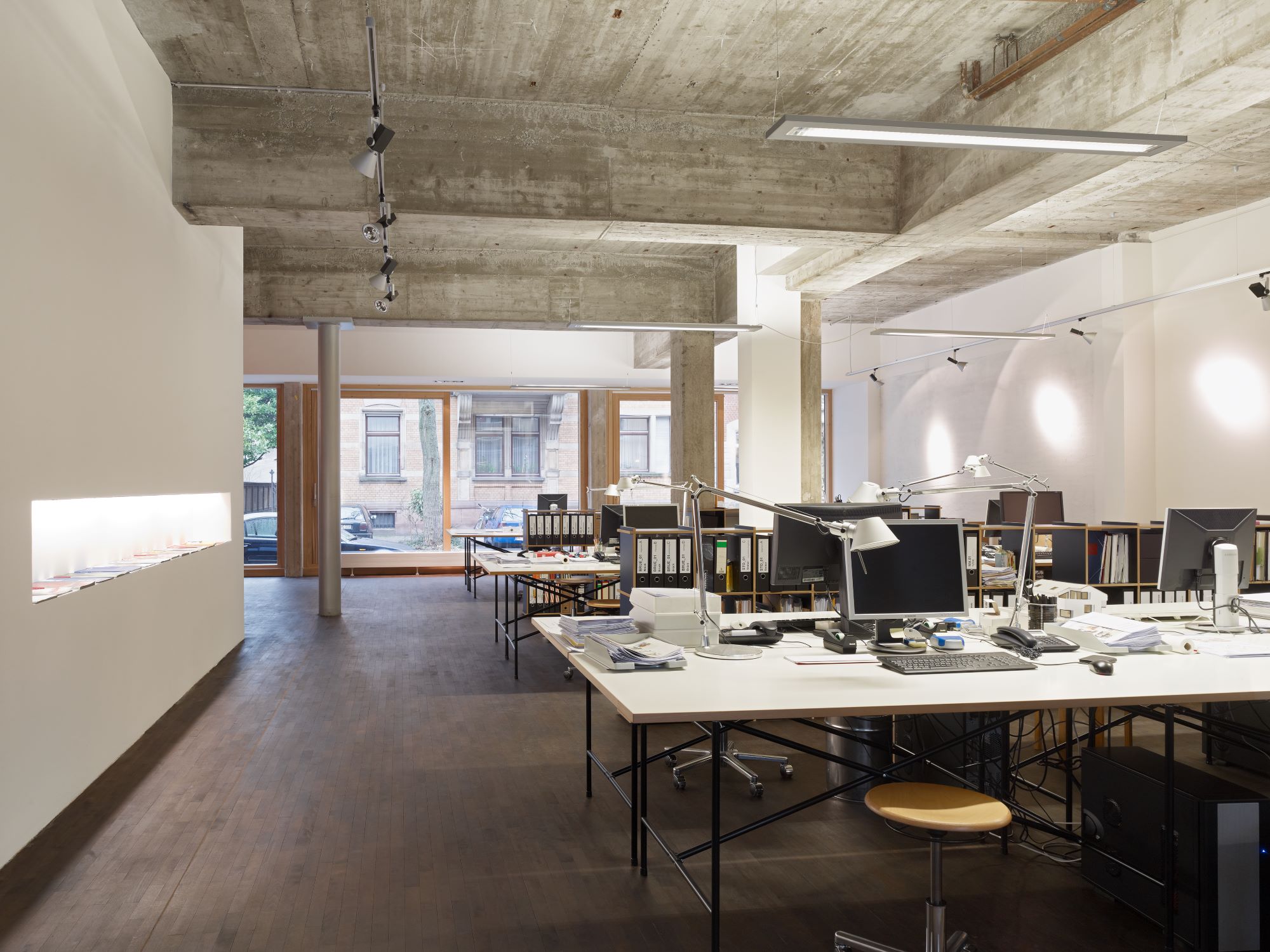 Uns erschien der Raum verlockend; die schöne Lage inmitten des gründerzeitlichen Stadtviertels mit seiner hervorragenden Infrastruktur nahe der Innenstadt, die große Glasfassade zur Straße, ein nur durch wenige Stützen eingeschränkter Grundriss und die Möglichkeit, das Untergeschoss auszubauen waren Argumente genug für den Kauf. Nach der Rückführung auf den Rohbaukern zeigte sich uns ein ganz neues Bild: ein mächtiges Betontragwerk spannte sich quer durch den Raum, die meisten Einbauten konnten entfernt werden, von dem unübersichtlichen Leitungswirrwarr blieben ganze vier Leitungen übrig, die noch in Betrieb waren, und auch einige der bestehenden Kamine konnten entfernt werden.
