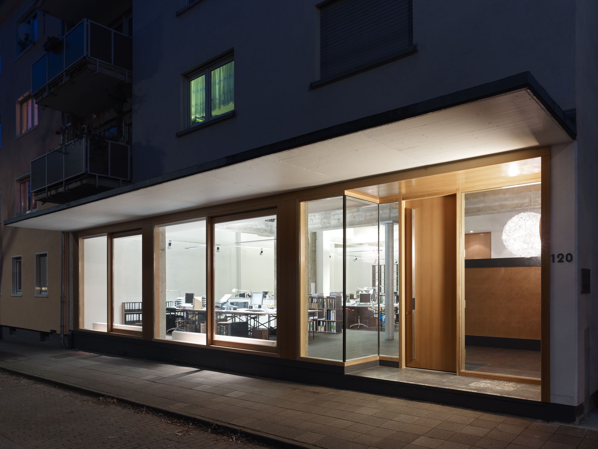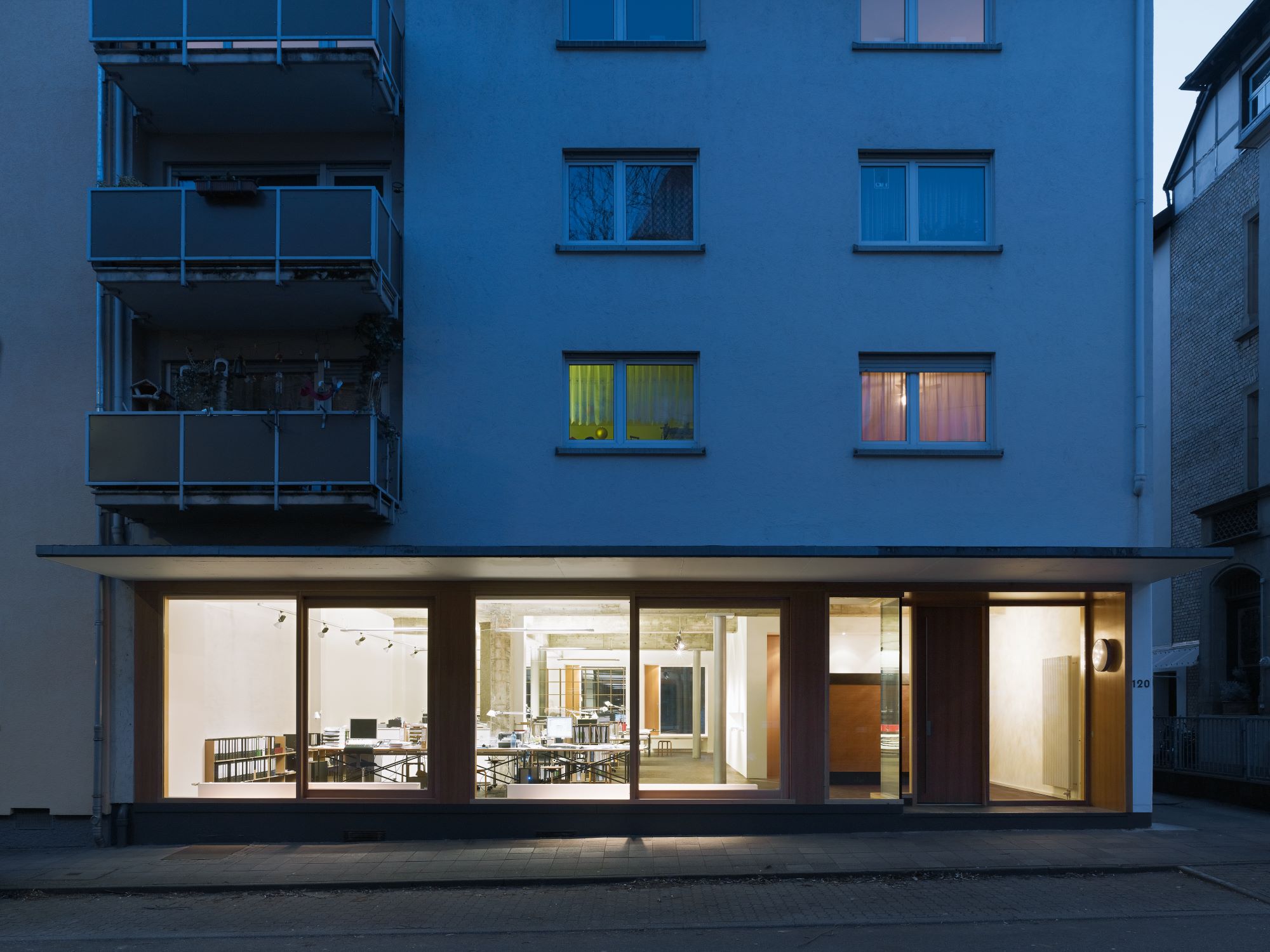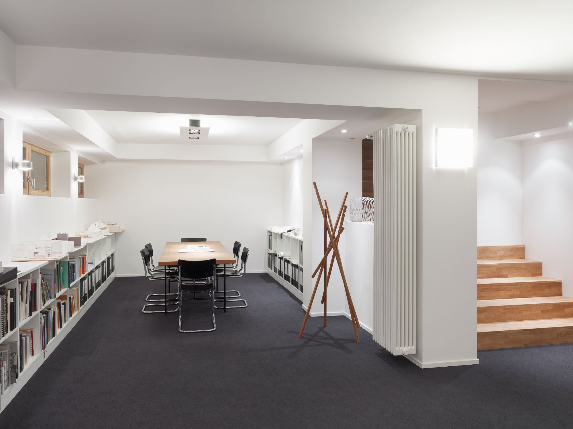 Das in den Raum eingeschnittene Haustreppenhaus wurde un einen kleinen Sanitärbereich erweitert, eine Leitwand mit hinterleuchtetem Bücherregal führt den Besucher nun in den hinteren Teil des Raumes. Die Treppe zum Untergeschoss wurde aus Kostengründen in ihrer Lage belassen, aber von Einbauten befreit und mit Parkett belegt. Sie führt zu den Besprechungsbereichen, der Küche dem Archiv und den Werkstatträumen.