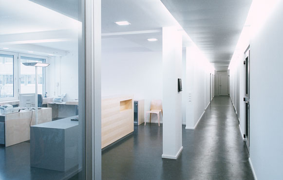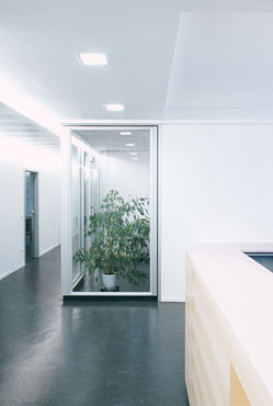 Der neu geschaffene Eingangs- und Sekretariatsbereich wurde erst durch die Herausnahme einer Stahlbeton-Wandscheibe ermöglicht. Eine kubische Theke aus Ahornholz gibt dem anschließenden Arbeitsbereich Halt und Distanz zum Korridor, ohne die neu gewonnene Aufweitung wieder einzuschränken. Der bestehende Besprechungsraum wurde ebenfalls durch die Herausnahme von Wänden vergrößert und zugleich symmetrisiert; eine abgestufte Decke unterstreicht seinen hochwertigen Charakter und trägt der unabänderlichen Leitungsführung des Bestands Rechnung.