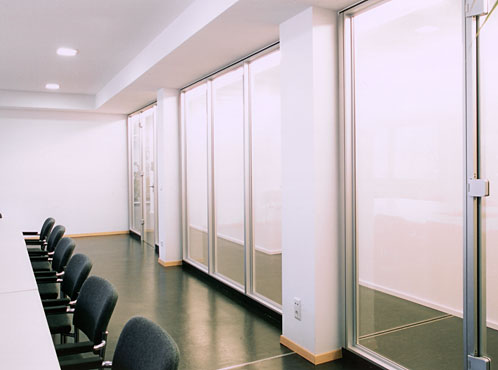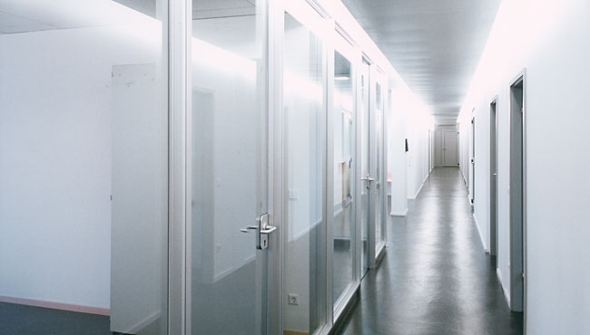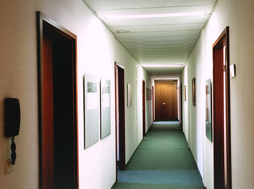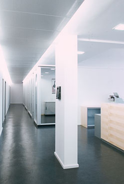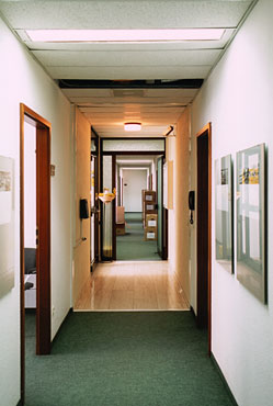 Die vormals dunklen, beklemmenden Korridore erhalten nun Tageslicht über die einseitig vollständig verglasten Bürowände. Ein über die volle Länge durchlaufendes Deckensegel aus Metall verbirgt die indirekte Beleuchtung, die den Gang höher erscheinen läßt, als er tatsächlich ist, und verdeckt zugleich alle Unterzüge, Leitungen und baulichen Unregelmäßigkeiten des Bestands.