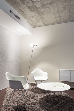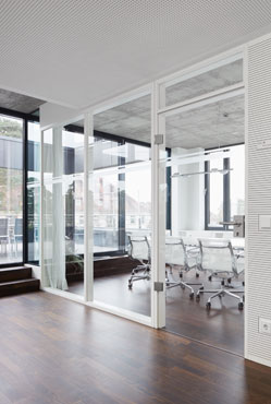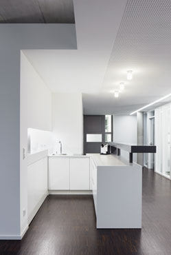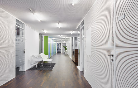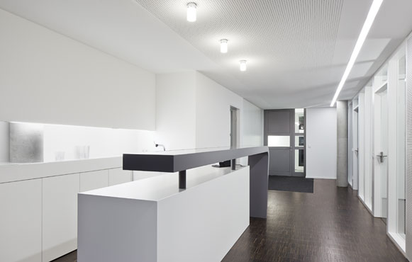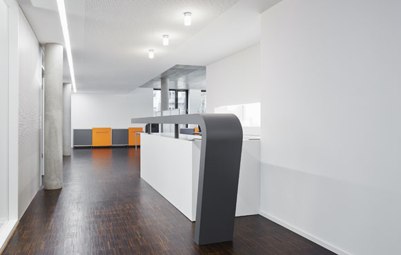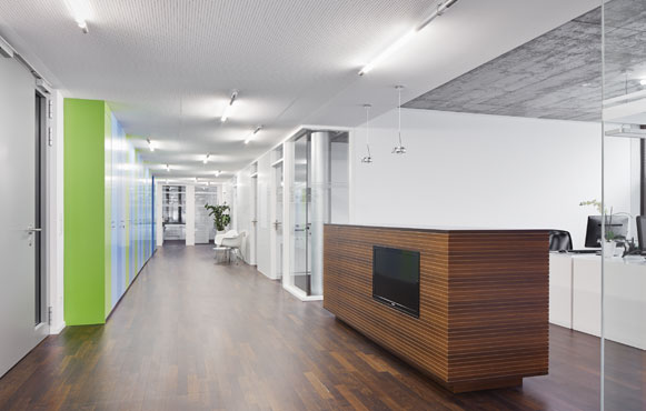 Für mehrere Büroeinheiten in einem neuerstellten Verwaltungsgebäude im Karlsruher Norden oblag uns die Ausgestaltung. Damit verknüpft waren verschiedenartige Überlegungen zu zeitgemäßen Arbeitsformen wie zur Arbeitsplatzgestaltung. Der Einsatz von Glastrennwänden, offenen Kommunikationsbereichen und zurückhaltend gestalteten Einbaumöbeln trägt den Grundgedanken offener Arbeitsformen Rechnung.