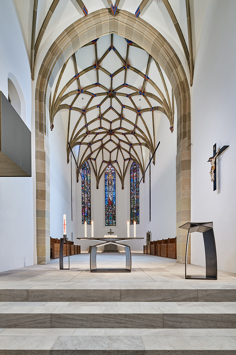 Werke christlich geprägter Künstler aus der Region treten in einen spannenden Dialog mit dem spätgotischen Raum. Das Chorgestühl bleibt in seiner jetzigen Position an den Längswänden bestehen.