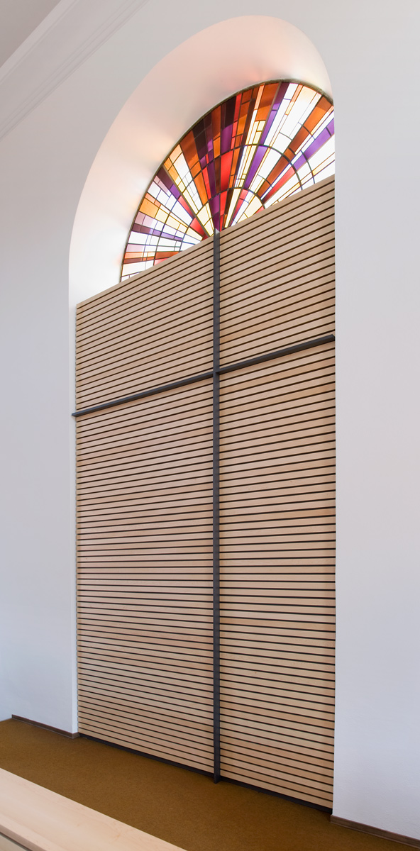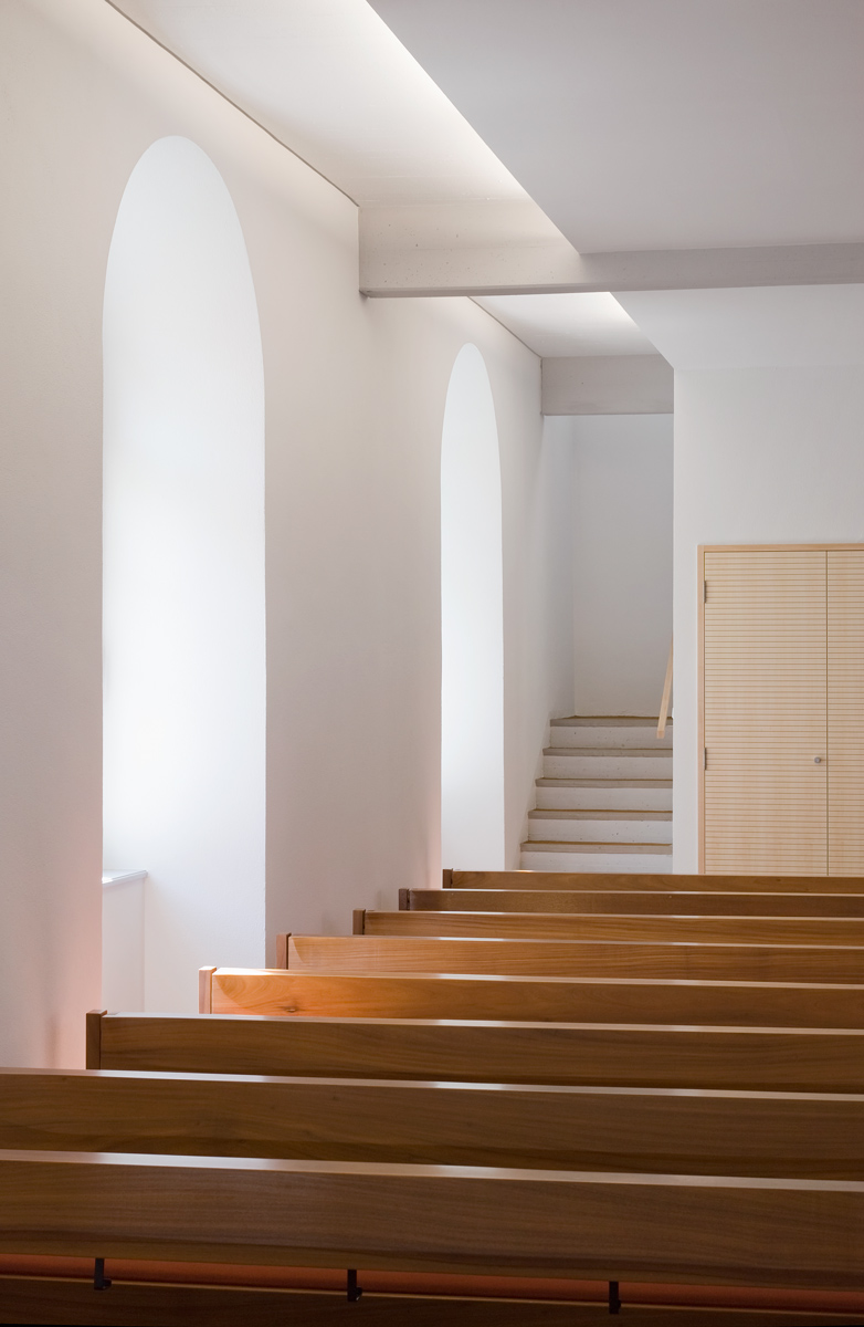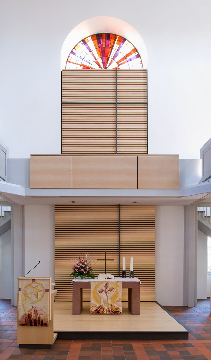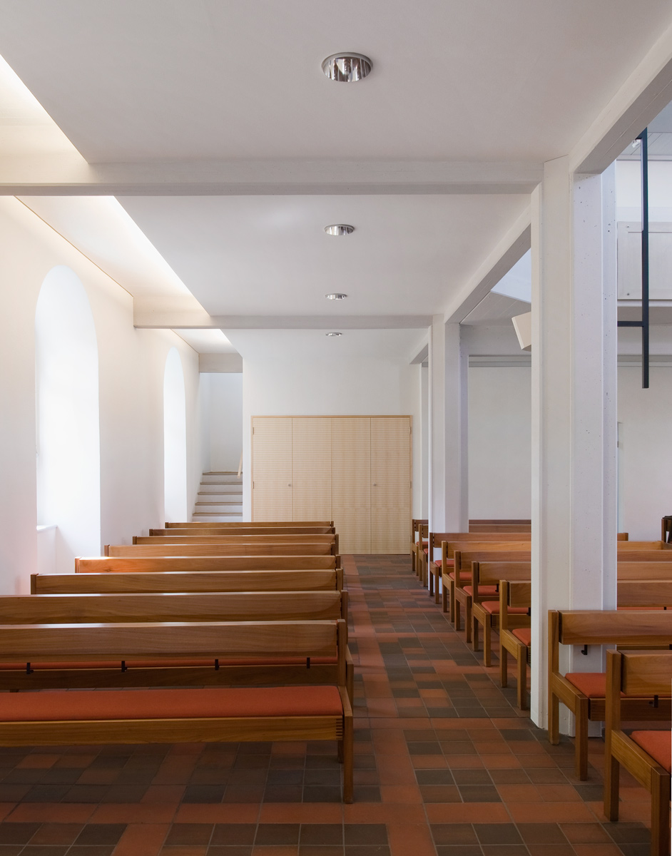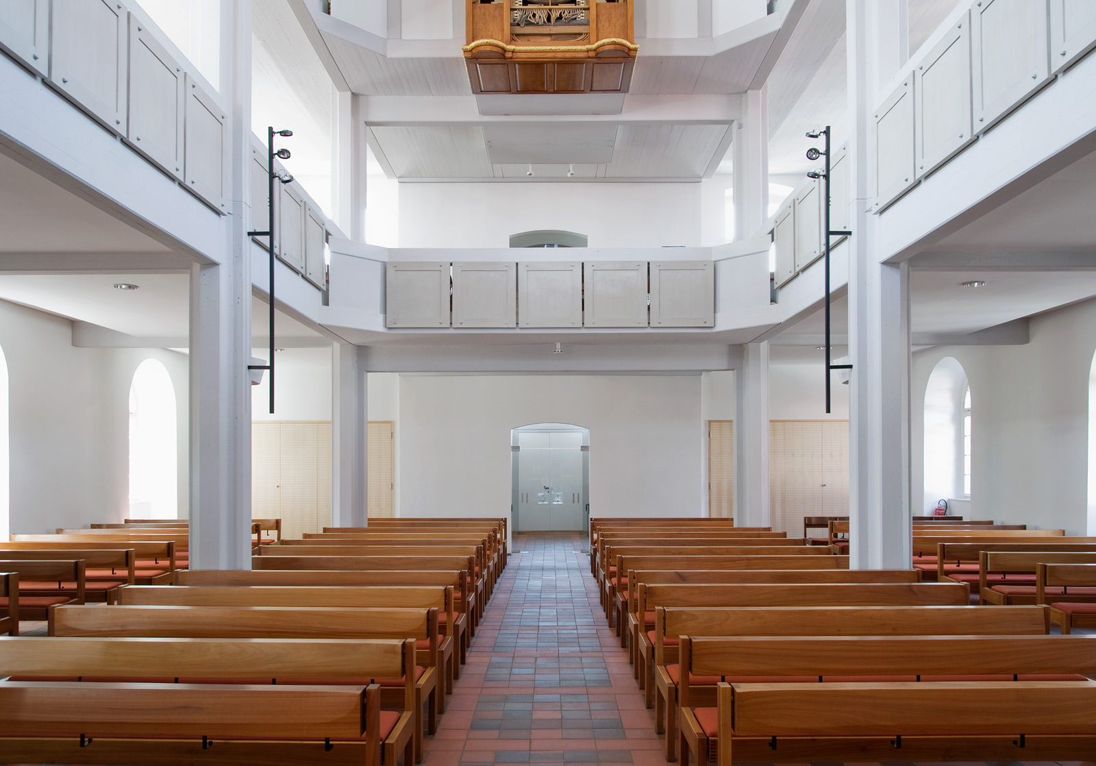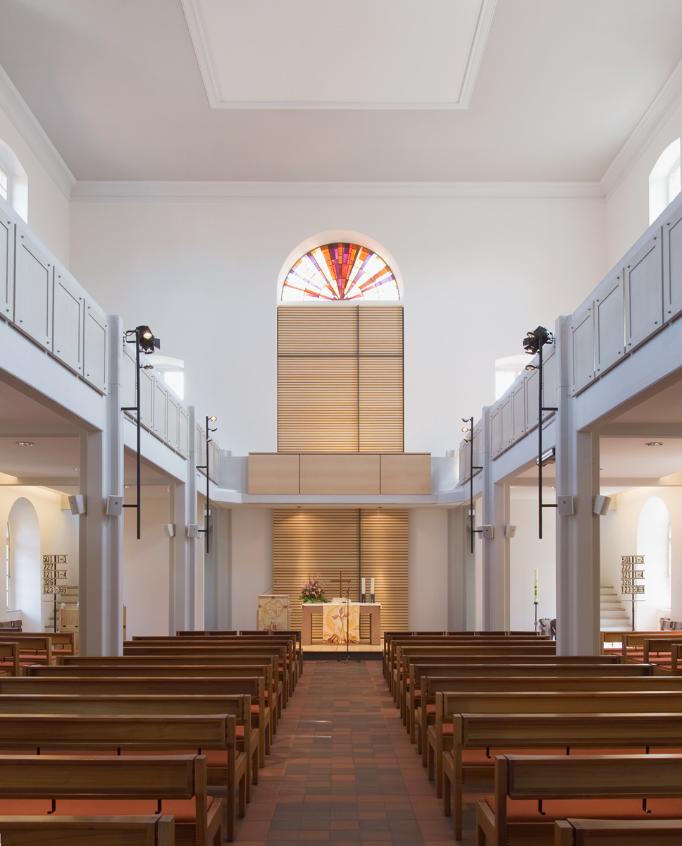Aus diesem Grund wurden wir beauftragt, kleinere Veränderungen im Bestand wie die Schaffung von Sanitärbereichen und Lagermöglichkeiten im Kirchenraum zu prüfen, ausserdem die komplette Beleuchtung und Elektrik zu überarbeiten. Die Renovierungsarbeiten wurden über den Winter in sehr kurzer Zeit durchgeführt, die Gemeinde konnte ihre Kirche zur Konfirmation bereits wieder nutzen.