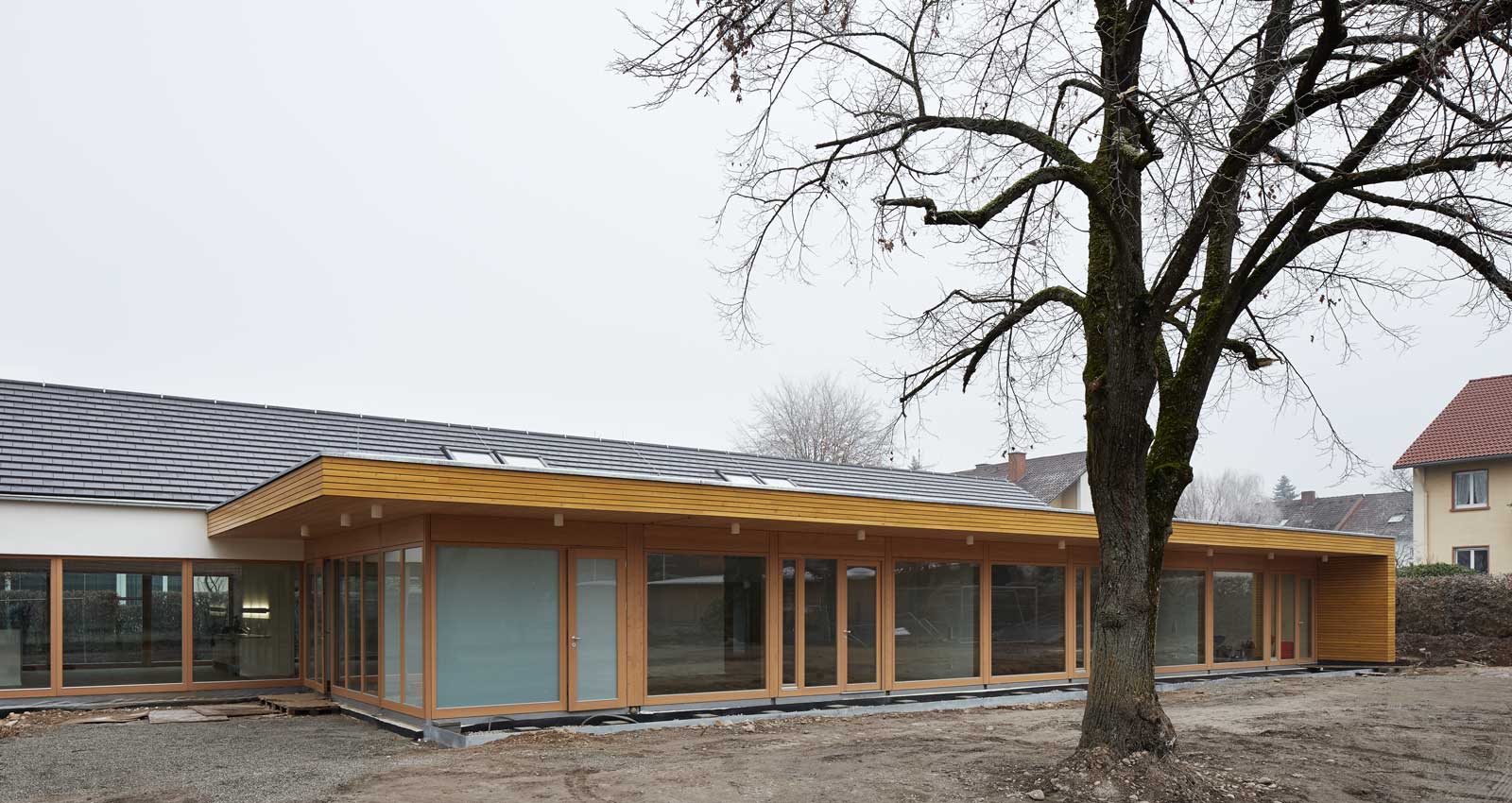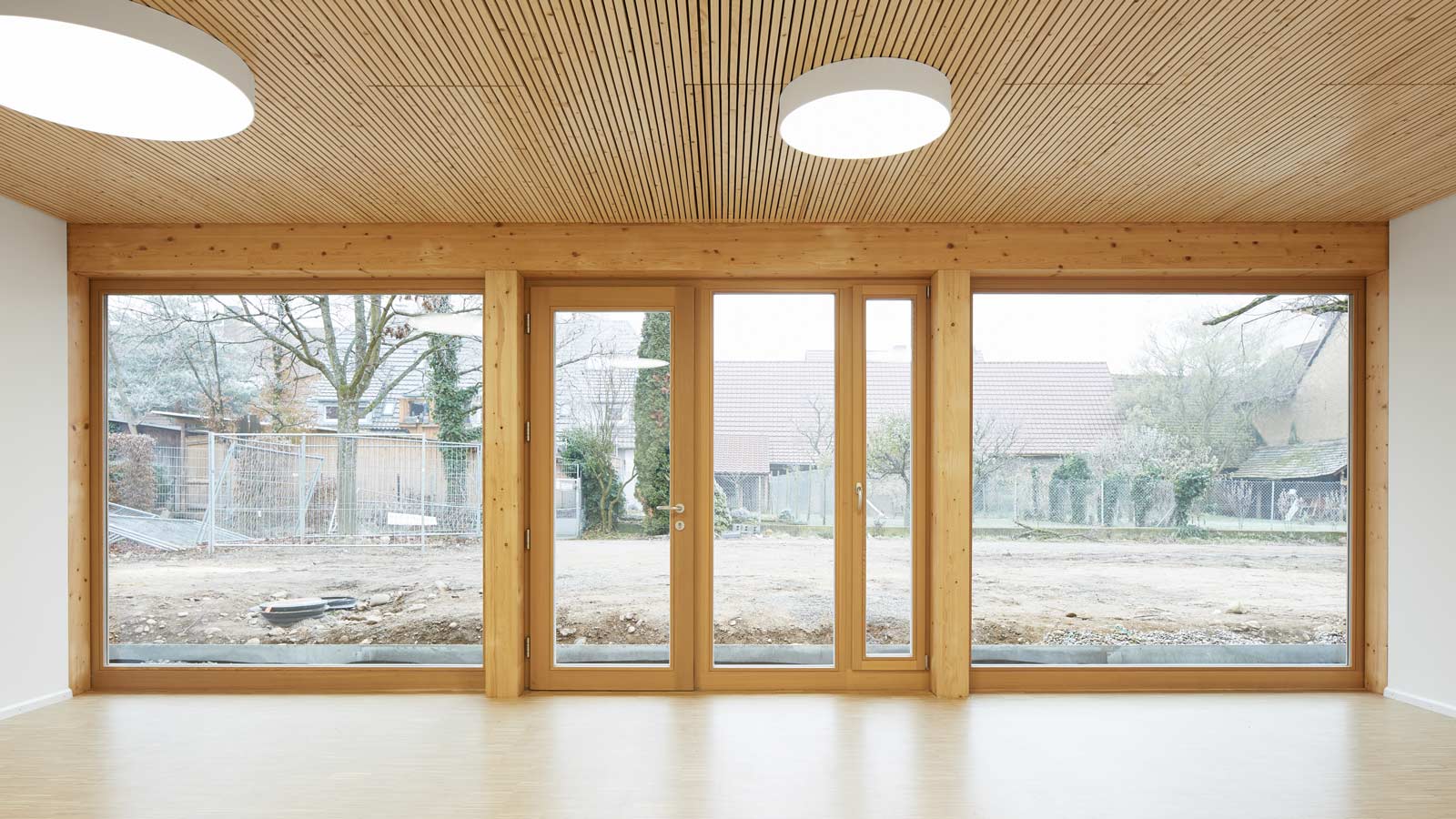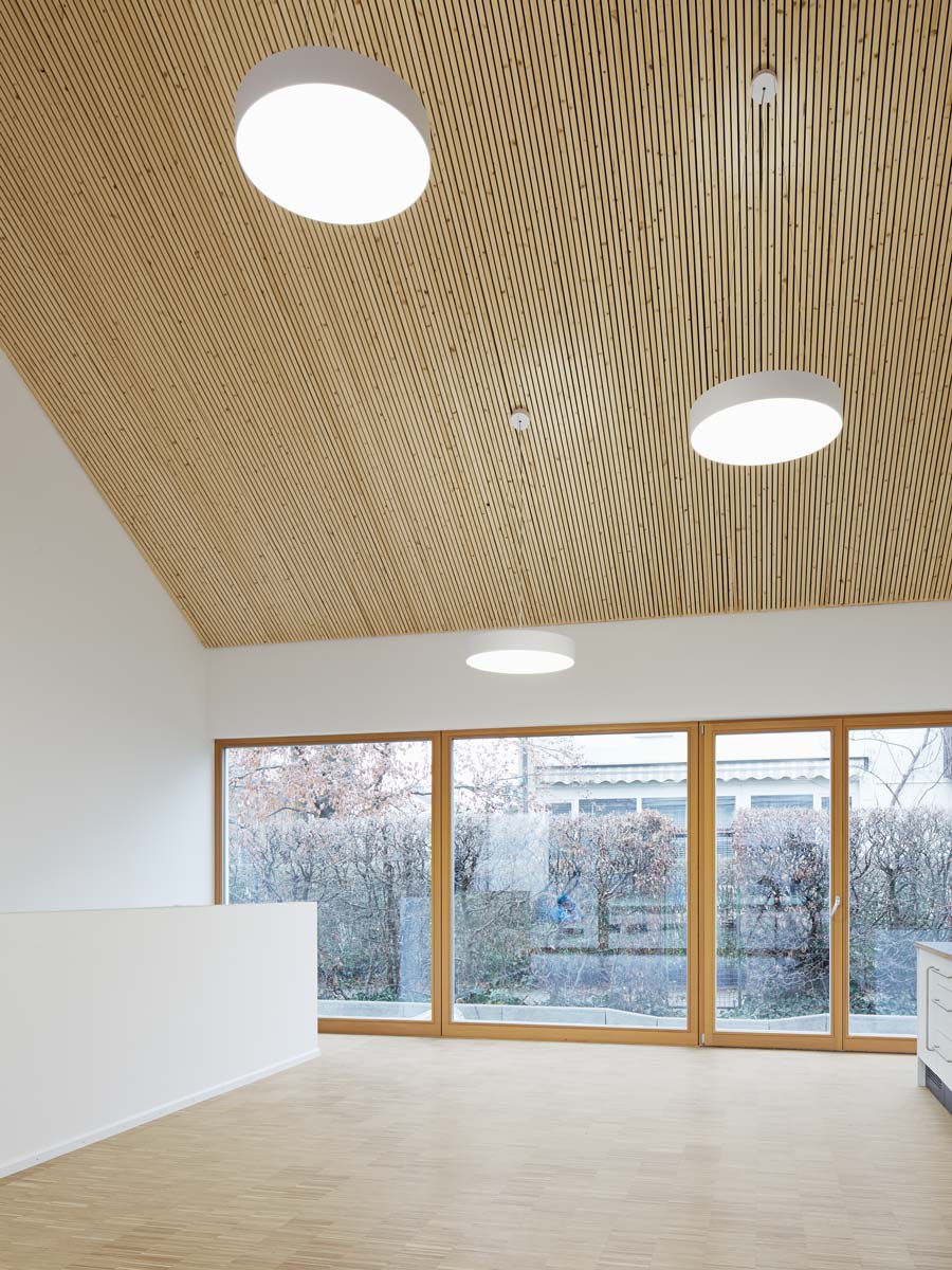 Der neue, dreigruppige Kindergarten entstand an der Stelle des alten und wurde mit dem Gemeindesaal so verknüpft, dass eine Nutzung des Saals durch die Kinder jederzeit möglich ist, ohne andere Bereiche des Gemeindehauses zu stören. Der bestehende Keller nimmt den Turn- und Werkraum auf und wird über eine neue Treppe direkt aus dem Foyer des Kindergartens erschlossen, bleibt aber gleichfalls vom Gemeindebereich aus zugänglich. Ein pavillonartiger Holzanbau nimmt die drei Gruppenräume auf und leitet über in den attraktiven, südlichen Garten, der den Kindern vorbehalten bleibt.