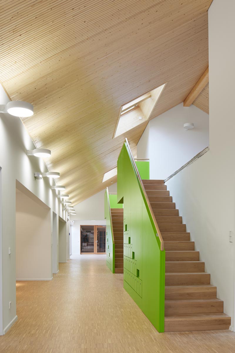 Der Kindergarten, der teilweise in Holzbauweise errichtet wurde, gliedert sich in drei fast identische Teilmodule mit vorgelagertem Gruppenbereich. Jedes Modul verfügt über ein grünes Treppenmöbel, das eine zweite Ebene zum Ausruhen, Schmökern oder Toben erschließt. Der große Foyerbereich wird zum Spielen, aber auch für Feste und Versammlungen benutzt. Er dient der internen Verknüpfung mit dem Gemeindesaal und kann bei Gemeindefesten und großen Veranstaltungen genutzt werden, ohne den Kindergarten offenhalten zu müssen.