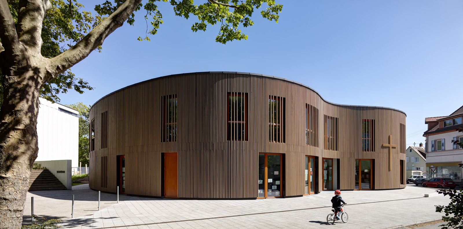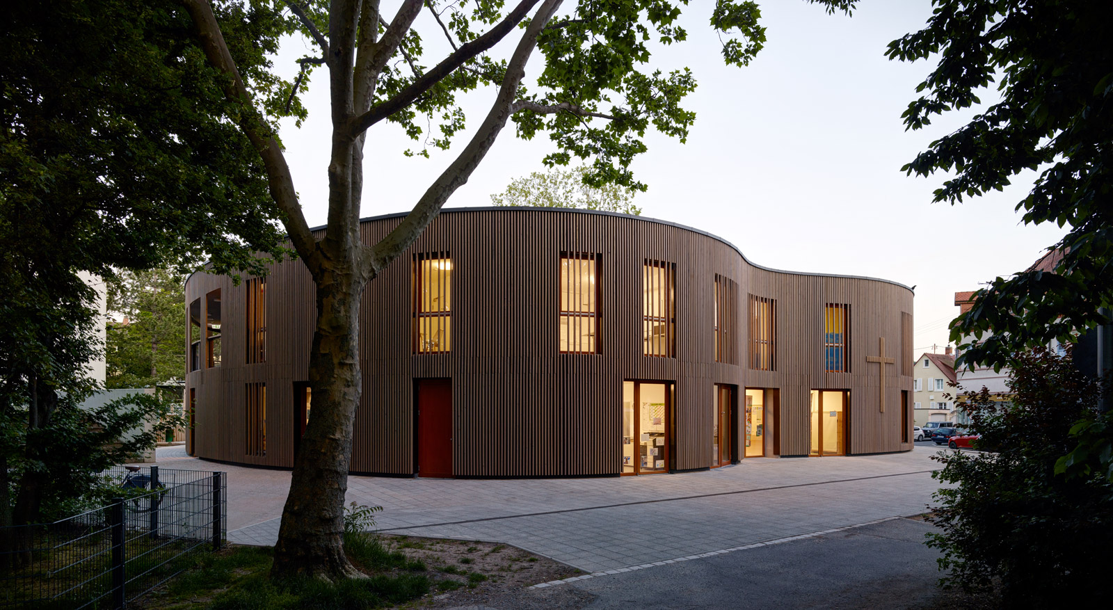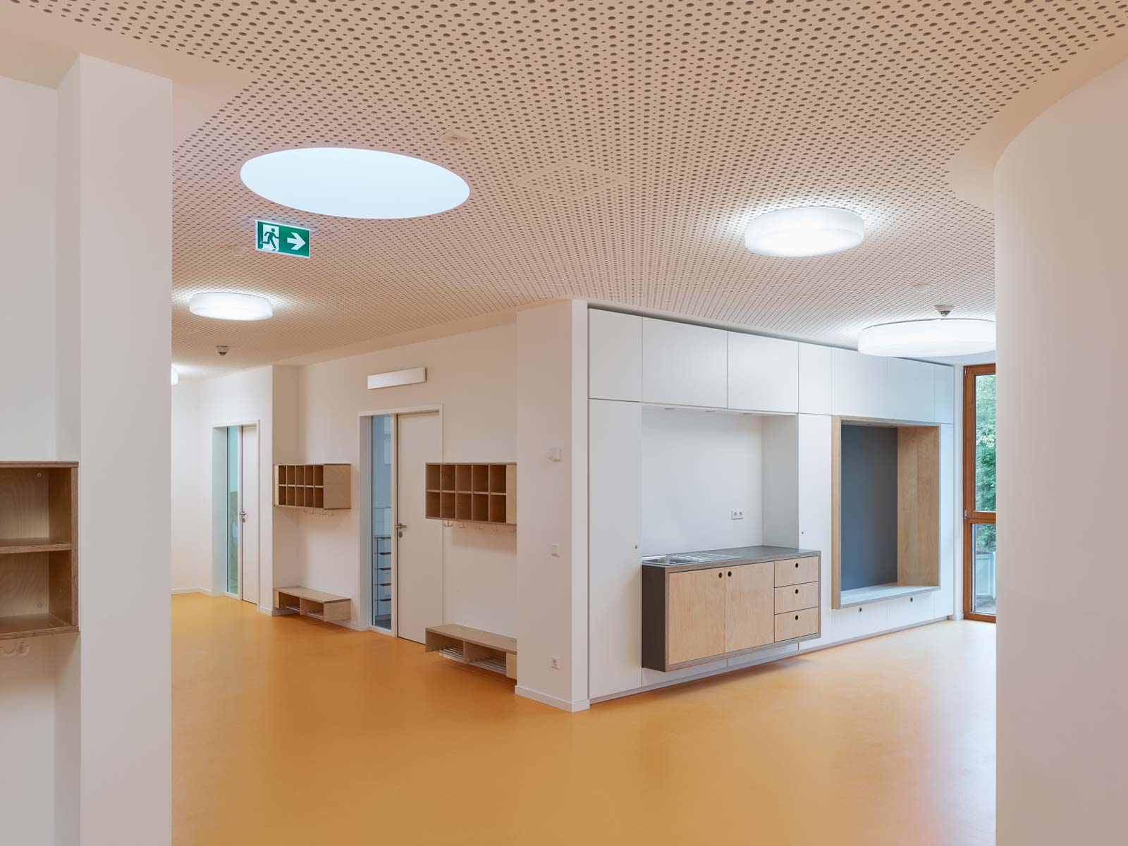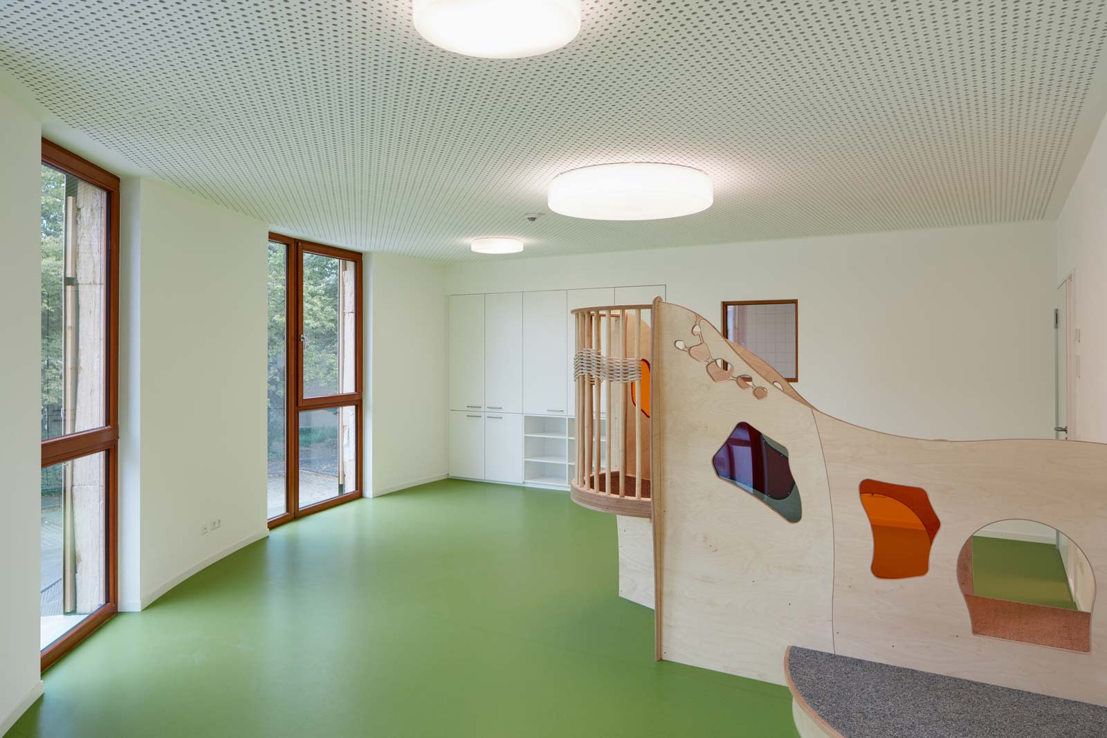 Die amöbenhafte Form des siebengruppigen Kinderhauses zeichnet die Wege zur Kirche nach und formuliert zugleich eine eindeutige Adresse. Darüberhinaus verbirgt die organische Formgebung das doch recht große Raumvolumen und ist geeignet, den Kindern ein leicht erinnerliches Gehäuse zu sein. Geschichten zur Entstehung von Form (die Gestalt einer Pfütze) und Fassade (das Spreizen der Finger vor den Augen) tragen maßgeblich zur Identifikation der kleinen Nutzer mit ihrem großen Haus bei. Darüber hinaus ist das Material Holz geeignet, den Kindern die Welt des Bauens und Konstruierens auf spielerische Weise nahezubringen.
