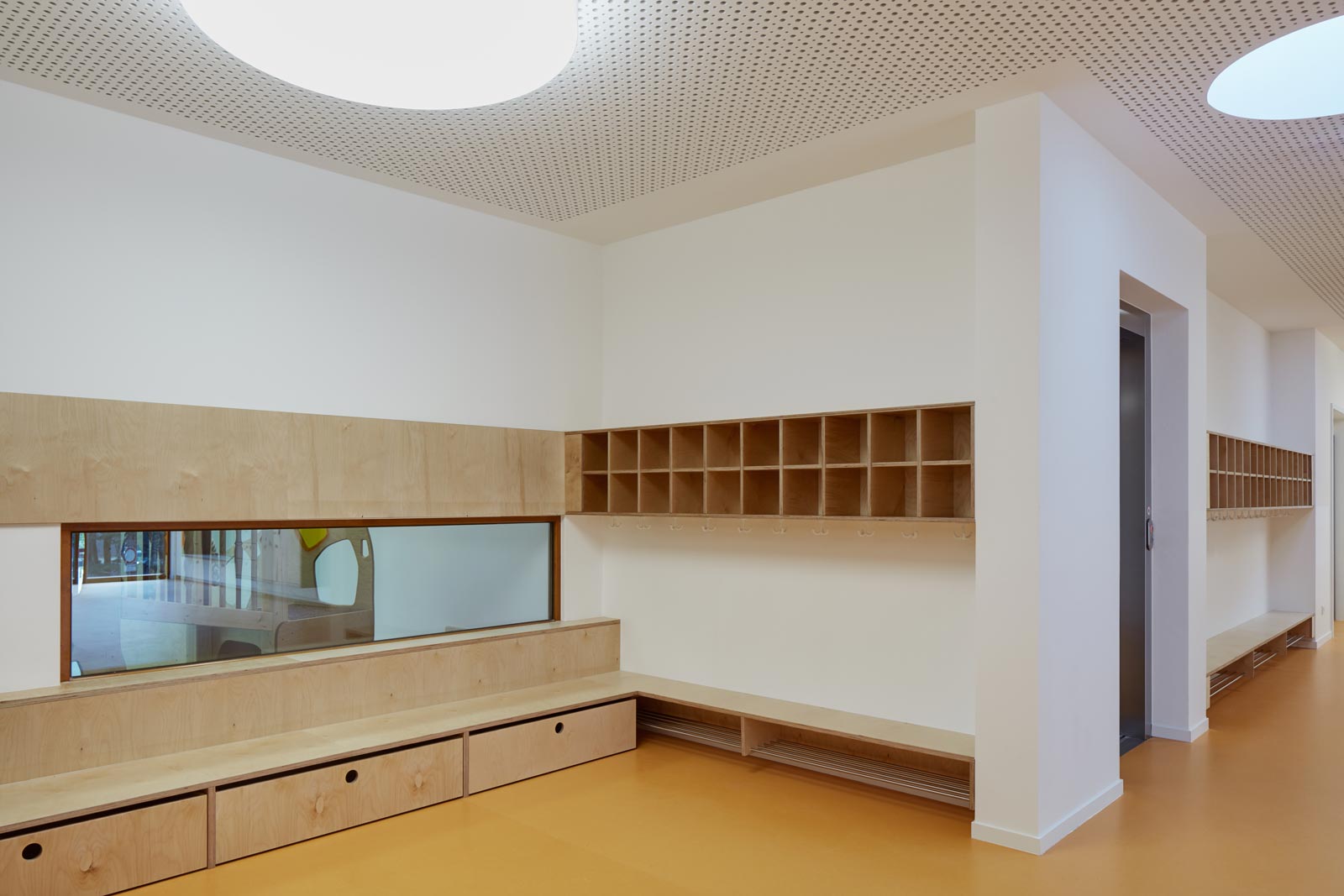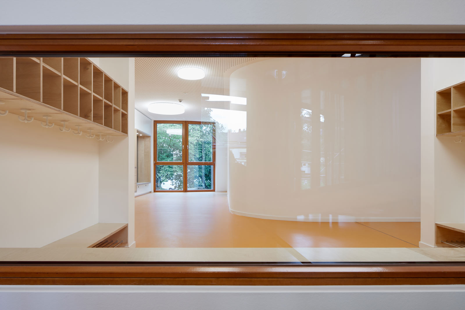 Die einfache Organisation des Gebäudes aus einer gemeinschaftlichen Mitte heraus erleichtert die Orientierung im Haus. Wie in der Stadt gibt es auch hier Straßen und Plätze, Wege und Pfade. Die oberen Gruppen- und Schlafräume erhalten ihren Zugang zum gemeinsamen Freiraum über einen außenliegenden Umgang mit eigener Treppe in den Garten. Trotz zahlreicher Umplanungen konnten der Grundgedanke des Entwurfs und das Konzept der inneren Erschließung über die lange Planungs- und Bauzeit erhalten werden.