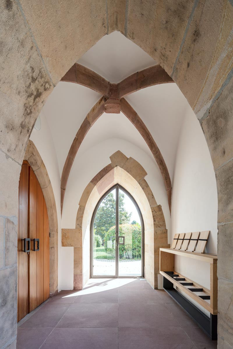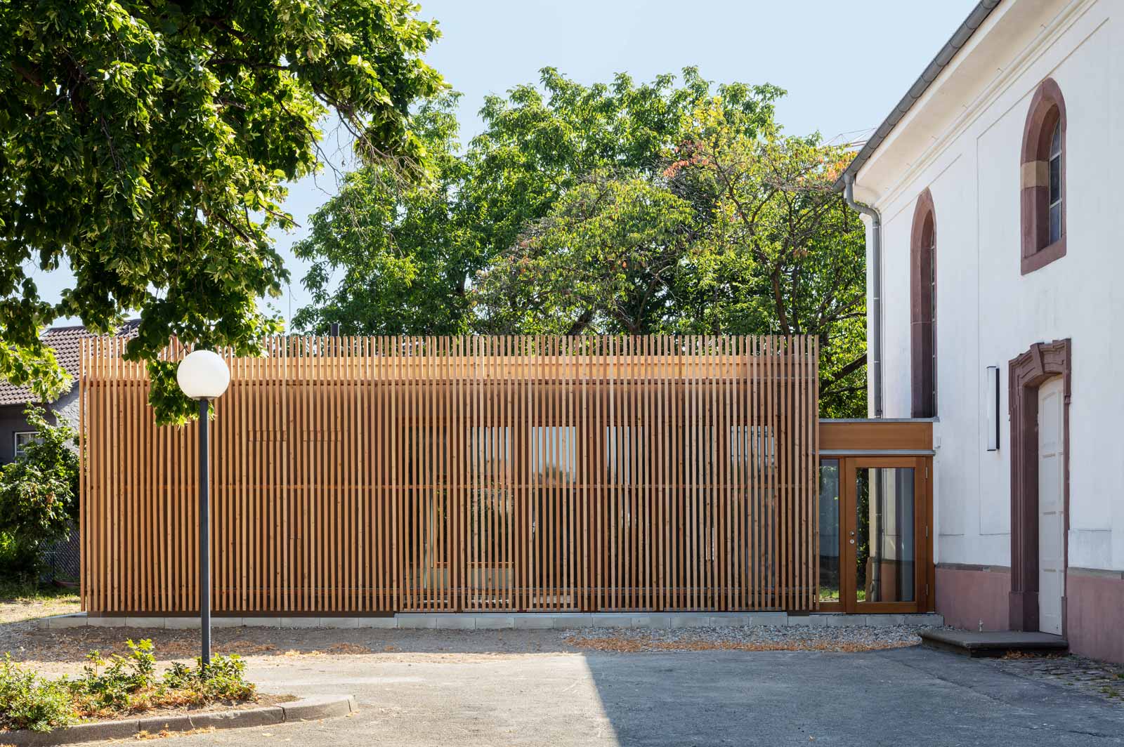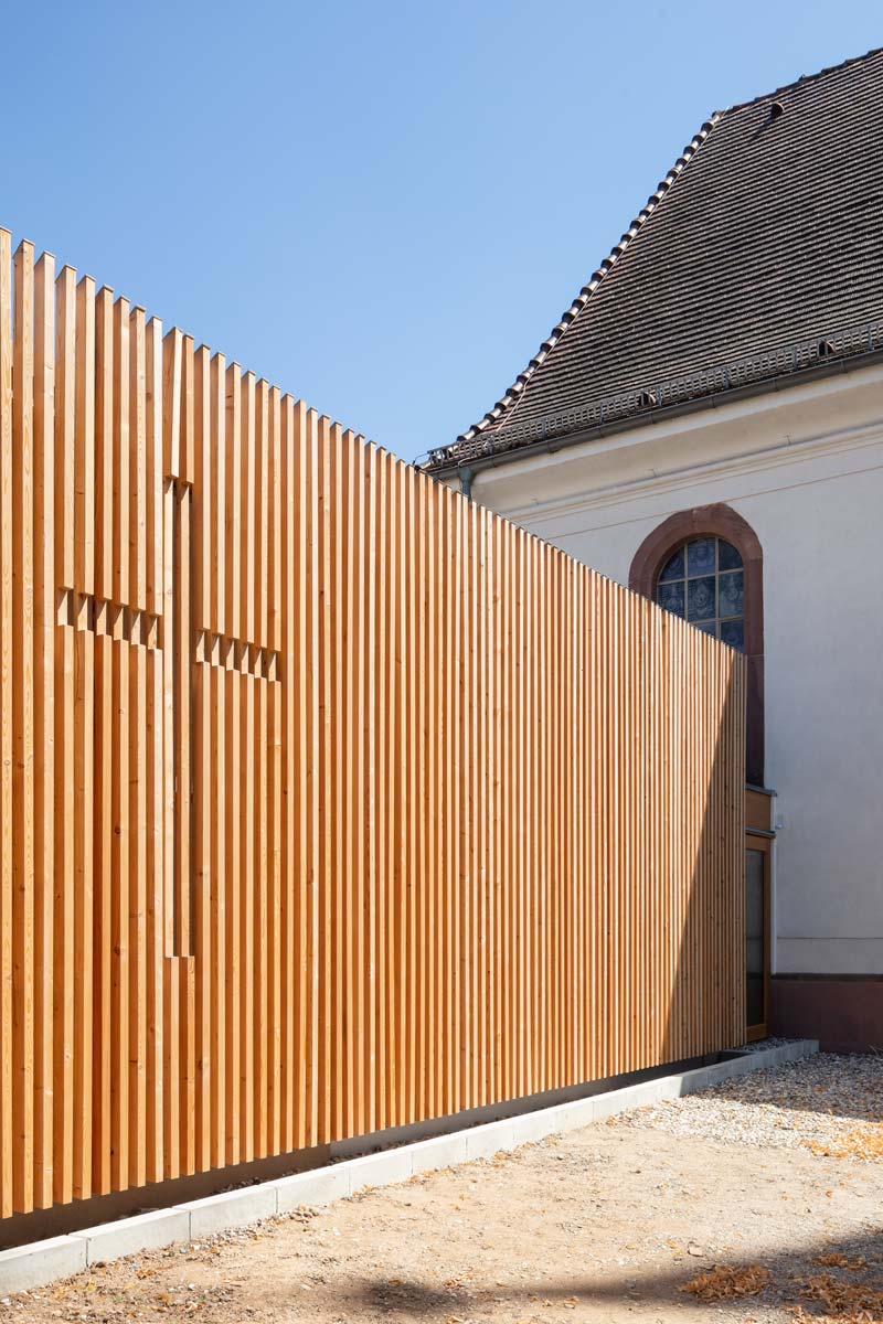 Der kleine Anbau, der die gewünschten Funktionen aufnimmt, zeigt sich zum Platz als semitransparente Holzlamellenstruktur und fungiert damit auch als neue Adresse der Kirchengemeinde. Die Lamellenstruktur taucht im Innenraum der Kirche als Deckenbekleidung wieder auf und nimmt dem Raum die übergroße Nüchternheit, die die Umgestaltung der sechziger Jahre ausstrahlt. Ihre farbliche Entsprechung findet die Decke in dem warmtonigen Jurakalkstein, mit dem der Boden der Kirche belegt wurde.