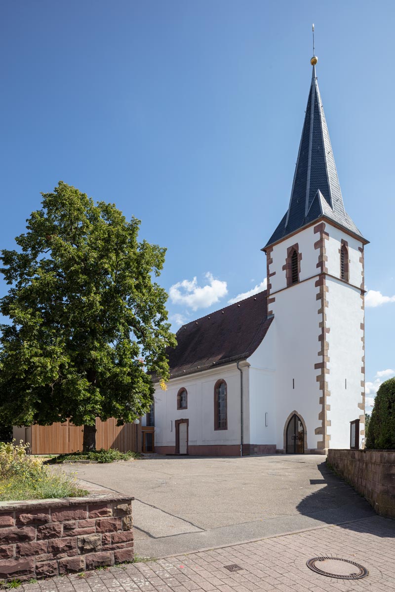 Die evangelische Kirche von Hochstetten bei Karlsruhe sollte einer durchgreifenden Sanierung unterzogen werden. Außerdem hatte der in den sechziger Jahren stark veränderte Bau eine Sakristei und eine behindertengerechte Toilette zu erhalten. Städtebaulich benutzen wir das erforderliche zusätzliche Raumvolumen, um dem kleinen Platz seitlich der Kirche eine Raumkante zu geben und optisch zu fassen. Zugleich sollte der Platz für Außenaktivitäten wie Gottesdientse im Freien eine ansprechende „Rückwand" erhalten.