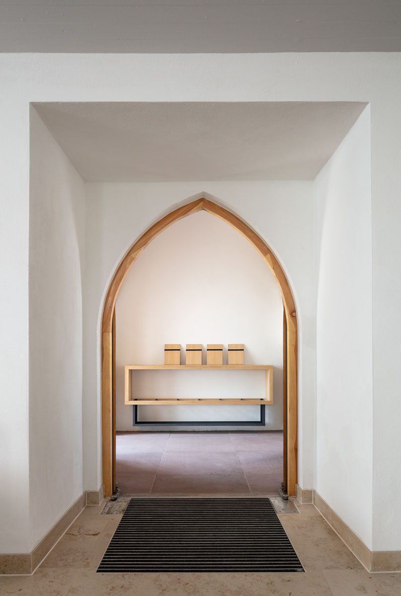 Wände, Empore und Bänke wurden weiß gefasst, um den lichtarmen Raum so hell wie möglich zu gestalten. Eine betont zurückhaltende Beleuchtung sorgt für unterschiedliche Lichtszenarien, ohne den kargen Raum zu dominieren. So strahlt der schlichte Kirchenraum nach der Sanierung eine zuvor ungekannte Heiterkeit und Frische aus.