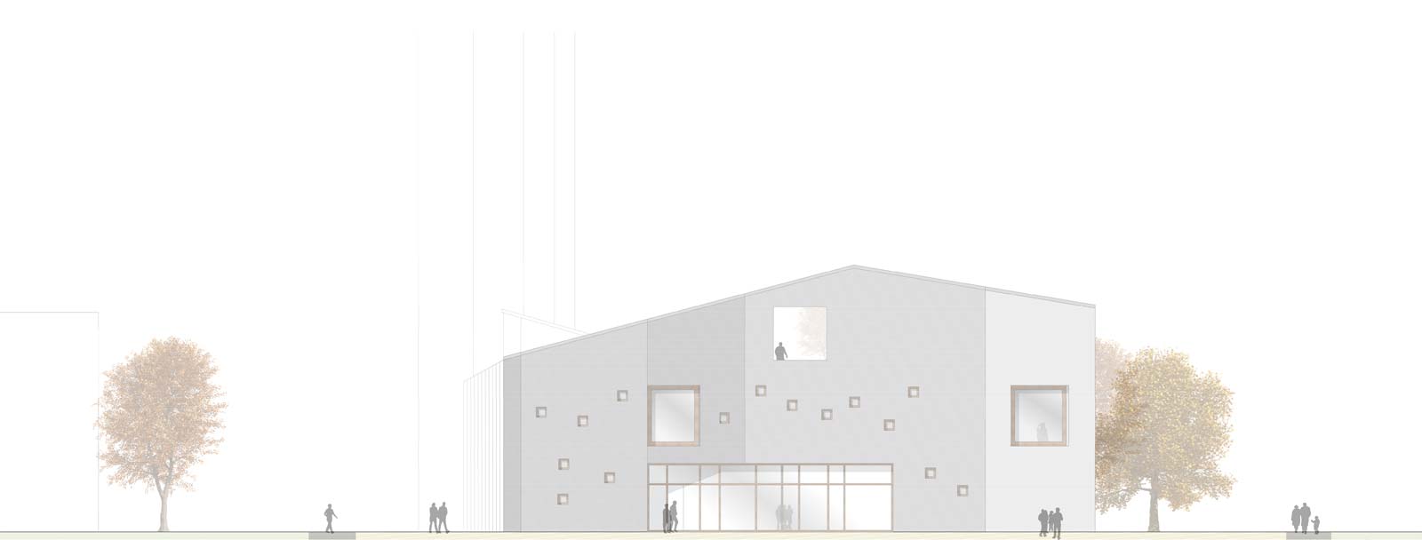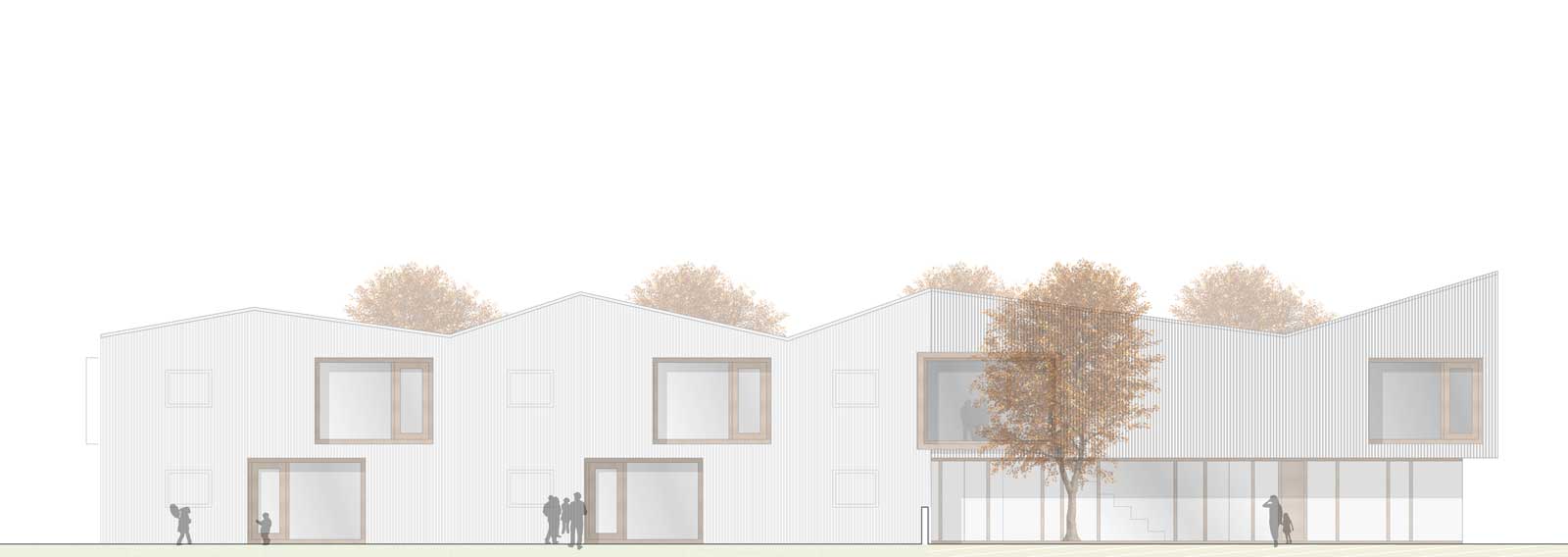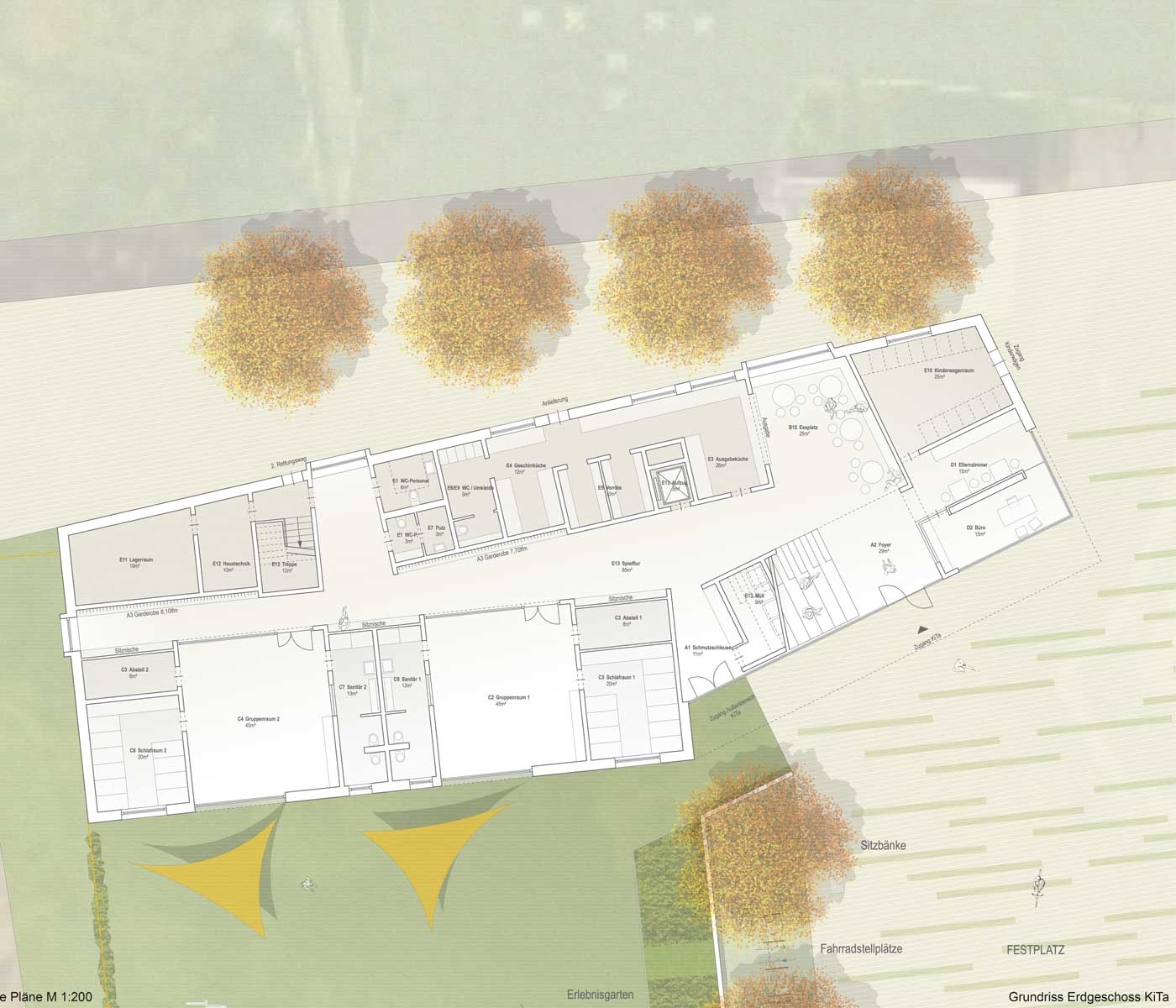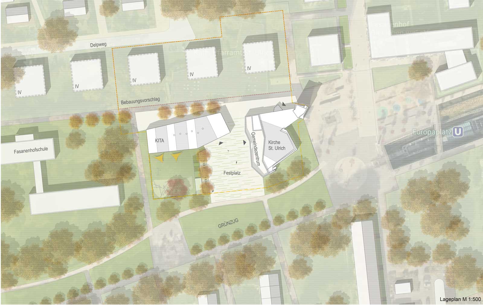 Mit dem Abbruch des bestehenden Gemeindezentrums St.Ulrich bietet sich die Möglichkeit einer konsequenten städtebaulichen Weiterentwicklung des Planungsgebietes. In der Abfolge aus Fasanenschule, Kita, Kirche mit Gemeindezentrum und Festplatz bildet das neue Ensemble den städtebaulichen Abschluss des Bildungsbandes entlang des übergeordneten Grünzuges. Alle Eingänge liegen am Festplatz, der sich zwischen Kindertagesstätte und Gemeindezentrum St. Ulrich aufspannt. Dem aufragenden, zeltartigen Kirchenraum wird ein niedriger, linearer Baukörper für die Kita an die Seite gestellt, was dem ursprünglichen Konzept der Architekten entspricht.