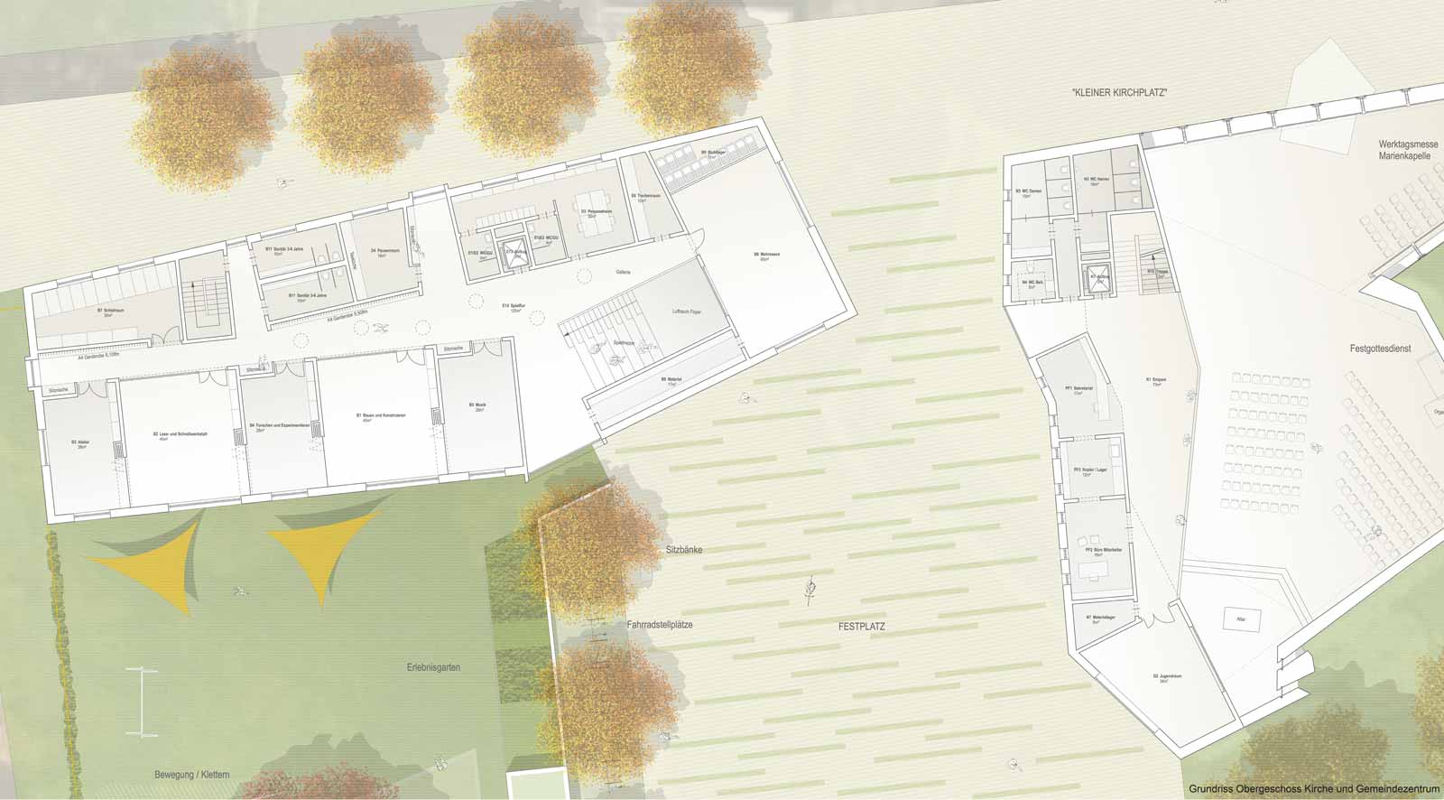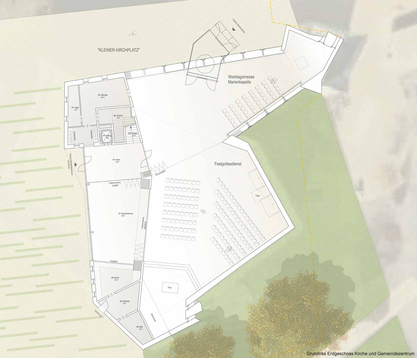 An die verkleinerte Kirche dockt der einer raumhaltigen Wand gleiche Köper des Gemeindezentrums an. Der skulpturale Charakter des Körpers trägt der polygonalen Formensprache der Kirche Rechnung und erlaubt die Verknüpfung von sakralem Kirchenraum mit Funktionalbereichen wie Pfarrbüro, Gemeindesaal oder Jugendraum. Die vielfältige Teilbarkeit des Gemeindezentrums, wie auch des Kirchenraumes ermöglichen eine flexible Zusammenschaltbarkeit der Raumteile für Festtagsgottesdienste, Wektagsgottesdienste und Kinderkiche, ohne von anderen Nutzungen beeinträchtigt zu werden.