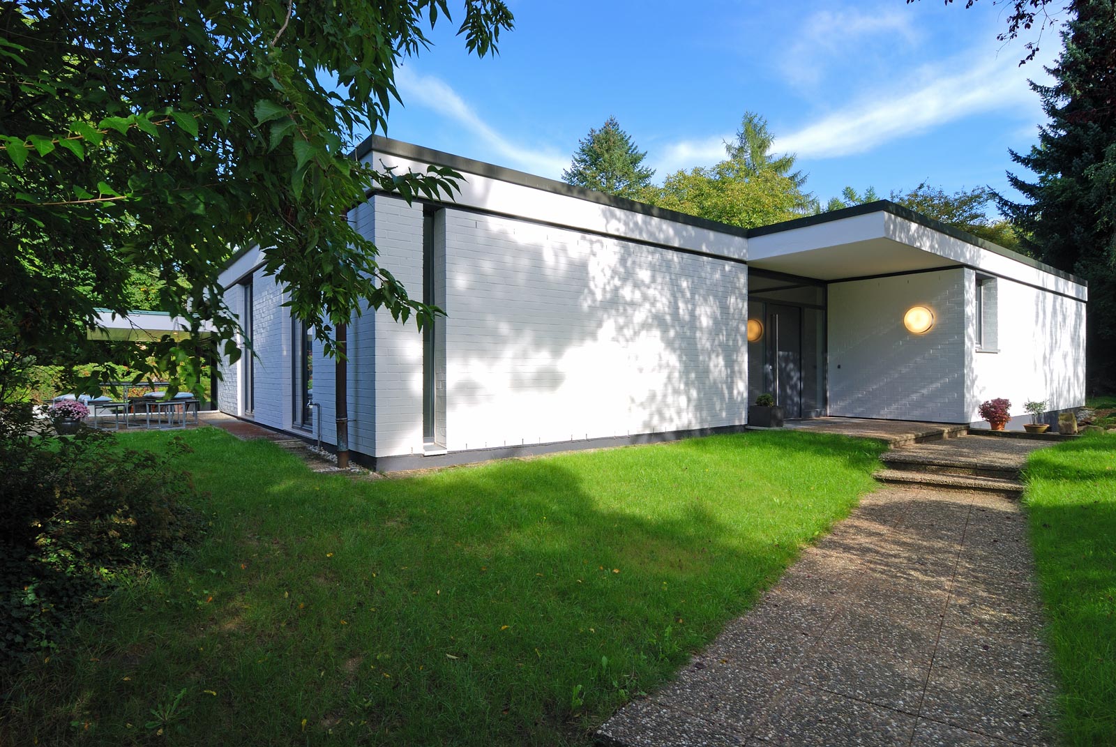 Natürlich wurden auch sämtliche Oberflächen erneuert, dazu alle Installationen. Dennoch wurde darauf geachtet, den Charakter des Hauses nicht allzusehr zu verändern. So blieben im Bad die schönen originalen blauen Wandfliesen, die Raumzuschnitte wurden nicht verändert, selbst Einbauschränke bleiben erhalten. Der Versuchung, die energetisch veraltete Klinkerfassade mit einem Vollwärmeschutzsystem aufzurüsten, wurde ebenfalls widerstanden - dafür strahlt sie nun in weiss und macht auch nach aussen deutlich, dass sich einiges getan hat im Innern.