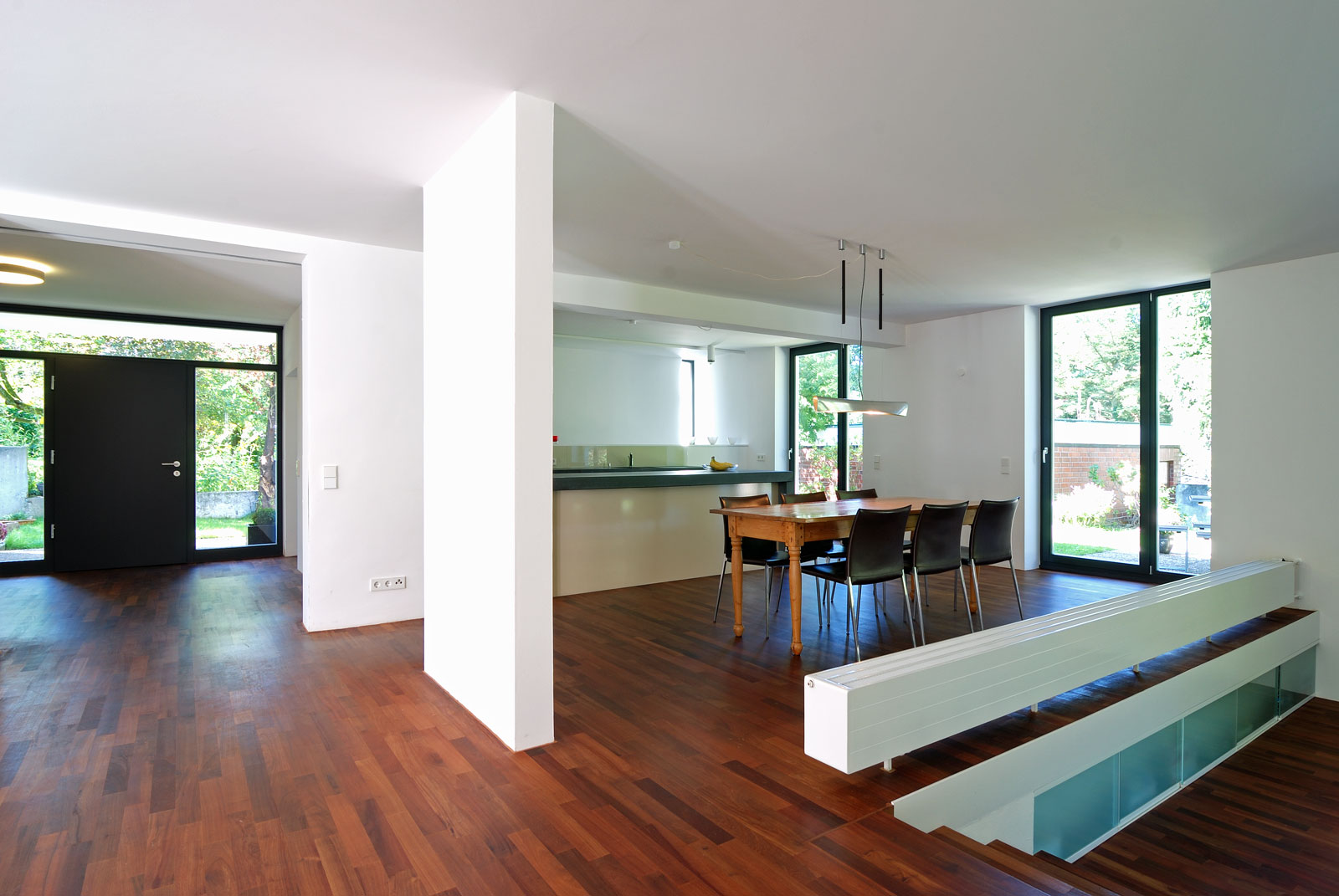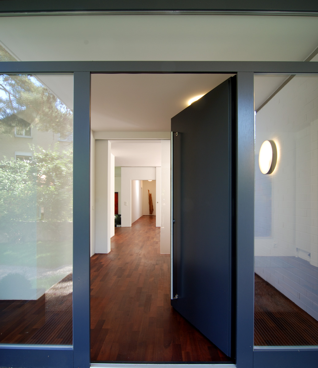 Die Fenster dagegen mussten schon aus energetischen Gesichtspunkten erneuert werden. Dunkelgraue Holzfenster mit großen Öffnungen, Schiebe- und Drehflügeln geben dem Haus eine unaufdringlich-elegante Note. Die Kühle der Raumschale wird durch den Eichenholzboden gemildert.