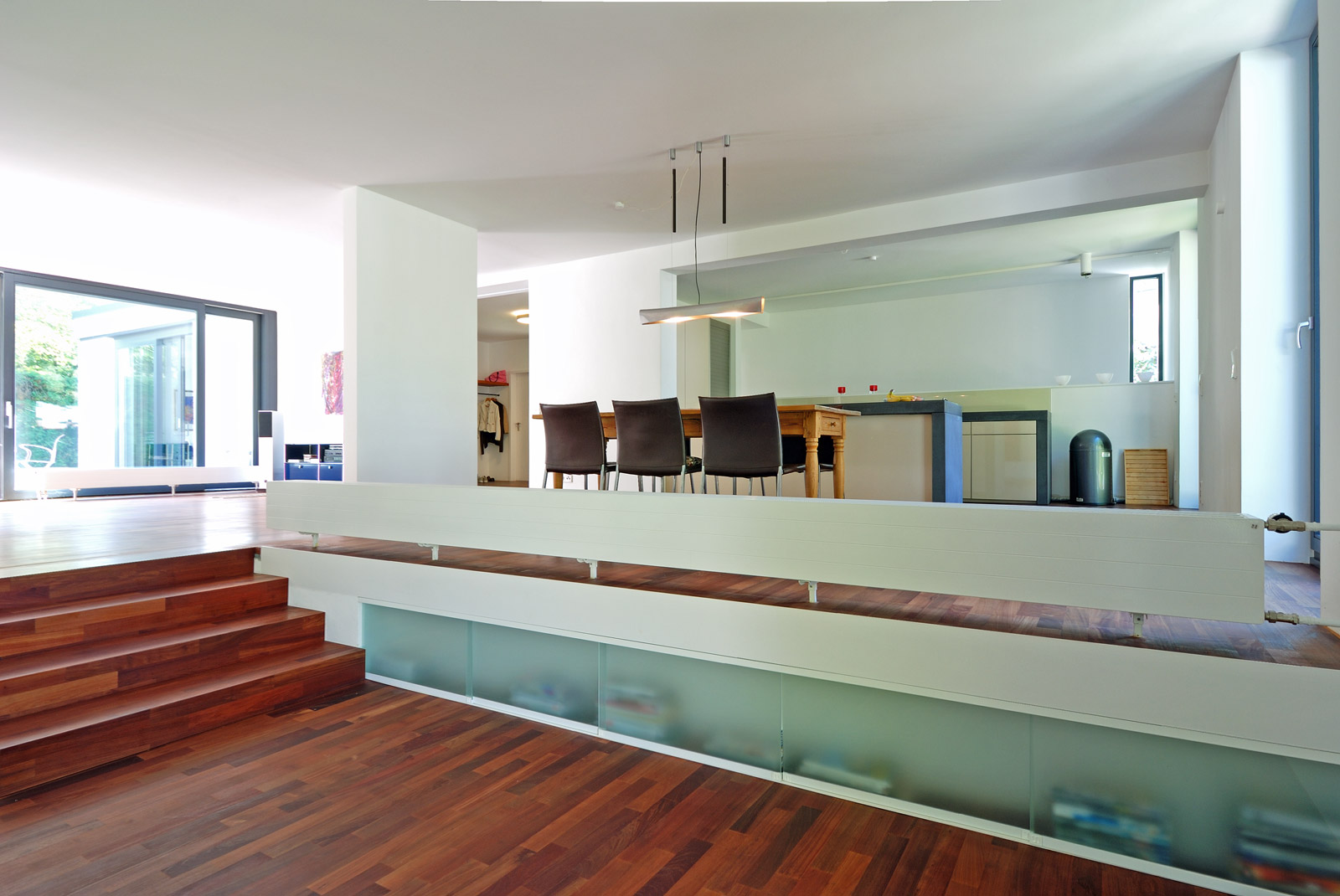 So wurden an allen Fenstern die Brüstungen entfernt, um eine stärkere Verzahnung der Innenräume mit dem Garten zu erreichen; die ehemals separierte Kochküche wich einer großzügig zum Essplatz geöffneten Wohnküche; das vollständig abgeschlossene Untergeschoss wurde über die Herausnahme der Treppenwand an den Raumfluss des Erdgeschosses angebunden. Gerade der letztere Eingriff veränderte den innenräumlichen Charakter des Hauses deutlich.