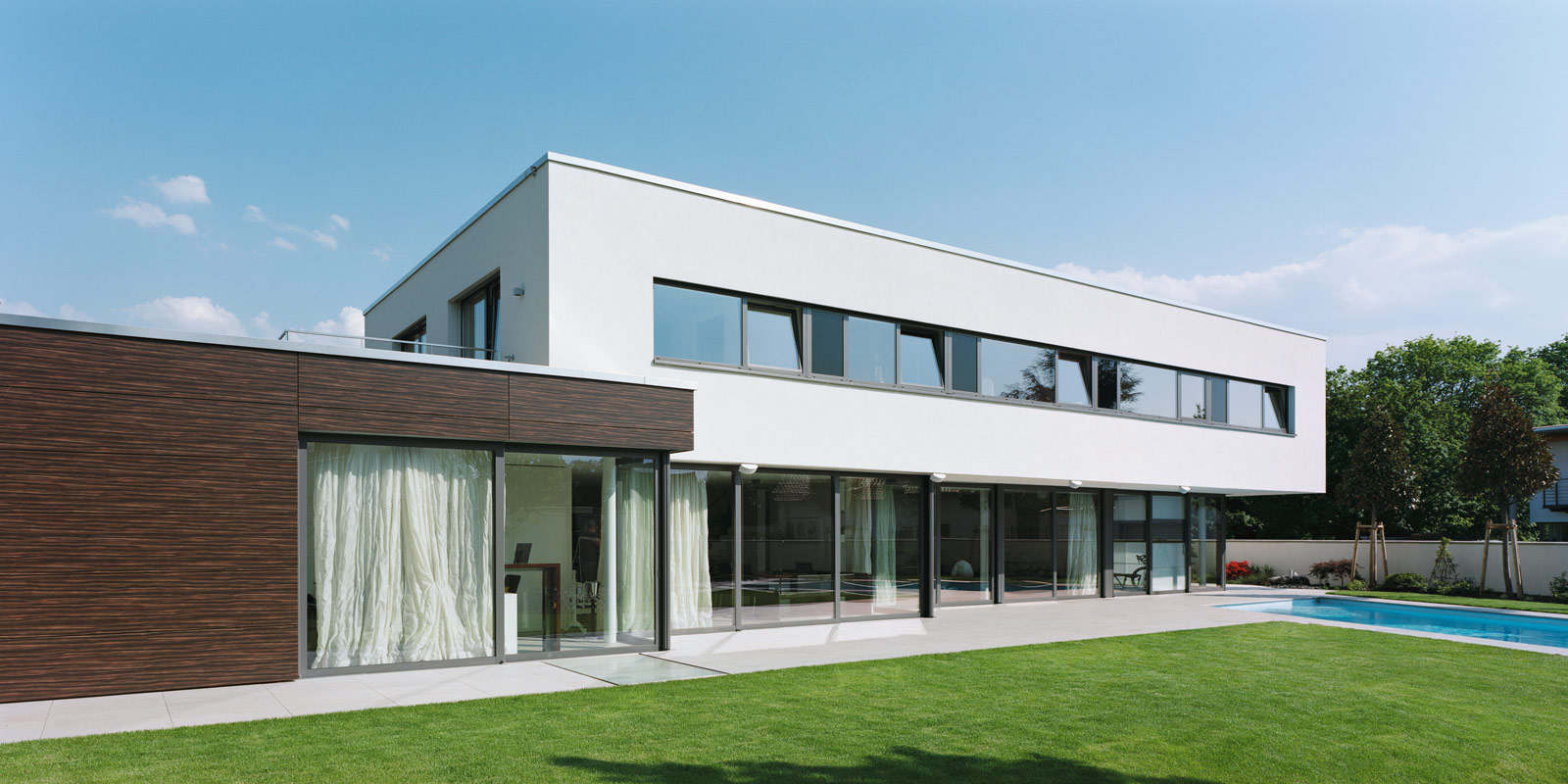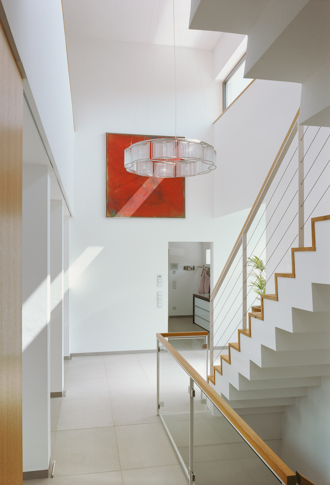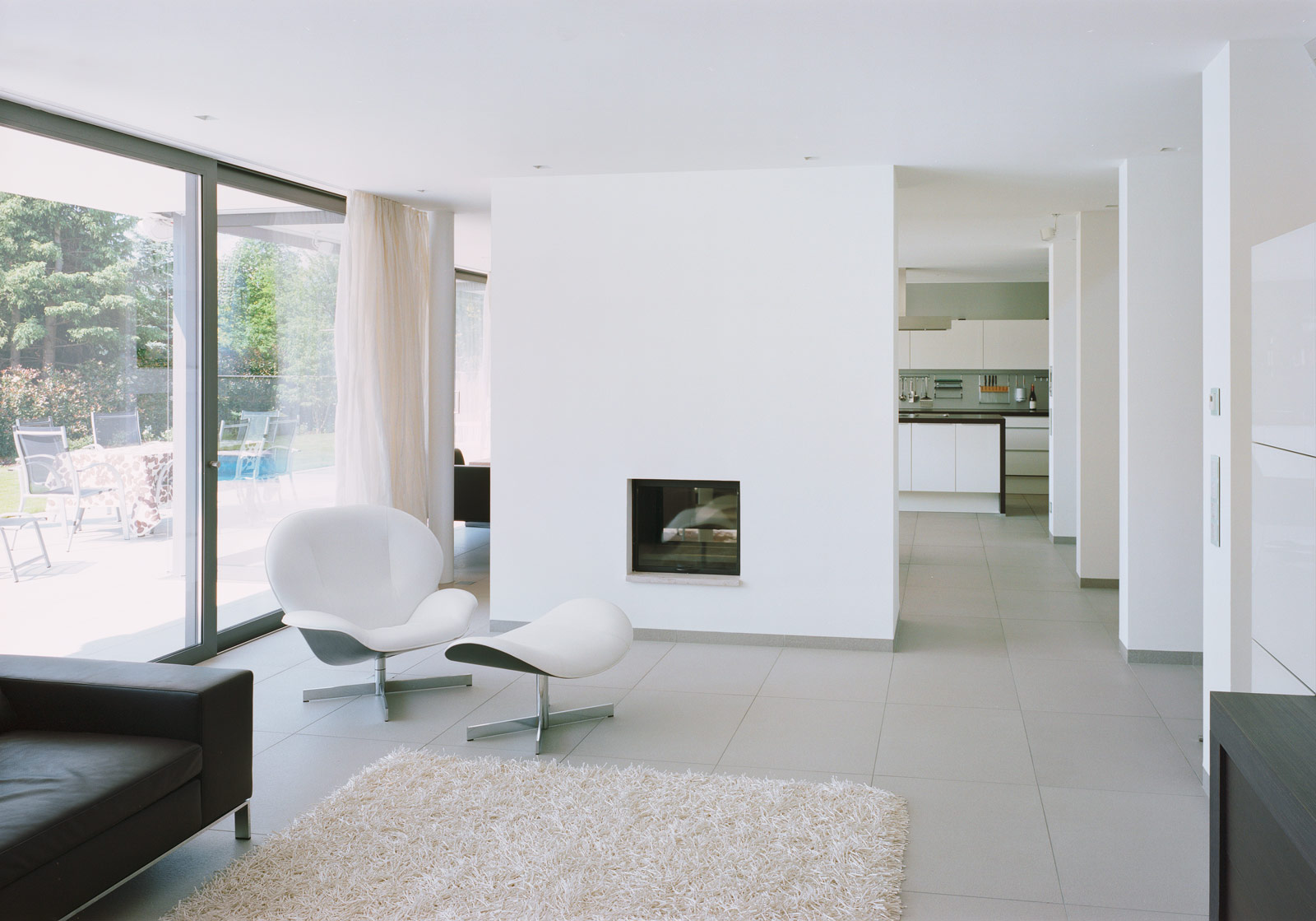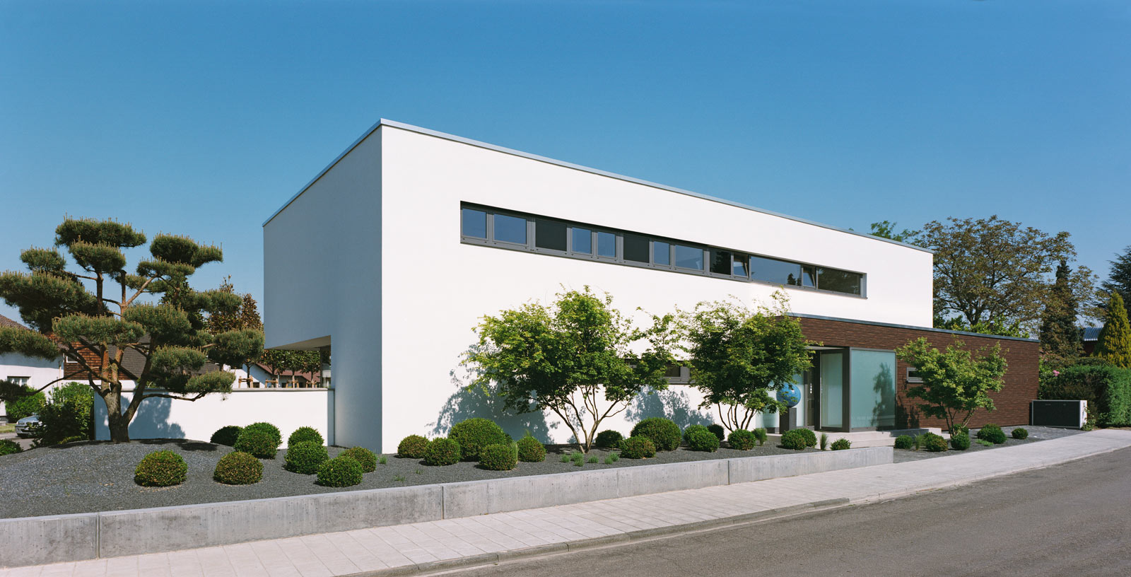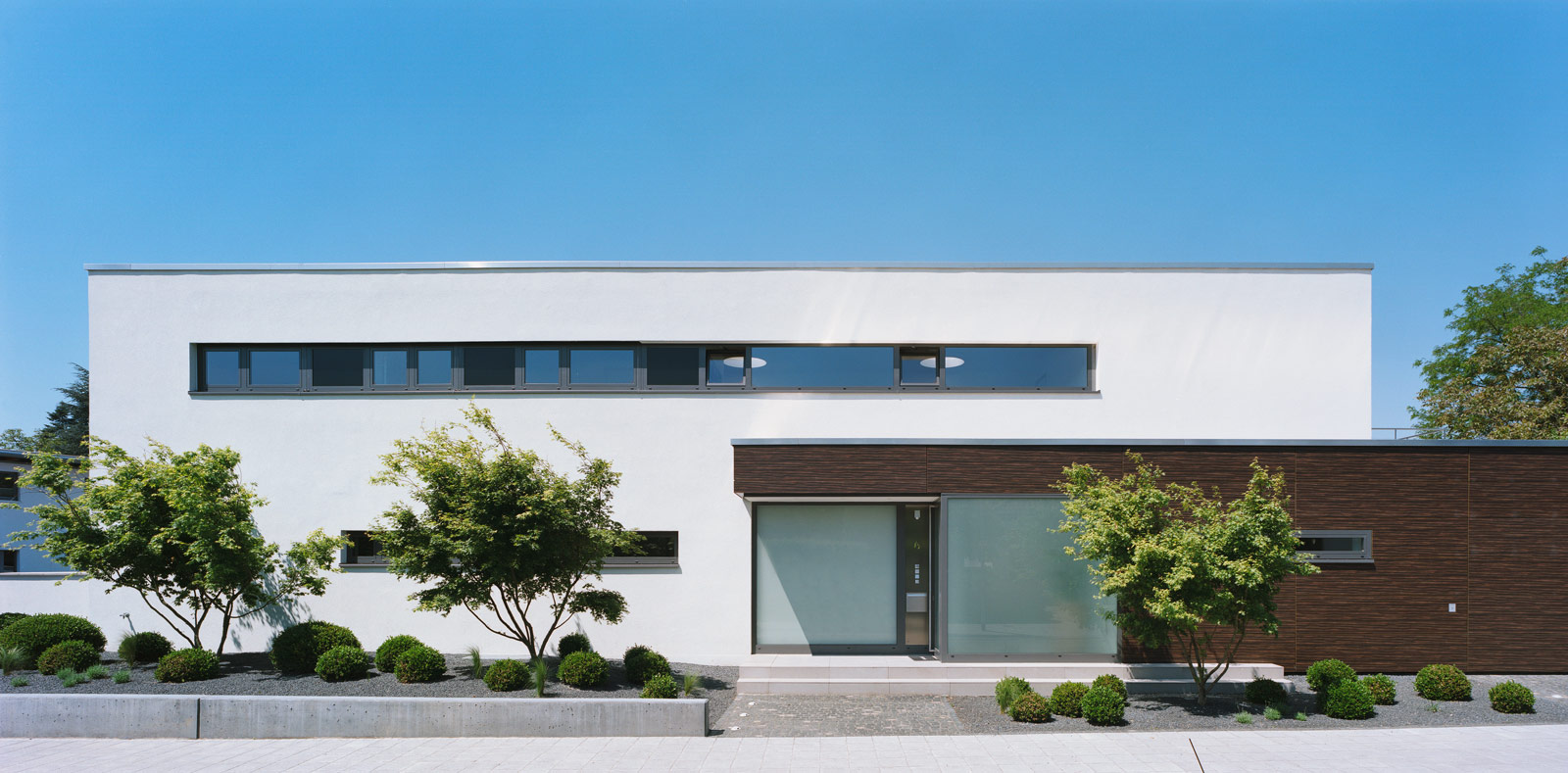 Die klare, minimiert-kubische Bauform signalisiert zur Straße hin Abgeschlossenheit, zum Garten hin weicht sie einem hohen Maß an Transparenz und Offenheit. Der feinkörnige, strahlend weiße Putz nimmt Bezug auf die Bauten der näheren Umgebung. Beheizt wird das Gebäude über eine Fußbodenheizung, die mit Erdwärme versorgt wird.