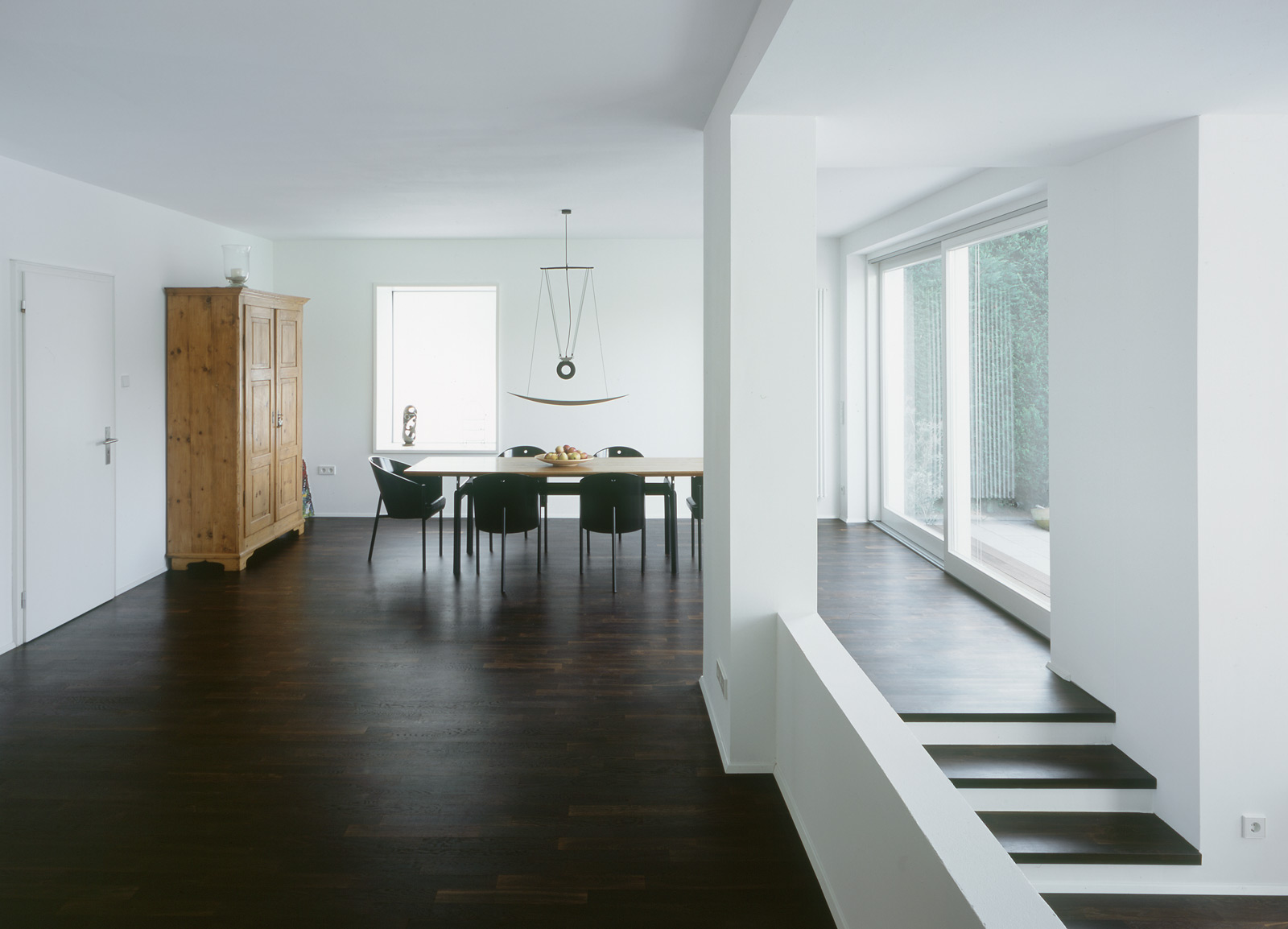 Das ehemalige Wohnzimmer ist nunmehr Durchgangsraum, denn der gartenseitige Anbau, anstelle der alten Terrasse, bildet - ein paar Stufen tiefer und damit deutlich abgesetzt - den neuen Wohnbereich aus. Dessen Erschließung über den Essbereich und eine nicht sofort sichtbare Treppe verleiht dem oberen, dem Fernsehen vorbehaltenen Raum eine galerieartige Atmosphäre. Auch das unterstützt die angestrebte "Großzügigkeit im Kleinen".