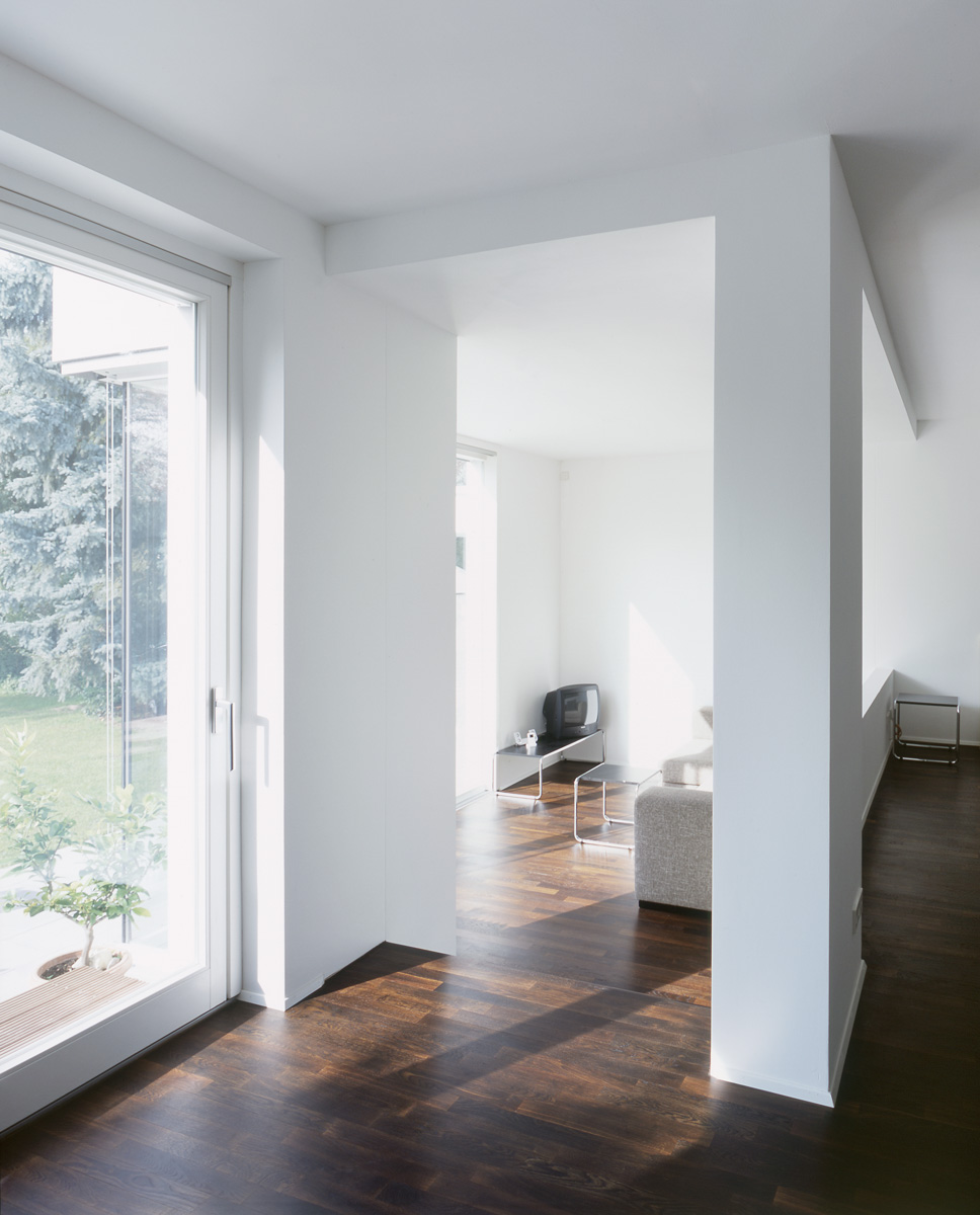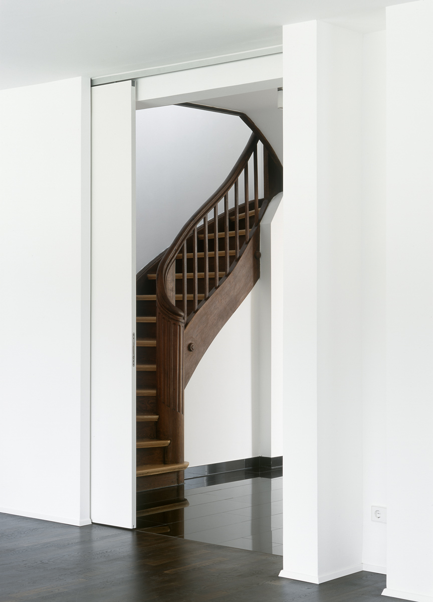 Passiert man die Lärchenholztür, durchschreitet man den Treppenraum und erlebt die einzelnen Raumschichten in gestaffelter Form, was dem kleinen Haus eine überraschende Großzügigkeit gibt. Wo früher die Gästetoilette mit Garderobe jede räumliche Entwicklung unmöglich machte, sorgt jetzt ein leerer Raum für Weite und bildet das Zentrum des Hauses. Die alte, geschwungene Holztreppe erfährt eine späte Würdigung, und auch der (ebenfalls belassene) Kellerabgang fügt sich ganz selbstverständlich in den neuen Kontext ein. Toilette und Garderobe sind im Windfang-Kubus verborgen, die Küche ist über eine Glastür abgetrennt.
