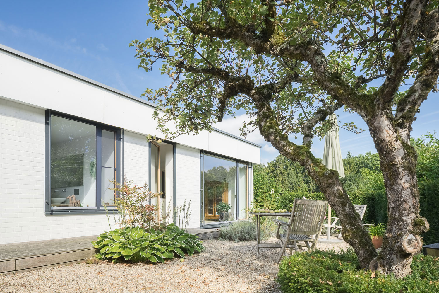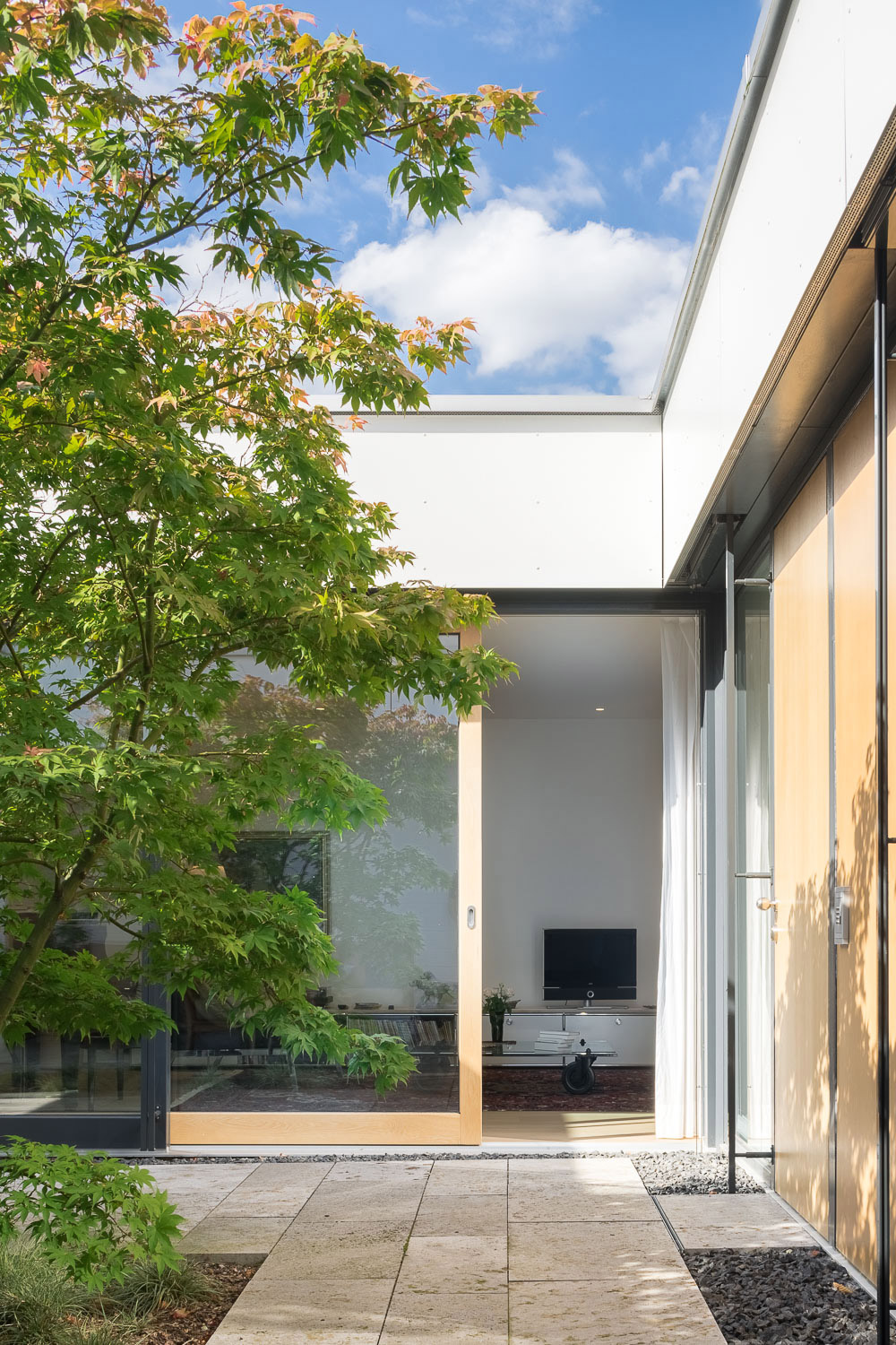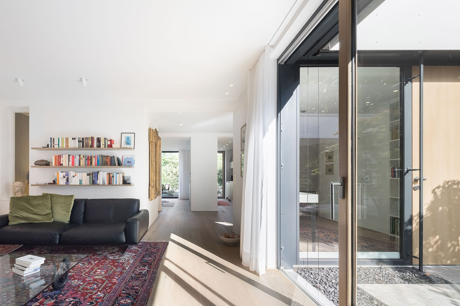 Ein Haus tanzt aus der Reihe. So könnte man die Sanierung des Kettenhofhauses aus den 70er Jahren in der Karlsruher Bergwaldsiedlung kurz und prägnant umschreiben. Durch die veränderte Verkleidung der Attika mit weißen Schichtplatten anstatt der vormals schwarz gestrichenen Holzschalung erhält das Dach eine wohltuende Leichtigkeit. Allein dadurch hebt sich das Haus ohne Mühe von seinen beiden Nachbarn ab, deren dunkle holzverkleidete Attika immer noch schwer auf ihnen lastet. Das für die Zeit so typische weiß gestrichenen einschalige Sichtmauerwerk konnte erhalten werden und musste dank der Dämmmaßnahmen im Dachbereich und der neuen sehr gut isolierten Fenster nicht hinter einem Dämmpaket verschwinden. Die „echte" Materialität des Mauerwerks prägt weiterhin die äußere Gestalt des Hauses. Im Innern wurde durch wohlgesetzte Durchbrüche und dem Entfall einiger Trennwände eine Großzügigkeit geschaffen, die man dem kleinen Hofhaus von außen nicht zutraut. Unterstützt wird die großzügige Wirkung durch große Verglasungen und Glasschiebetüren, die den Innenhof zumindest optisch zum Innenraum machen.
