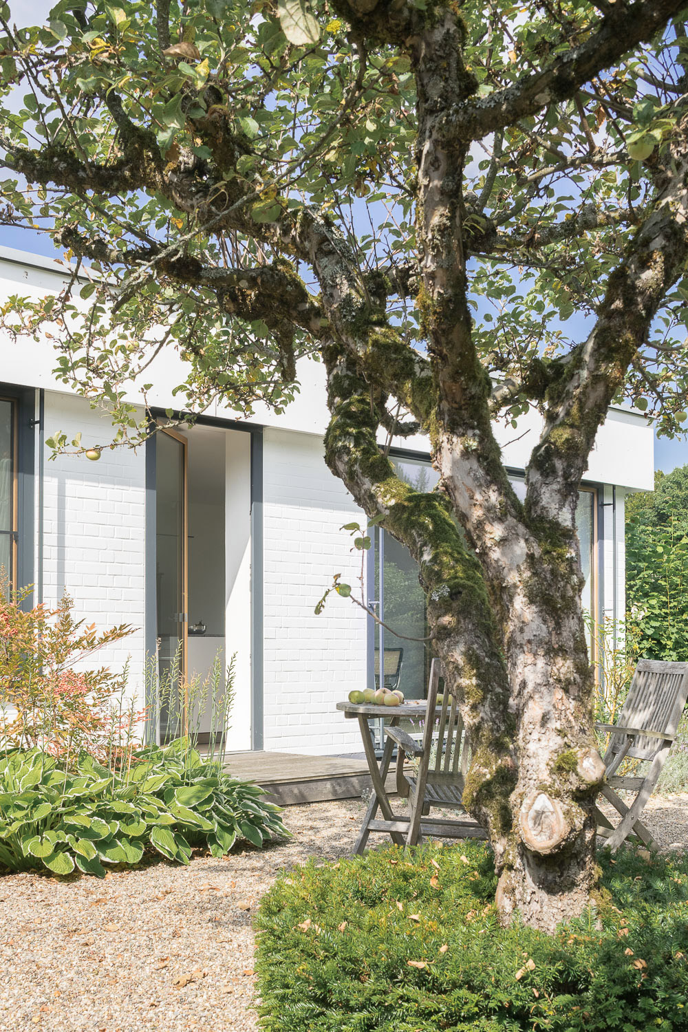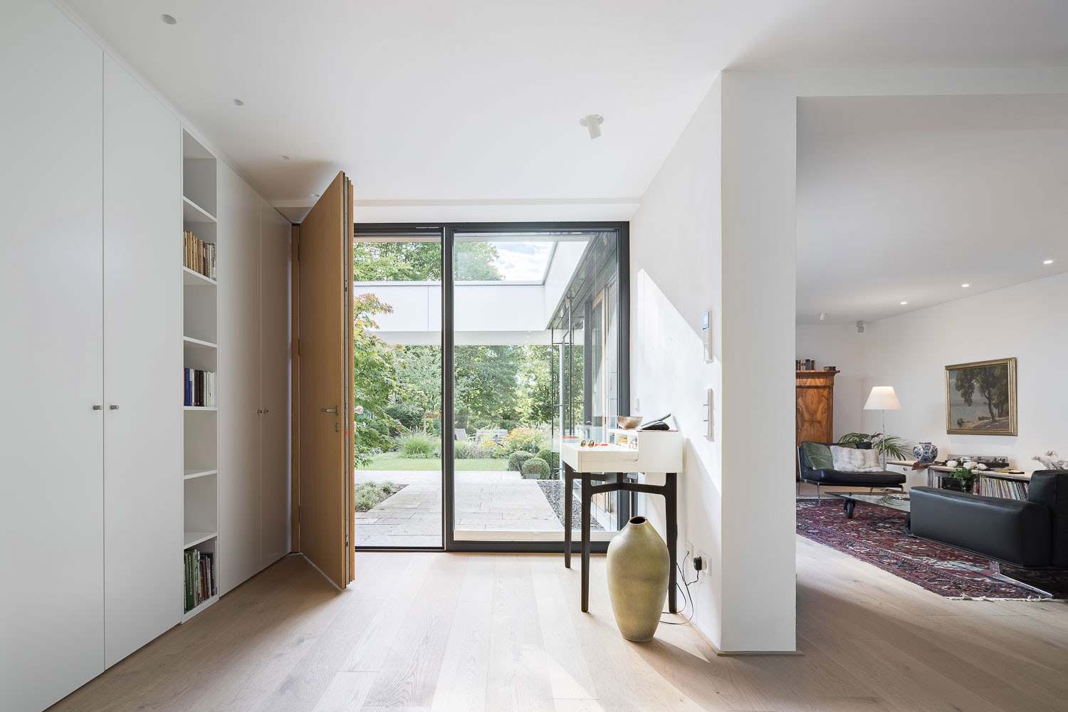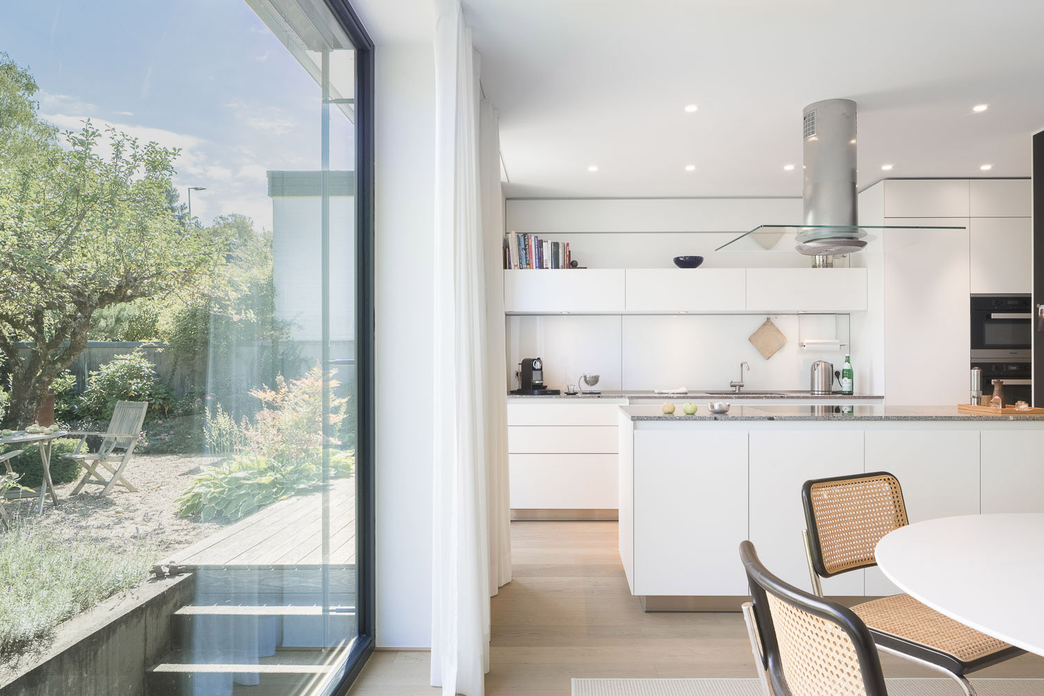 Ein Haus tanzt aus der Reihe. So könnte man die Sanierung des Kettenhofhauses aus den 70er Jahren in der Karlsruher Bergwaldsiedlung kurz und prägnant umschreiben. Durch die veränderte Verkleidung der Attika mit weißen Schichtplatten anstatt der vormals schwarz gestrichenen Holzschalung erhält das Dach eine wohltuende Leichtigkeit. Allein dadurch hebt sich das Haus ohne Mühe von seinen beiden Nachbarn ab, deren dunkle holzverkleidete Attika immer noch schwer auf ihnen lastet. Das für die Zeit so typische weiß gestrichenen einschalige Sichtmauerwerk konnte erhalten werden und musste dank der Dämmmaßnahmen im Dachbereich und der neuen sehr gut isolierten Fenster nicht hinter einem Dämmpaket verschwinden. Die „echte" Materialität des Mauerwerks prägt weiterhin die äußere Gestalt des Hauses. Im Innern wurde durch wohlgesetzte Durchbrüche und dem Entfall einiger Trennwände eine Großzügigkeit geschaffen, die man dem kleinen Hofhaus von außen nicht zutraut. Unterstützt wird die großzügige Wirkung durch große Verglasungen und Glasschiebetüren, die den Innenhof zumindest optisch zum Innenraum machen.